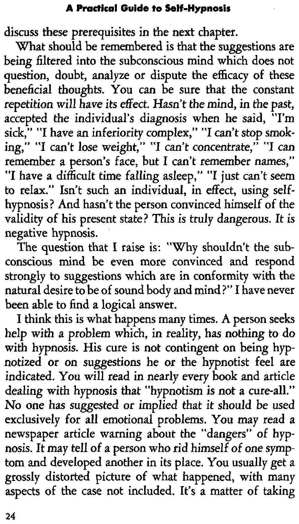 What should be remembered is that the suggestions are being filtered into the subconscious mind which does not question, doubt, analyze or dispute the efficacy of these beneficial thoughts. You can be sure that the constant repetition will have its effect. Hasn't the mind, in the past, accepted the individual's diagnosis when he said, "I'm sick," "I have an inferiority complex," "I can't stop smoking," "I can't lose weight," "I can't concentrate," "I can remember a person's face, but I can't remember names," "I have a difficult time falling asleep," "I just can't seem to relax." Isn't such an individual, in effect, using self-hypnosis? And hasn't the person convinced himself of the validity of his present state? This is truly dangerous. It is negative hypnosis.