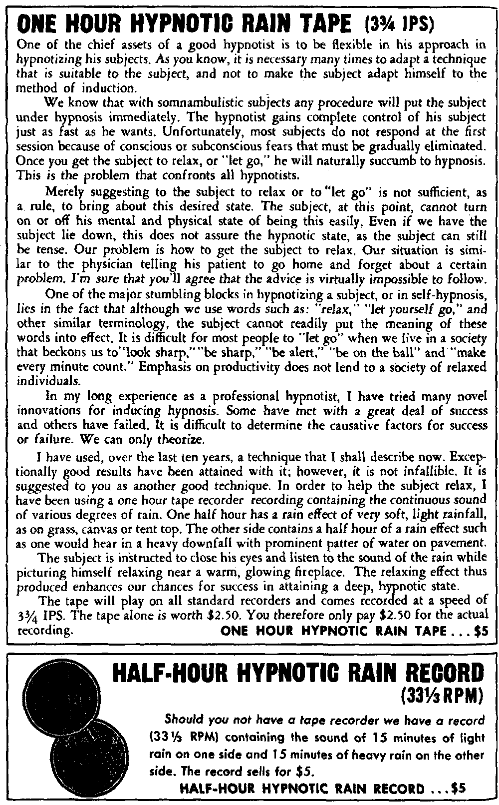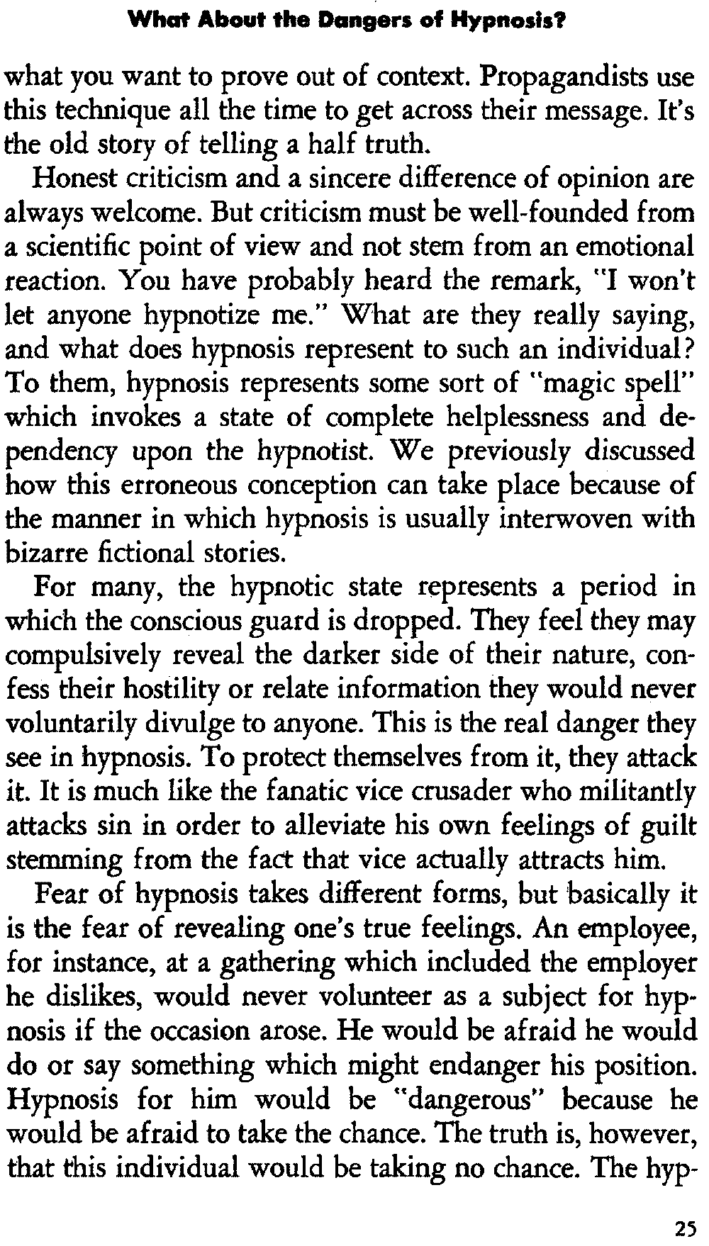I think this is what happens many times. A person seeks help with a problem which, in reality, has nothing to do with hypnosis. His cure is not contingent on being hypnotized or on suggestions he or the hypnotist feel are indicated. You will read in nearly every book and article dealing with hypnosis that "hypnotism is not a cure-all." No one has suggested or implied that it should be used exclusively for all emotional problems. You may read a newspaper article warning about the "dangers" of hypnosis. It may tell of a person who rid himself of one symptom and developed another in its place. You usually get a grossly distorted picture of what happened, with many aspects of the case not included. It's a matter of taking [25] what you want to prove out of context. Propagandists use this technique all the time to get across their message. It's the old story of telling a half truth.