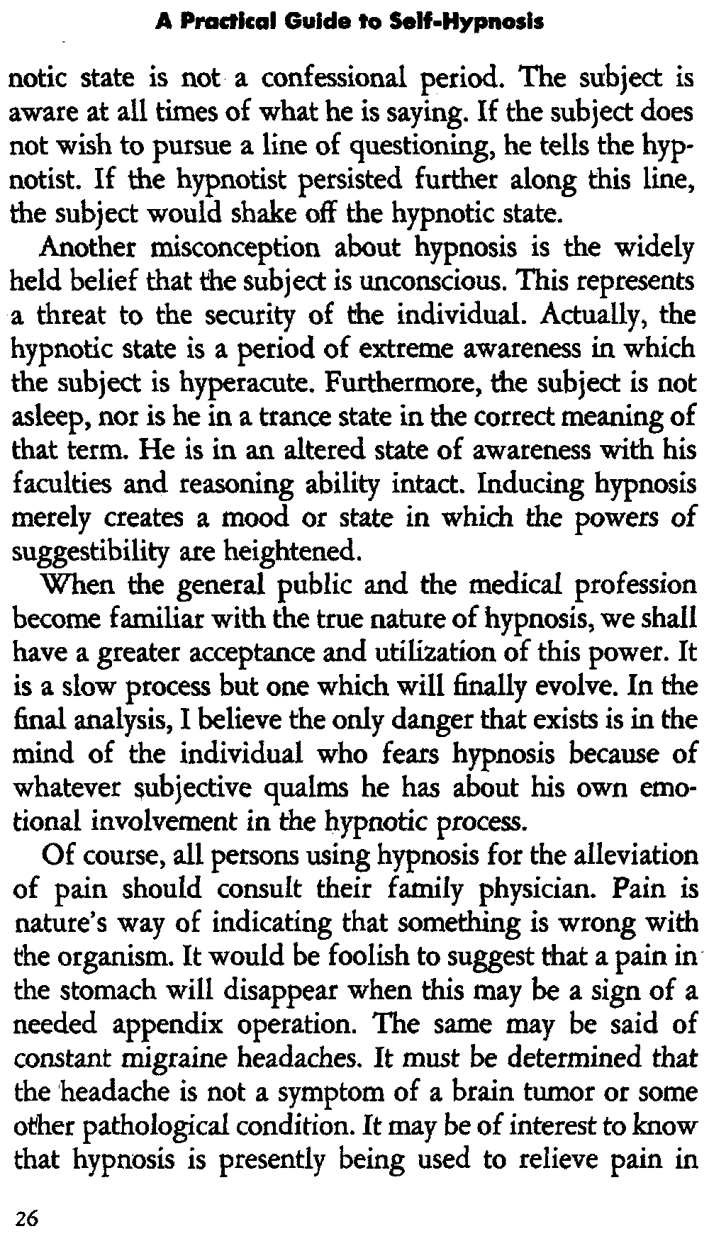 Of course, all persons using hypnosis for the alleviation of pain should consult their family physician. Pain is nature's way of indicating that something is wrong with the organism. It would be foolish to suggest that a pain in the stomach will disappear when this may be a sign of a needed appendix operation. The same may be said of constant migraine headaches. It must be determined that the headache is not a symptom of a brain tumor or some other pathological condition. It may be of interest to know that hypnosis is presently being used to relieve pain in [27] terminal cancer patients. There is an excellent article on this subject, and I recommend it to doctors reading this book. It is called "The Use of Hypnosis in the Case of the Cancer Patient" which appeared in the January 1954 issue of Cancer.[1]
