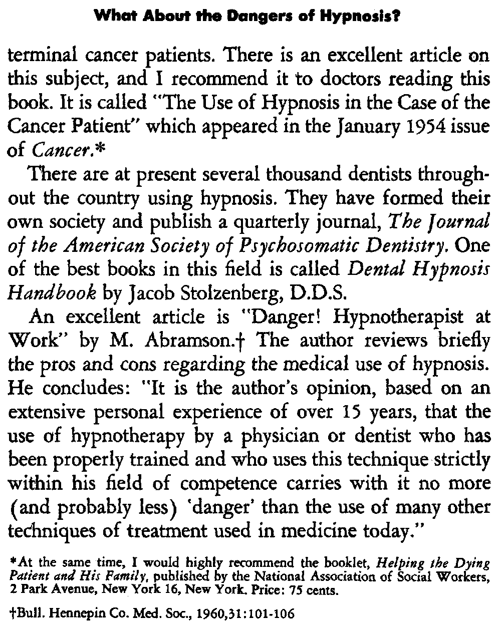 An excellent article is "Danger! Hypnotherapist at Work" by M. Abramson.[2] The author reviews briefly the pros and cons regarding the medical use of hypnosis. He concludes: "It is the author's opinion, based on an extensive personal experience of over 15 years, that the use of hypnotherapy by a physician or dentist who has been properly trained and who uses this technique strictly within his field of competence carries with it no more (and probably less) 'danger' than the use of many other techniques of treatment used in medicine today."