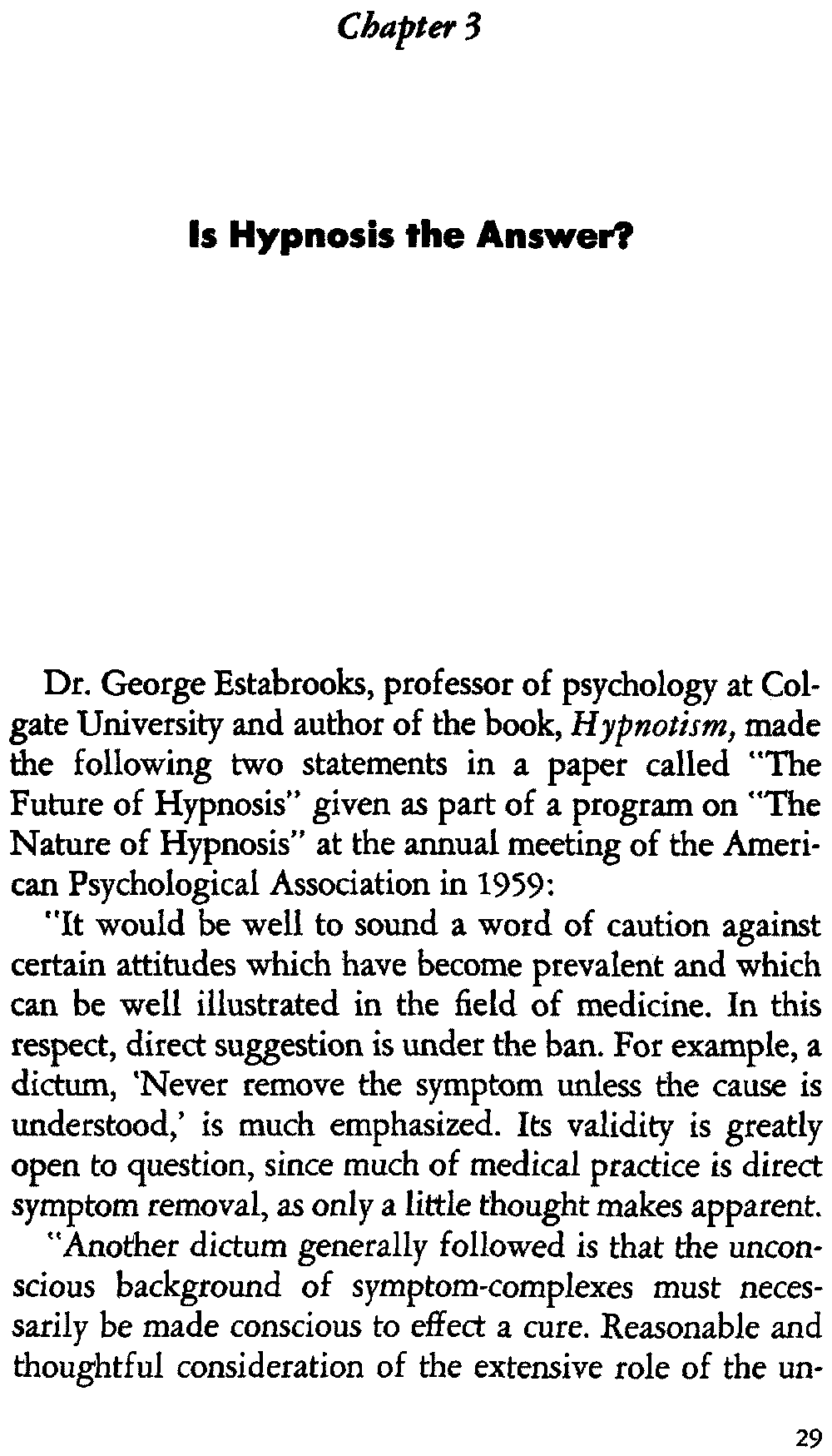 Dr. George Estabrooks, professor of psychology at Colgate University and author of the book, Hypnotism, made the following two statements in a paper called "The Future of Hypnosis" given as part of a program on "The Nature of Hypnosis" at the annual meeting of the American Psychological Association in 1959: