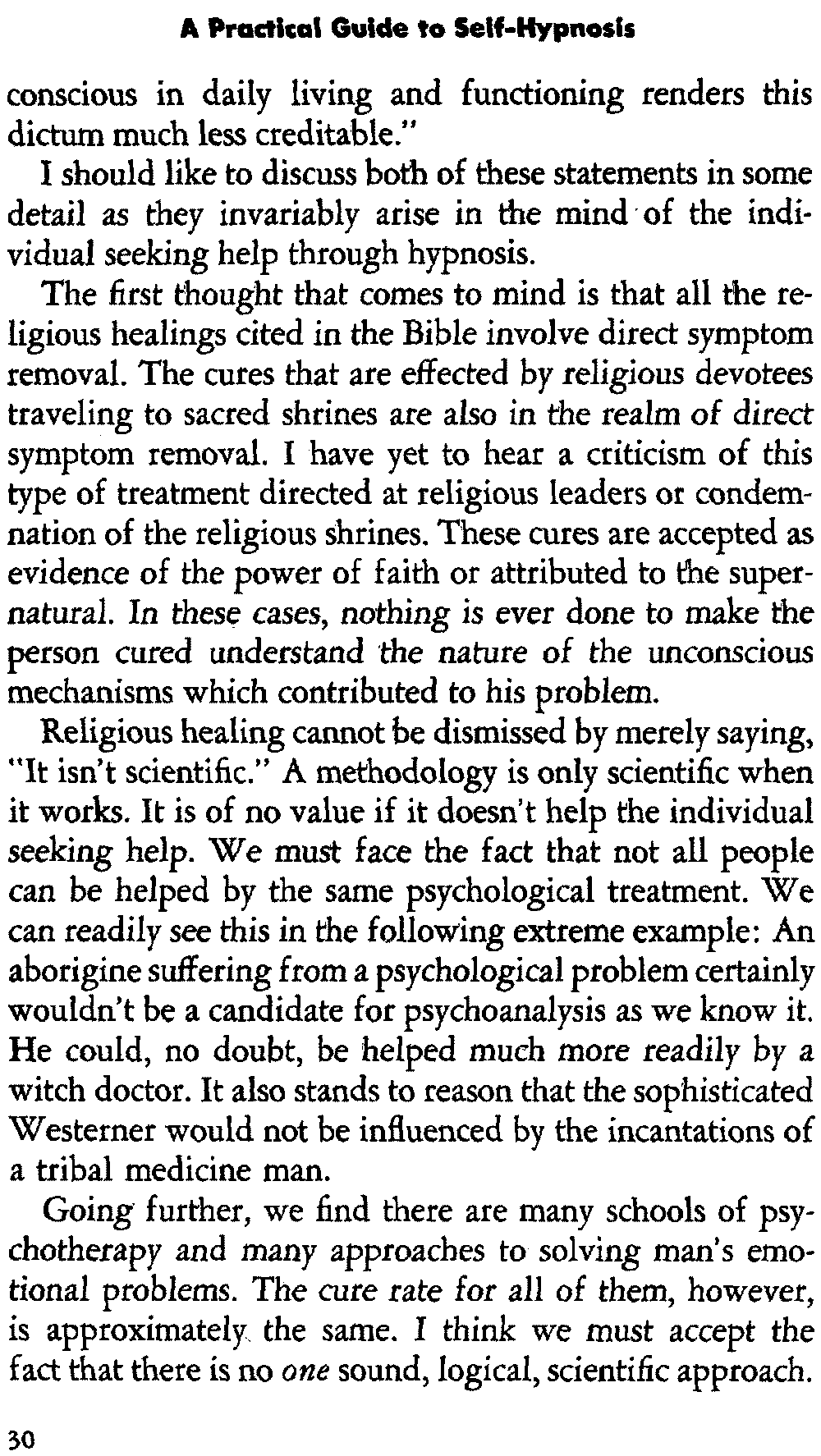 Religious healing cannot be dismissed by merely saying, "It isn't scientific." A methodology is only scientific when it works. It is of no value if it doesn't help the individual seeking help. We must face the fact that not all people can be helped by the same psychological treatment. We can readily see this in the following extreme example: An aborigine suffering from a psychological problem certainly wouldn't be a candidate for psychoanalysis as we know it. He could, no doubt, be helped much more readily by a witch doctor. It also stands to reason that the sophisticated Westerner would not be influenced by the incantations of a tribal medicine man.