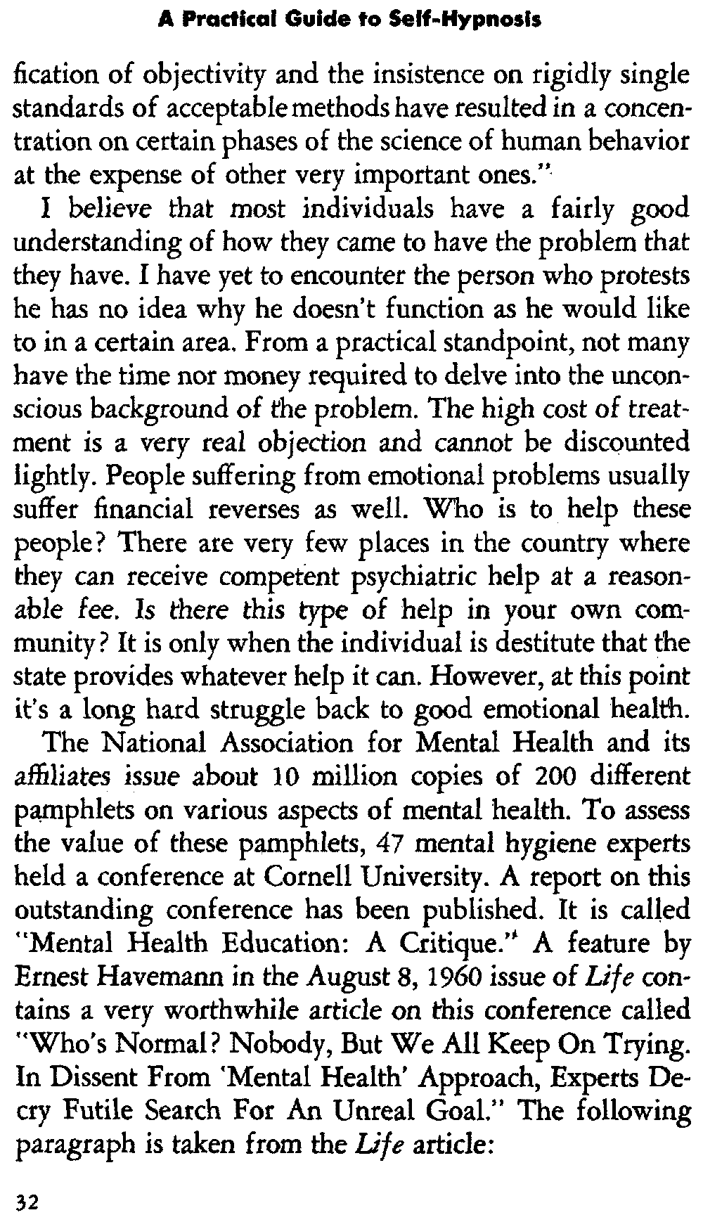 The National Association for Mental Health and its affiliates issue about 10 million copies of 200 different pamphlets on various aspects of mental health. To assess the value of these pamphlets, 47 mental hygiene experts held a conference at Cornell University. A report on this outstanding conference has been published. It is called "Mental Health Education: A Critique." A feature by Ernest Havemann in the August 8, 1960 issue of Life contains a very worthwhile article on this conference called "Who's Normal? Nobody, But We All Keep On Trying. In Dissent From 'Mental Health' Approach, Experts Decry Futile Search For An Unreal Goal." The following paragraph is taken from the Life article: [33]