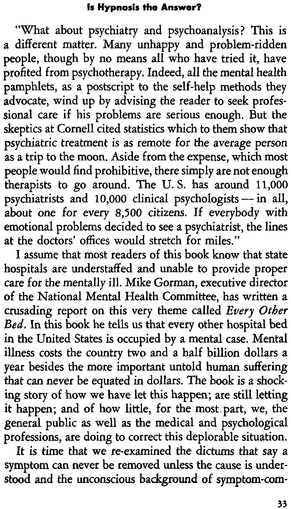 "What about psychiatry and psychoanalysis? This is a different matter. Many unhappy and problem-ridden people, though by no means all who have tried it, have profited from psychotherapy. Indeed, all the mental health pamphlets, as a postscript to the self-help methods they advocate, wind up by advising the reader to seek professional care if his problems are serious enough. But the skeptics at Cornell cited statistics which to them show that psychiatric treatment is as remote for the average person as a trip to the moon. Aside from the expense, which most people would find prohibitive, there simply are not enough therapists to go around. The U. S. has around 11,000 psychiatrists and 10,000 clinical psychologists—in all, about one for every 8,500 citizens. If everybody with emotional problems decided to see a psychiatrist, the lines at the doctors' offices would stretch for miles."