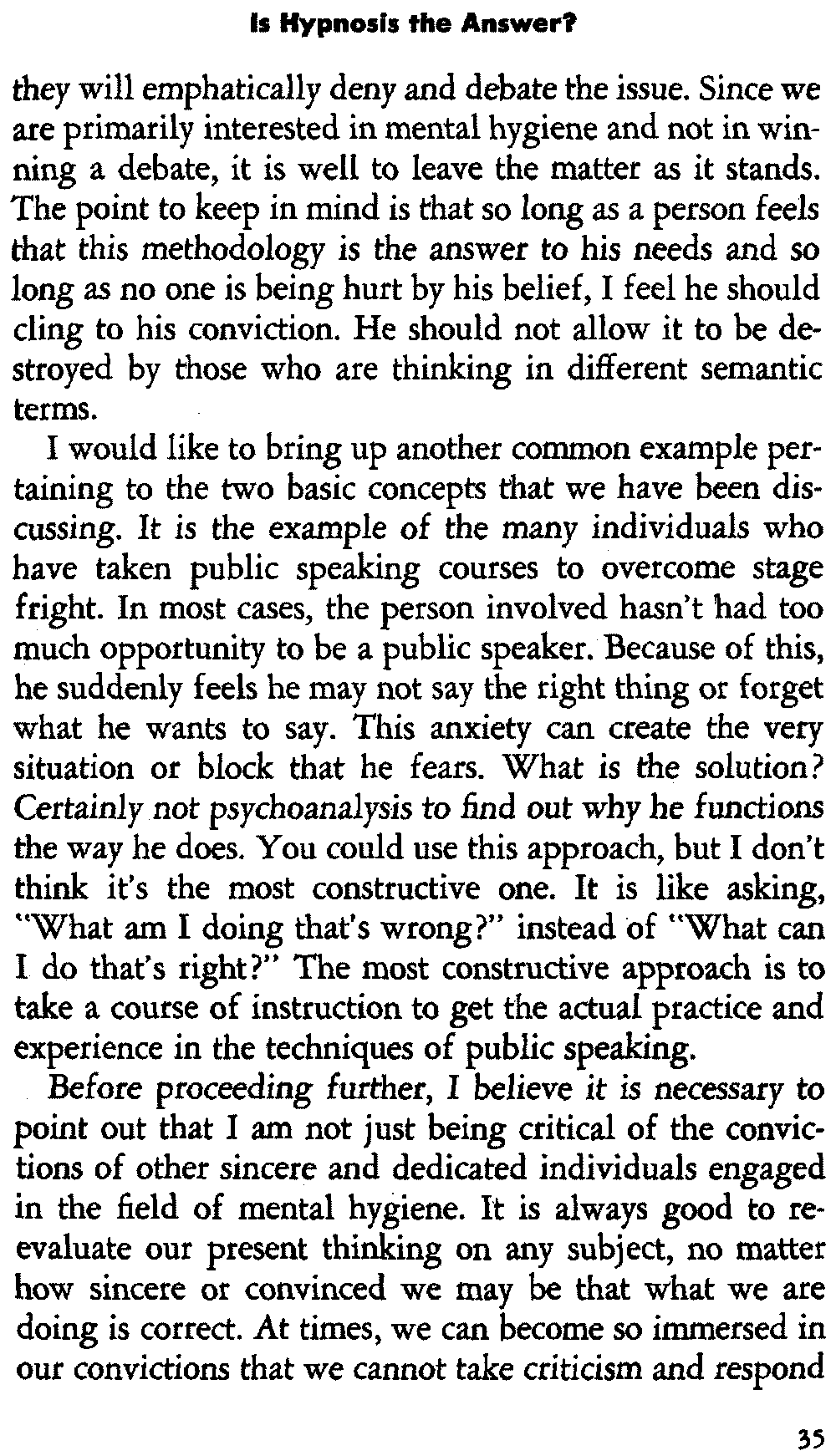 Honest criticism and a sincere difference of opinion are always welcome. But criticism must be well-founded from a scientific point of view and not stem from an emotional reaction. You have probably heard the remark, "I won't let anyone hypnotize me." What are they really saying, and what does hypnosis represent to such an individual? To them, hypnosis represents some sort of "magic spell" which invokes a state of complete helplessness and dependency upon the hypnotist. We previously discussed how this erroneous conception can take place because of the manner in which hypnosis is usually interwoven with bizarre fictional stories.