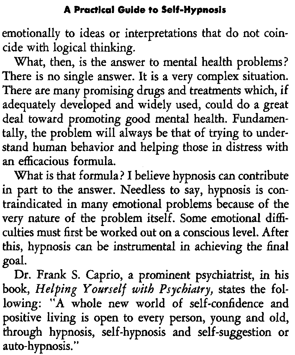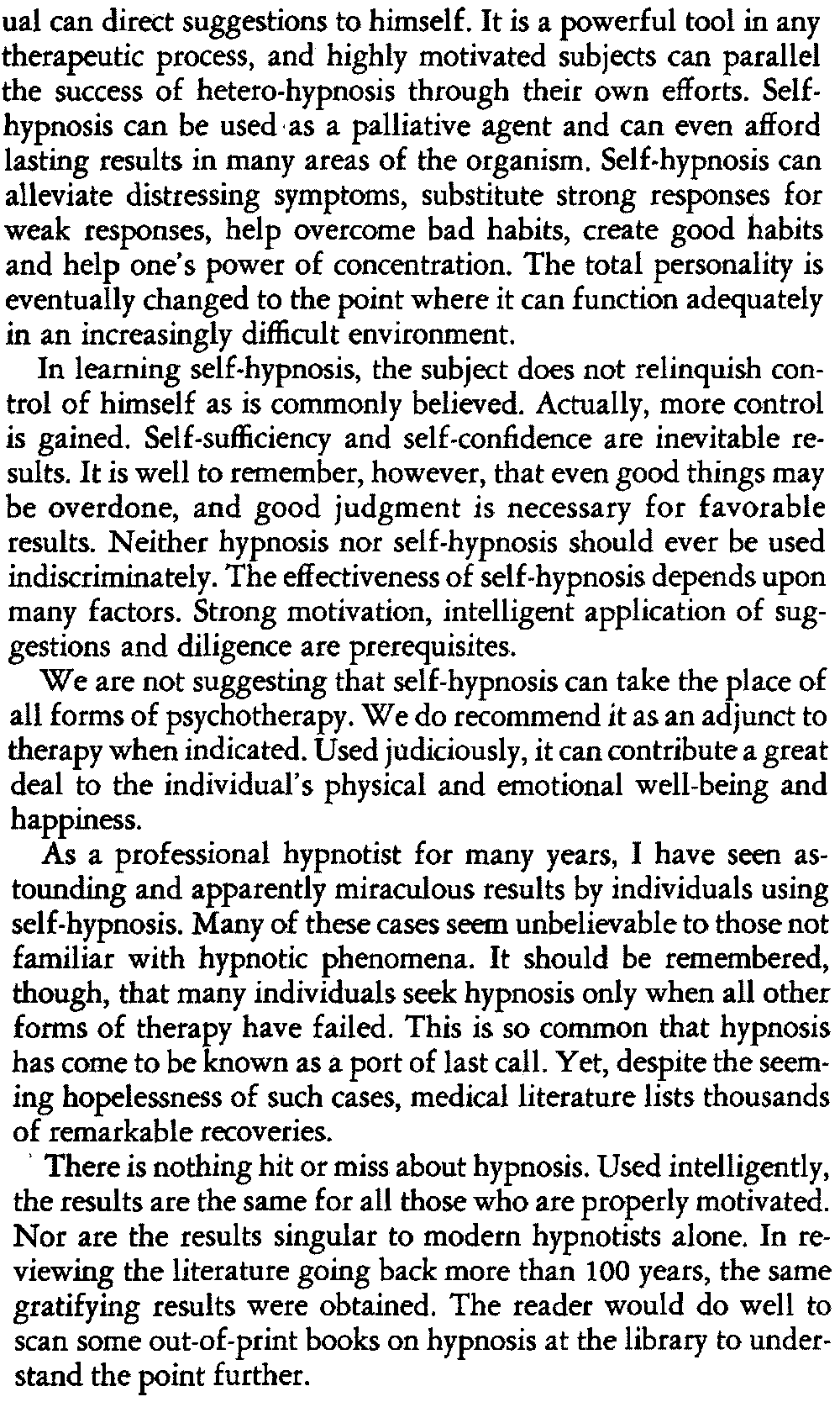 We are not suggesting that self-hypnosis can take the place of all forms of psychotherapy. We do recommend it as an adjunct to therapy when indicated. Used judiciously, it can contribute a great deal to the individual's physical and emotional well-being and happiness.