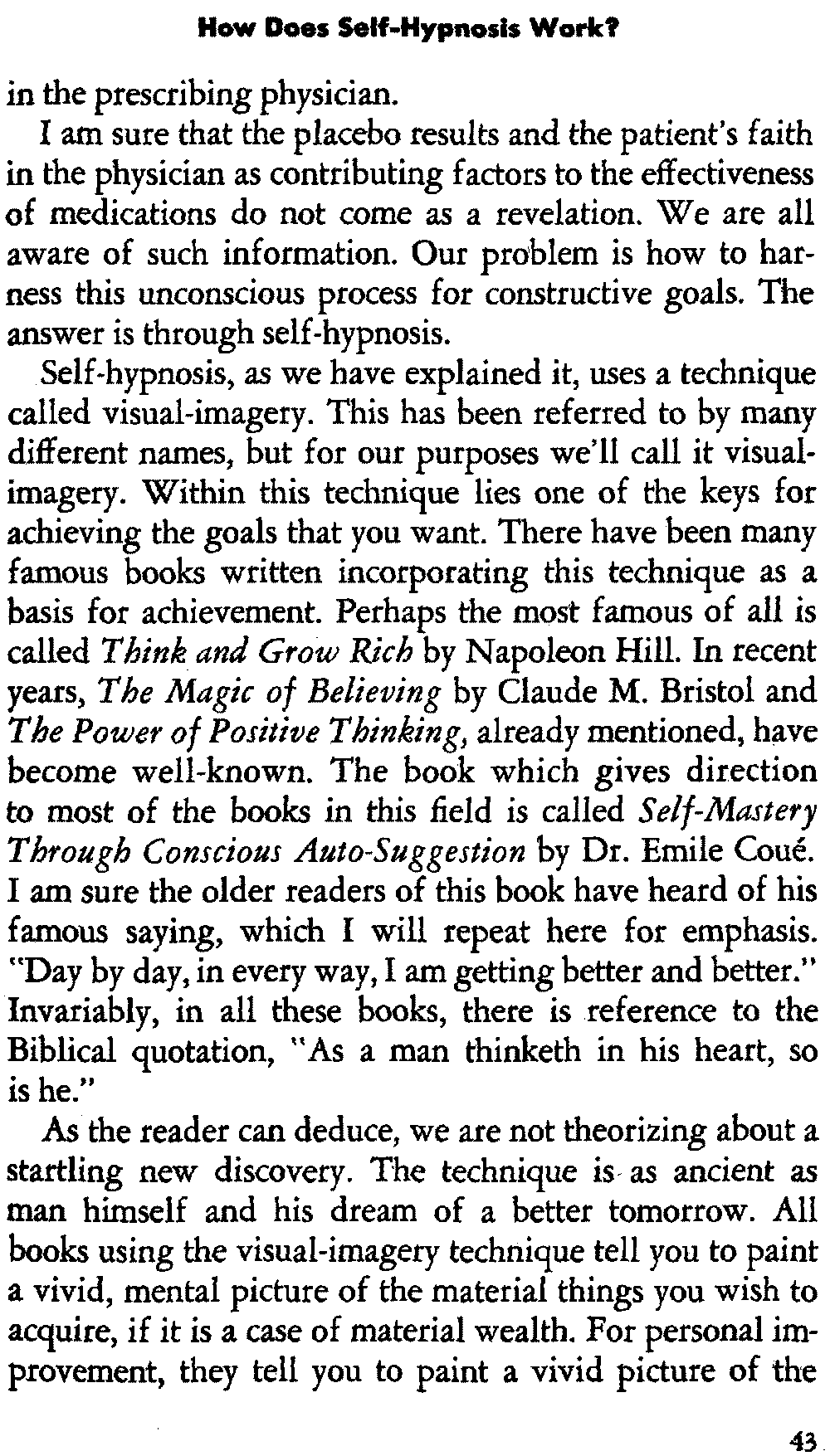 What about the often-quoted statement that "you might do some damage"? Let's explore this area. I assume that the reader is somewhat familiar with the work of Emile Coué or at least has heard of his famous autosuggestion formula of "Day by day, in every way, I'm getting better and better." During our time, thousands upon thousands of seemingly helpless and hopeless cases have been cured by repeating this affirmation over and over again, day after day, as the individual falls asleep.