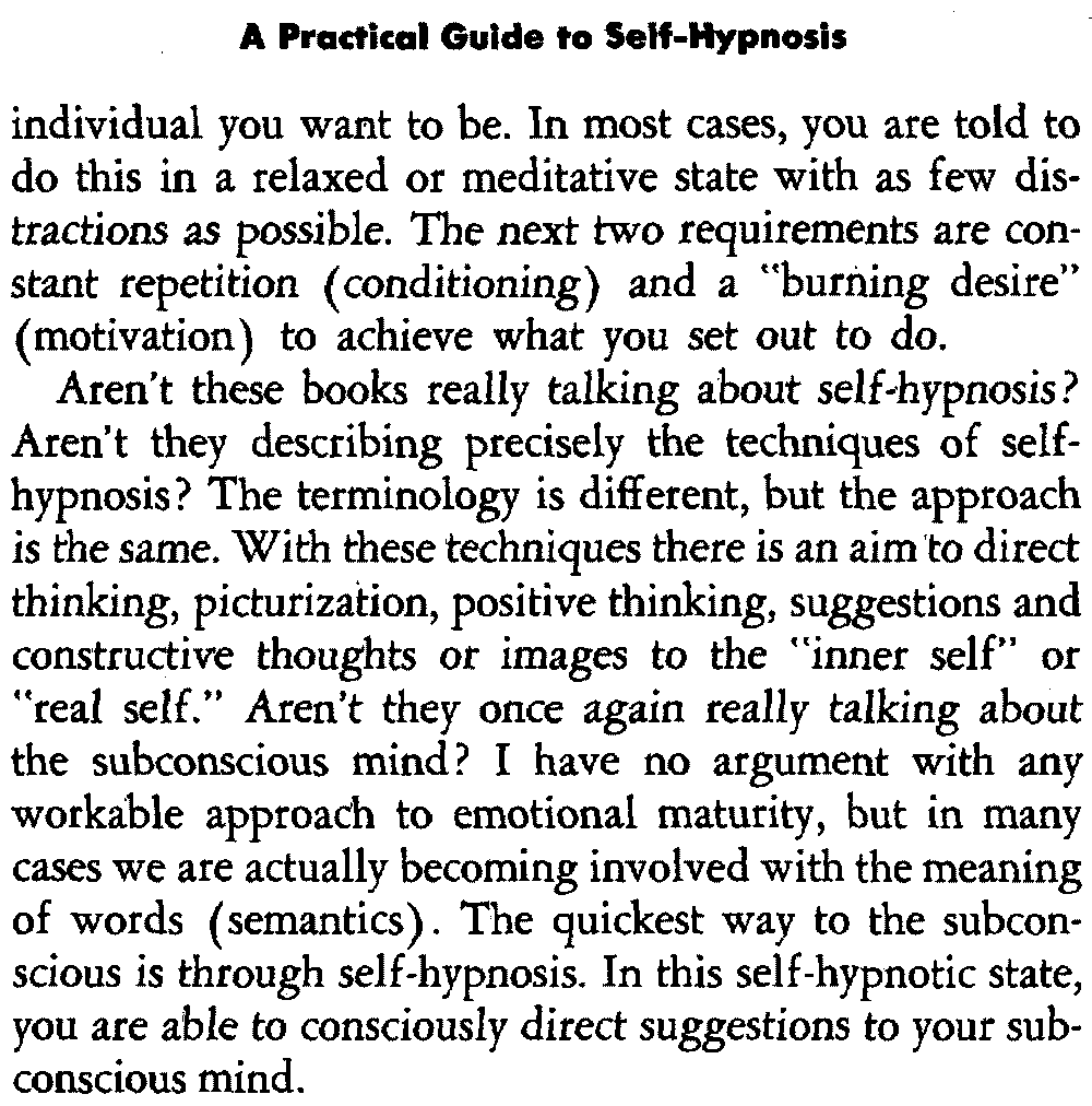 I think we should make it clear that whether we call it autosuggestion, positive thinking, meditation, yoga, affirmations or self-hypnosis, we are, in reality, talking about the same thing. All require certain basic prerequisites before they will work effectively for the individual. We'll [24] discuss these prerequisites in the next chapter.