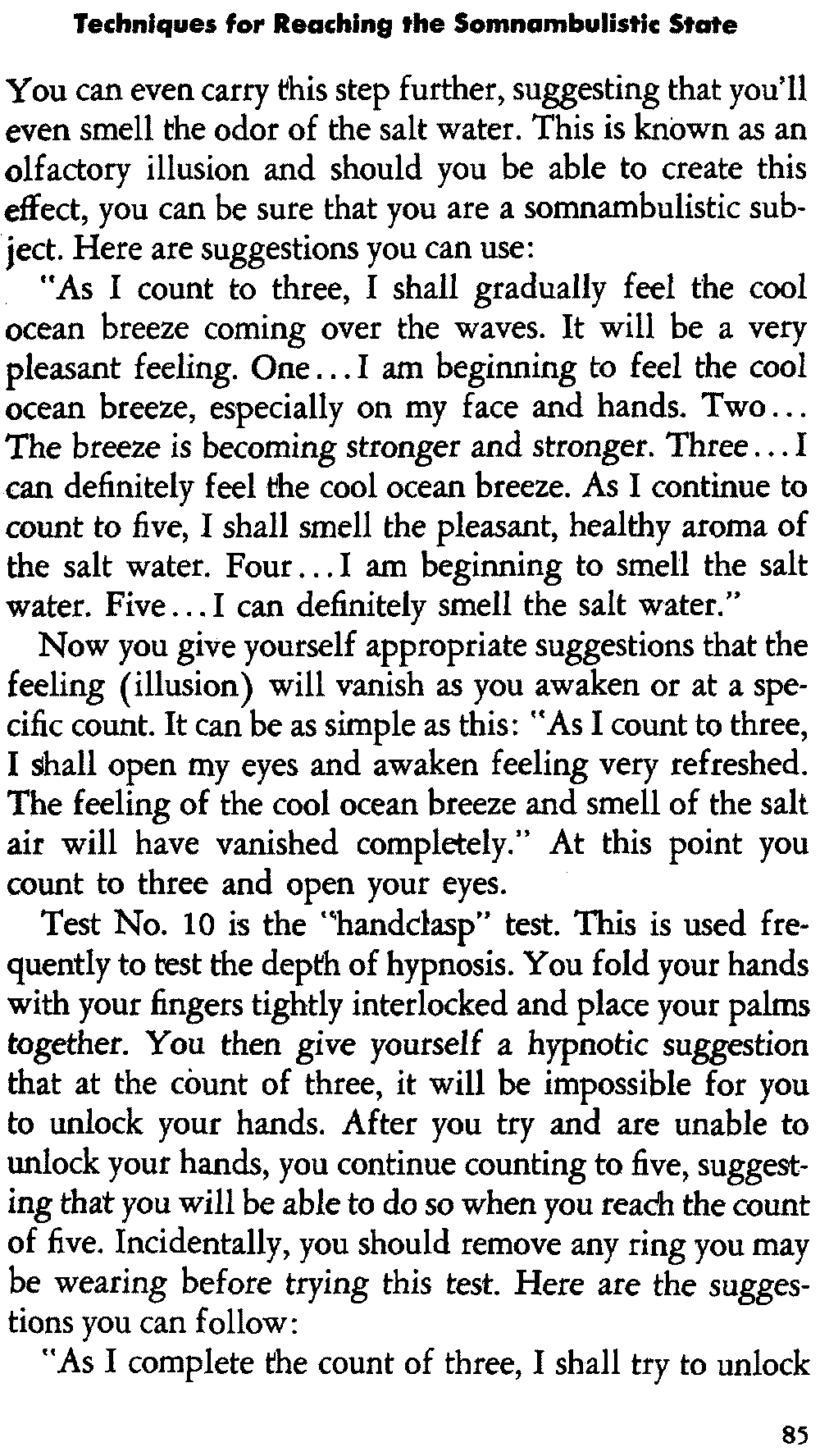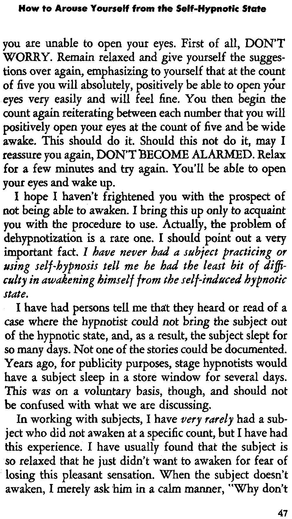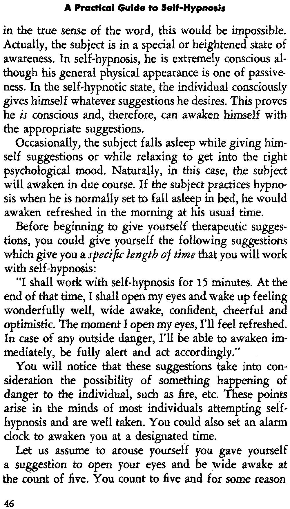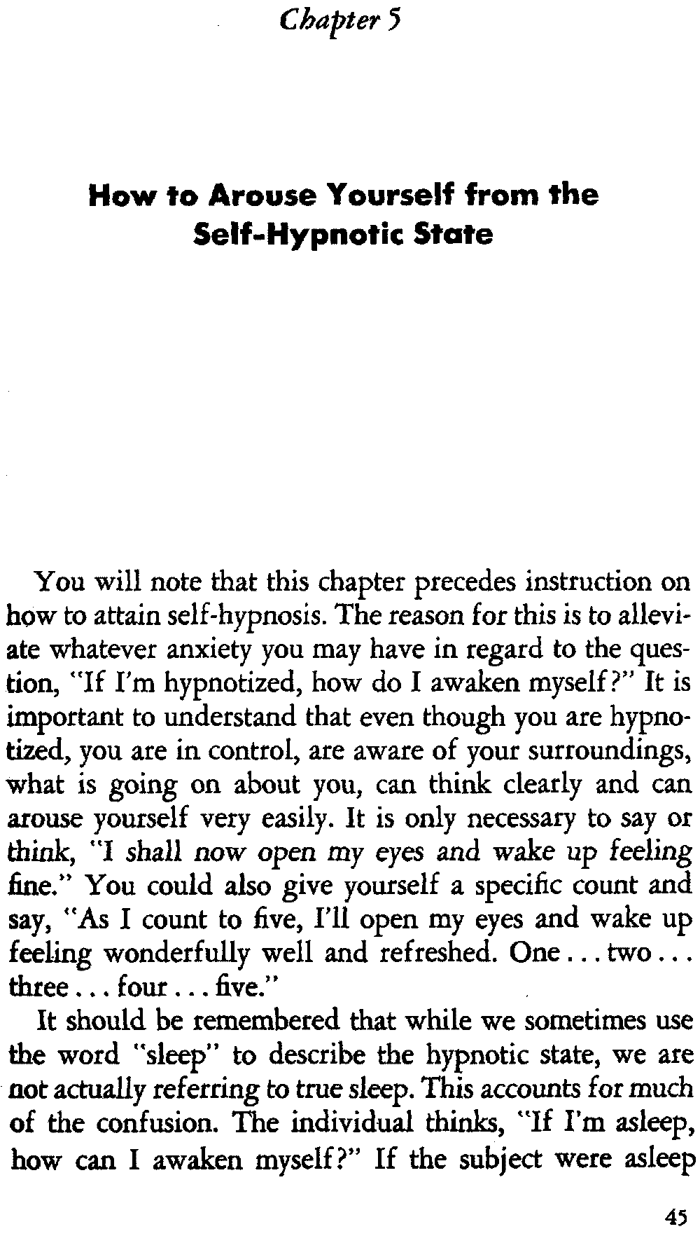 Another frequent question is: "How do I arouse myself from the self-hypnotic state?" You merely say to yourself that upon counting to five you will open your eyes and wake up feeling fine. Many times the subject falls asleep while giving himself posthypnotic suggestions. This is not undesirable since the suggestions will spill over into the subconscious mind as he goes from consciousness to unconsciousness.