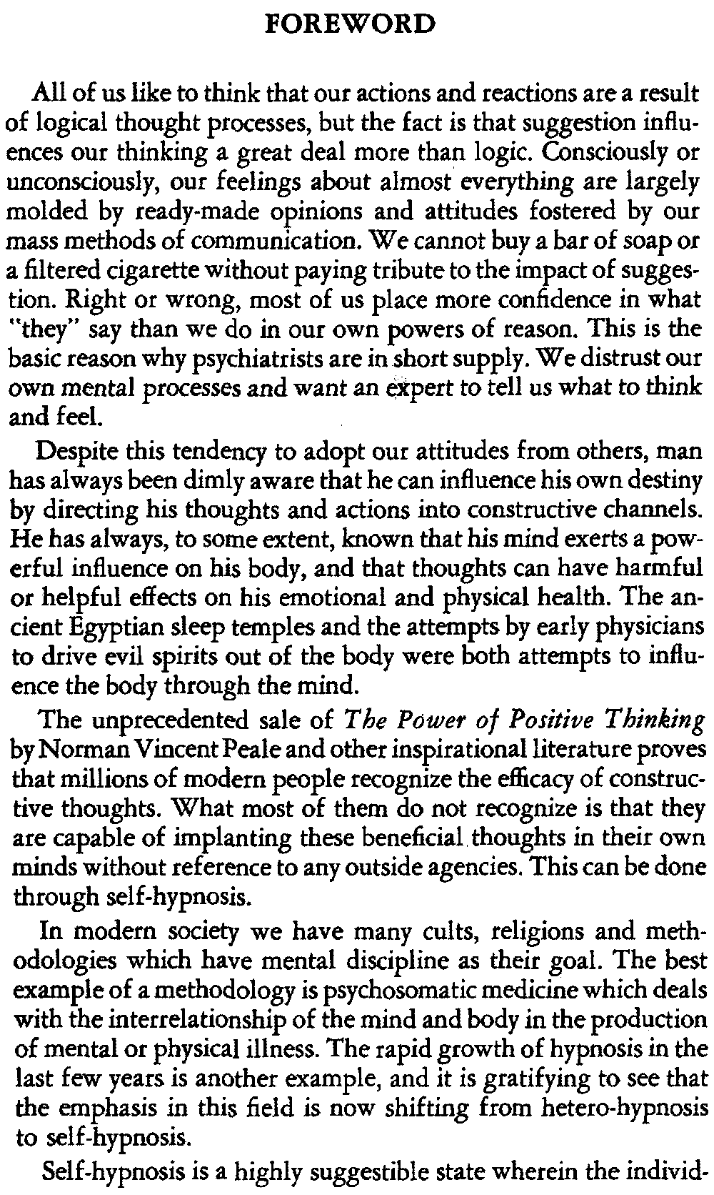 The unprecedented sale of The Power of Positive Thinking by Norman Vincent Peale and other inspirational literature proves that millions of modern people recognize the efficacy of constructive thoughts. What most of them do not recognize is that they are capable of implanting these beneficial thoughts in their own minds without reference to any outside agencies. This can be done through self-hypnosis.