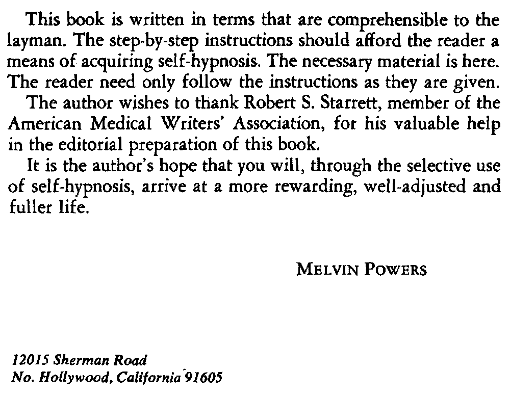 It is the author's hope that you will, through the selective use of self-hypnosis, arrive at a more rewarding, well-adjusted and fuller life.
