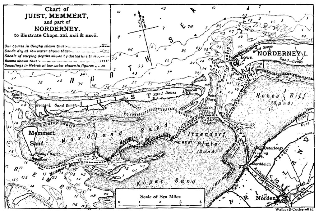 Such an expedition could be prepared in absolute secrecy, by turning to account the natural features of the German coast. No great port was to be concerned in any way. All that was required was sufficient depth of water to float the lighters and tugs; and this is supplied by seven insignificant streams, issuing from the Frisian littoral, and already furnished with small harbours and sluice-gates, with one exception, namely, the tidal creek at Norden; for this, it appeared, was one of the chosen seven, and not, as “Carruthers” supposed, Hilgenriedersiel, which, if you remember, he had no time to visit, and which has, in fact, no stream of any value at all, and no harbour. All of these streams would have to be improved, deepened, and generally canalised; ostensibly with a commercial end, for purposes of traffic with the islands, which are growing health resorts during a limited summer season.