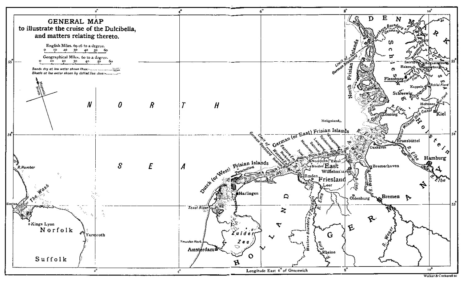 The fact was that, at breakfast on the morning after the arrival of the letter, I had still found that inexplicable lightening which I mentioned before, and strong enough to warrant a revival of the pros and cons. An important pro which I had not thought of before was that after all it was a good-natured piece of unselfishness to join Davies; for he had spoken of the want of a pal, and seemed honestly to be in need of me. I almost clutched at this consideration. It was an admirable excuse, when I reached my office that day, for a resigned study of the Continental Bradshaw, and an order to Carter to unroll a great creaking wall-map of Germany and find me Flensburg. The latter labour I might have saved him, but it was good for Carter to have something to do; and his patient ignorance was amusing. With most of the map and what it suggested I was tolerably familiar, for I had not wasted my year in Germany, whatever I had done or not done since. Its people, history, progress, and future had interested me intensely, and I had still friends in Dresden and Berlin. Flensburg recalled the Danish war of ’64, and by the time Carter’s researches had ended in success I had forgotten the task set him, and was wondering whether the prospect of seeing something of that lovely region of Schleswig-Holstein, [See Map A] as I knew from hearsay that it was, was at all to be set against such an uncomfortable way of seeing it, with the season so late, the company so unattractive, and all the other drawbacks which I counted and treasured as proofs of my desperate condition, if I were to go. It needed little to decide me, and I think K——’s arrival from Switzerland, offensively sunburnt, was the finishing touch. His greeting was “Hullo, Carruthers, you here? Thought you had got away long ago. Lucky devil, though, to be going now, just in time for the best driving and the early pheasants. The heat’s been shocking out there. Carter, bring me a Bradshaw”—(an extraordinary book, Bradshaw, turned to from habit, even when least wanted, as men fondle guns and rods in the close season).
