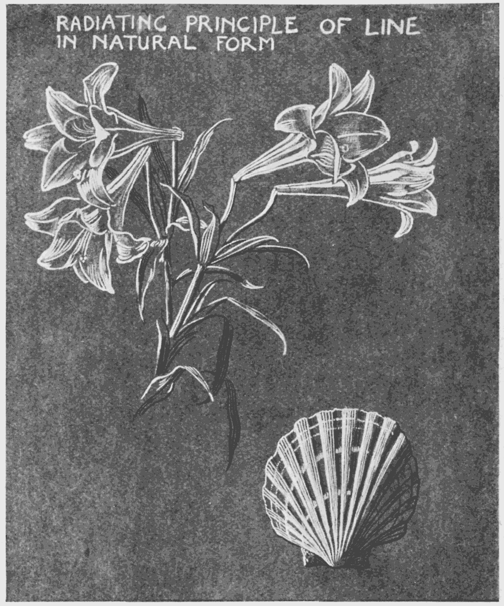 And when we leave plane surfaces and seek to invent appropriate, that is to say, expressive ornament allied to concave and convex surfaces, to the varied forms of pottery for instance, metal-work, and glass vessels, furniture, and accessories of all kinds, we shall find the same laws and principles hold good which should guide us in all design—to adapt design to the characteristics and conditions of the material, to its structural capacity, its use and purpose, as well as to use or invention in line, both as a controlling plan or base of ornament, as well as a means of the association and expression of form.