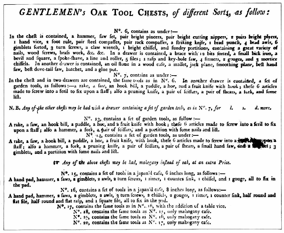 Reflecting what the text writers listed, toolmakers by the end of the 18th century gave buyers a wide choice. The catalogue of Sheffield's Castle Hill Works offered 20 combinations of ready-stocked tool chests; the simplest contained 12 carpenter's tools and the most complex, 39, plus, if desired, an additional assortment of gardening implements (fig. 11). In 1857, the Arrowmammett Works of Middletown, Connecticut, producers of bench and molding planes, published an illustrated catalogue that offered 34 distinct types that included everything from hollows and rounds to double jointers and hand-rail planes (fig. 12).[6]