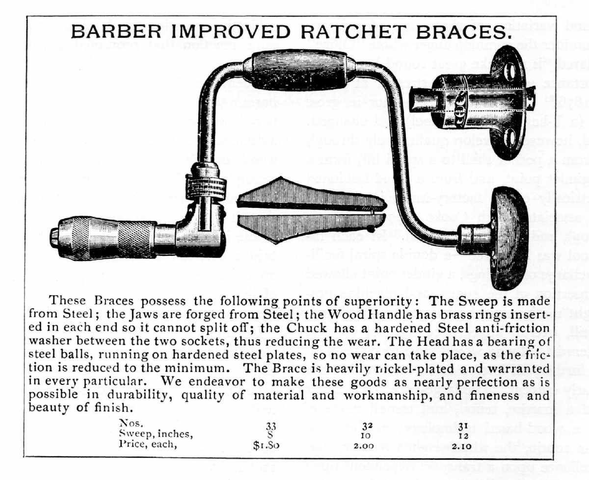 The description of Barber's brace documents a major technical change: wood to steel, leather washers to ball bearings, and natural patina to nickel plate. It is also an explanation for the appearance and shape of craftmen's tools, either hand forged or mass produced. In each case, the sought-after result in the form of a finished product has been an implement of "fineness and beauty." This quest motivated three centuries of toolmakers and brought vitality to hand-tool design. Moxon had advised: