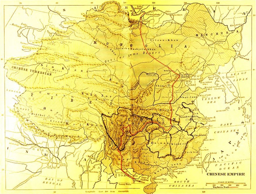 But I could not have done what I did without the wise and generous aid of many whom I met along the way, Europeans and Chinese, officials, merchants, and above all missionaries, everywhere the pioneers. To them all I tender here my grateful thanks. And to the representatives of the Hong Kong[x] and Shanghai Bank wherever I met them, and also to those of the Russo-Asiatic Bank I would express my gratitude for many courtesies shown me.