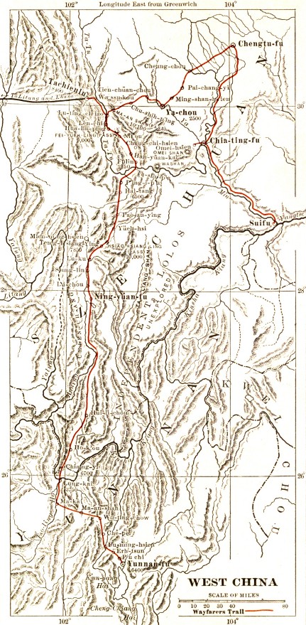 But really to see the East one must shun the half-Europeanized town and the treaty port, must leave behind the comforts of hotel and railway, and be ready to accept the rough and the smooth of unbeaten trails. But the compensations are many: changing[viii] scenes, long days out of doors, freedom from the bondage of conventional life, and above all, the fascination of living among peoples of primitive simplicity and yet of a civilization so ancient that it makes all that is oldest in the West seem raw and crude and unfinished. So when two years ago my feet sought again the "open road," it was towards the East that I naturally turned, and this time it was China that called me. I did not go in pursuit of any information in particular, but just to get for myself an impression of the country and the people. My idea of the Chinese had been derived, like that of most Americans, from books and chance observation of the handful of Kwangtung men who are earning their living among us by washing our clothes. Silent, inscrutable, they flit through the American scene, alien to the last. What lies behind the riddle of their impassive faces? Perhaps I could find an answer. Then, too, it was clear, even to the most unintelligent, that a change was coming over the East, though few realized how speedily. I longed to see the old China before I made ready to welcome the new. But not the China of the coast, for there the West had already left its stamp. So I turned to the interior, to the western provinces of Yunnan and Szechuan. Wonderful for scenery, important in commerce and politics, still unspoiled, there I could find what I wanted.