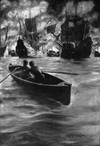 About two o’clock Monday morning eight ships smeared all over the outside with pitch and rosin, their ordnance loaded with stones and bullets and filled with sulphur and other materials suddenly combustible glided out from among the English fleet and took their way silently toward the Spanish ships lying so serenely at anchor. The night was cloudy. The moon was late in its last quarter and did not rise till morning. The darkness favored their enterprise. The wind blew in long, low gusts from the westward which drove them full upon the Armada. Presently as the dark forms of the ships bore full upon the Spanish vessels a tiny spark of light gleamed like a twinkling star at the stern of the boats. For a second it wavered and flickered and then in a moment more a red glare lighted up the heavens and cast a lurid glow upon the two fleets, the cliffs of England and the sea and 318 showing plainly two boats—with Young and Prowse, the two men of Devon in one; Francis and Edward in the other.