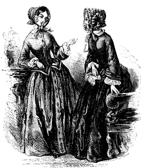 Ladies' Morning Promenade Costume.—A high dress of black satin, the body fitting perfectly tight; has a small jacket cut on the biais, with row of black velvet laid on a little distance from the edge; the sleeves are rather large, and have a broad cuff turned back, which is trimmed to correspond with the jacket; the skirt is long and full; the dress is ornamented up the front in its whole length by rich fancy silk trimmings, graduating in size from the bottom of the skirt to the waist, and again increasing to the throat. Capote of plum-colored satin; sometimes plain, sometimes with a bunch of hearts-ease, intermixed with ribbon, placed low on the left side, the same flowers, but somewhat smaller, ornamenting the interior.