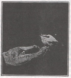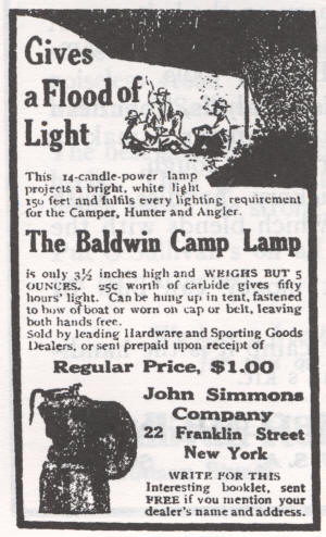 The Baldwin Camp Light is only 3-1/2 inches high and weighs but 5 ounces. 25 cents worth of carbide gives fifty hours' light. Can be hung up in the tent, fastened to bow of boat or worn on cap or belt, leaving both hands free.