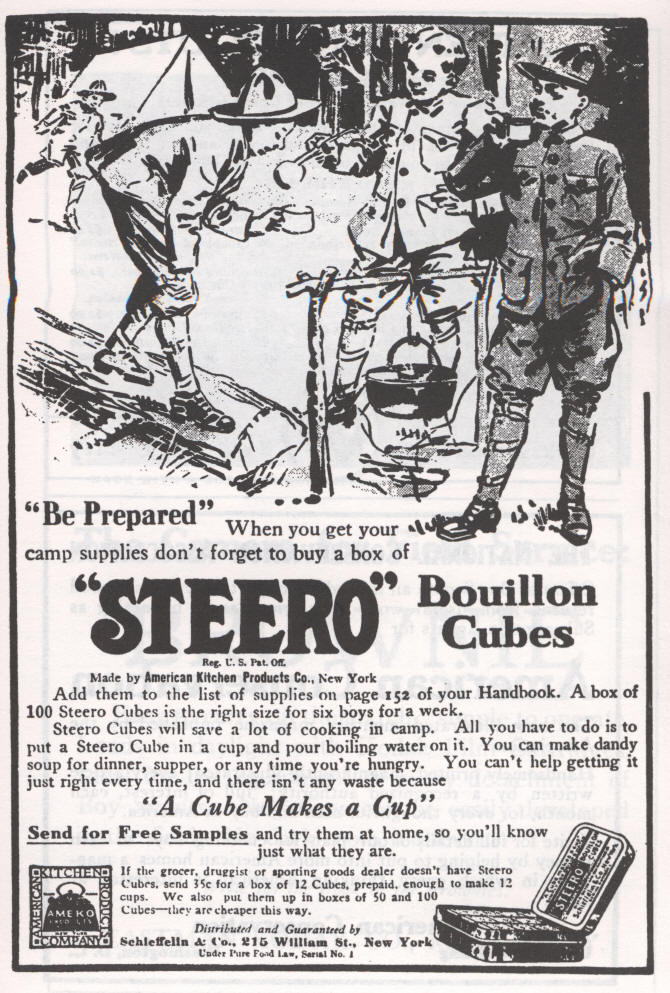 Steero Cubes will save a lot of cooking in camp. All you have to do is to put a Steero Cube in a cup and pour boiling water on it. You can make dandy soup for dinner, supper, or any time you're hungry. You can't help getting it just right every time, and there isn't any waste because