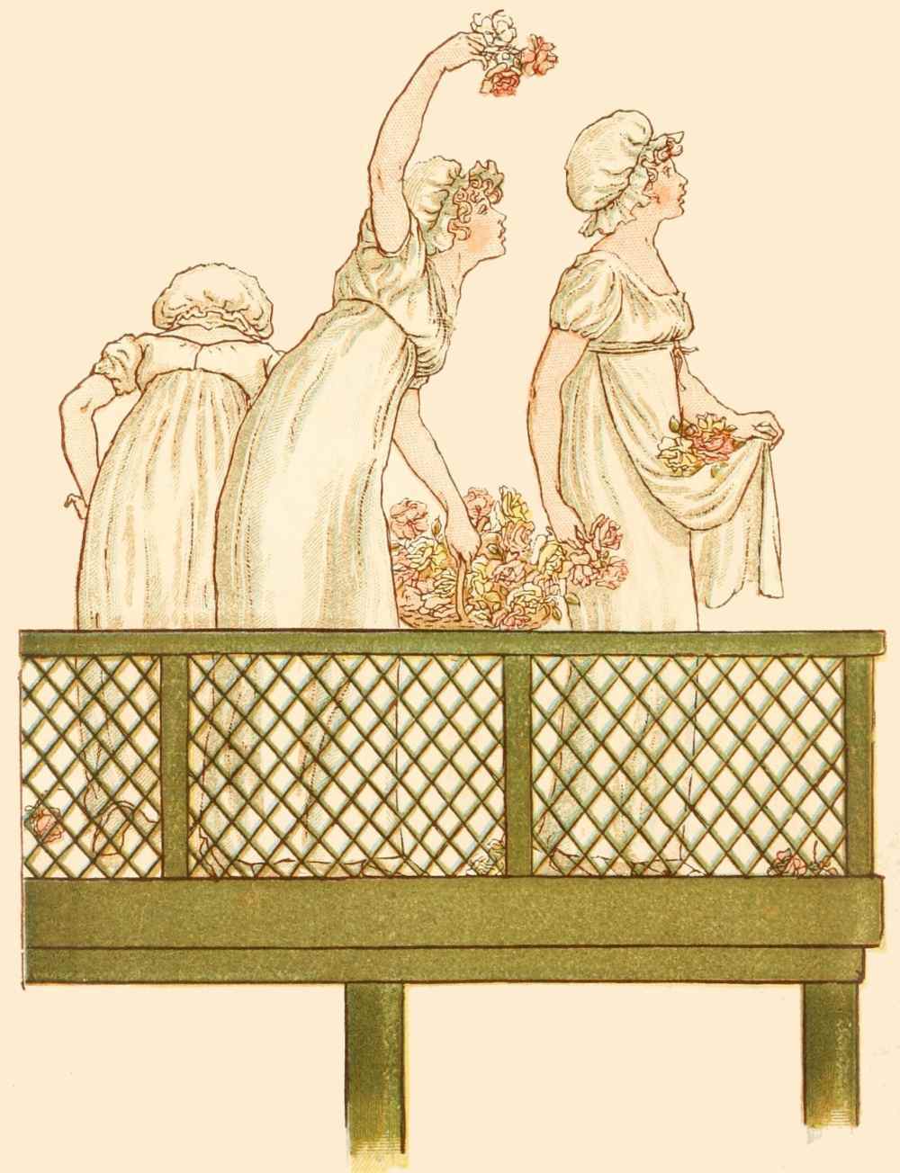 Here damask Roses, white and red, Out of my lap first take I, Which still shall run along the thread, My chiefest flower this make I. Amongst these Roses in a row, Next place I Pinks in plenty, These double Pansies then for show; And will not this be dainty? The pretty Pansy then I'll tie, Like stones some chain inchasing; And next to them, their near ally, The purple Violet placing. The curious choice clove July flower, Whose kind hight the Carnation, For sweetnest of most sovereign power, Shall help my wreath to fashion; Whose sundry colours of one kind, First from one root derived, Them in their several suits I'll bind: My garland so contrived. A course of Cowslips then I'll stick, And here and there (though sparely) The pleasant Primrose down I'll prick, Like pearls that will show rarely; Then with these Marigolds I'll make My garland somewhat swelling, These Honeysuckles then I'll take, Whose sweets shall help their smelling. The Lily and the Fleur-de-lis, For colour much contending; For that I them do only prize, They are but poor in scenting. The Daffodil most dainty is, To match with these in meetness; The Columbine compared to this, All much alike for sweetness. These in their natures only are Fit to emboss the border. Therefore I'll take especial care To place them in their order: Sweet-williams, Campions, Sops-in-wine, One by another neatly; Thus have I made this wreath of mine, And finished it featly. |
