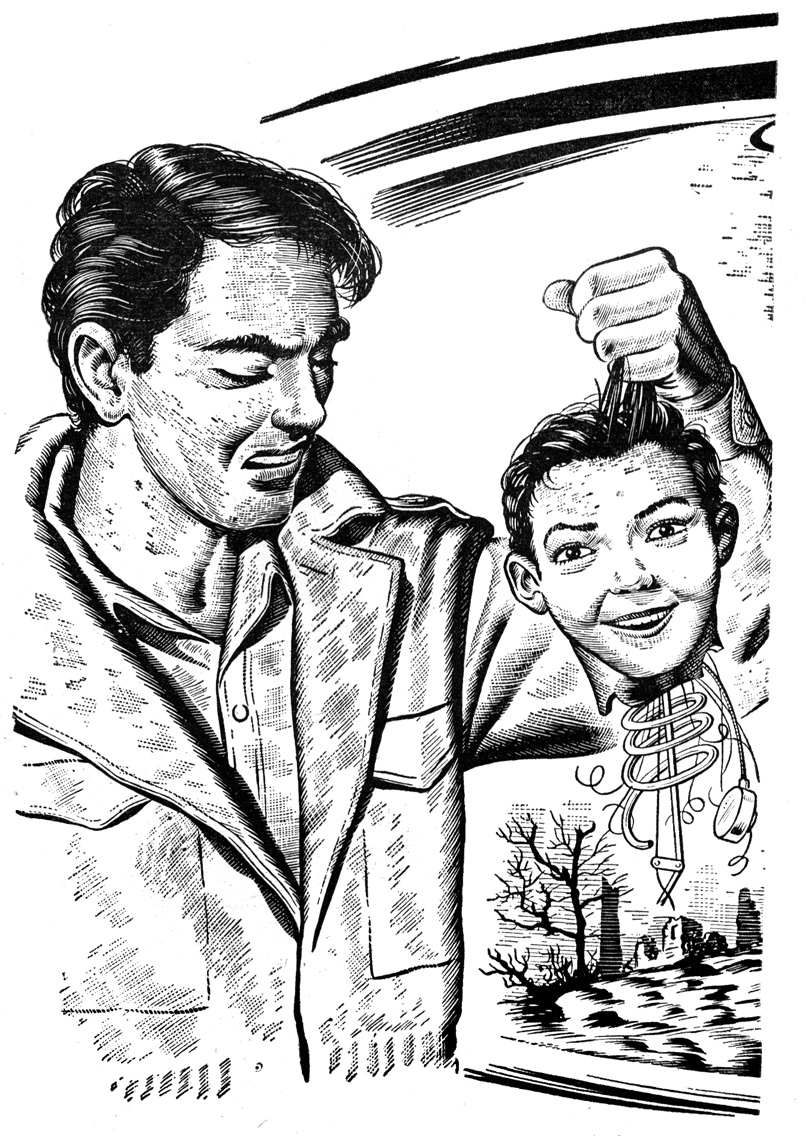 The boy stopped. Hendricks lowered his gun. The boy stood silently, looking at him. He was small, not very old. Perhaps eight. But it was hard to tell. Most of the kids who remained were stunted. He wore a faded blue sweater, ragged with dirt, and short pants. His hair was long and matted. Brown hair. It hung over his face and around his ears. He held something in his arms.