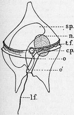Engelmann. Fig. 1.—Peridinium divergens showing longitudinal and transverse grooves in which lie the respective flagella l.f., t.f.; s.p., large “sack pusule” discharging through a tube by pore o’; c.p., “collective pusule discharging at o, and surrounded by a ring of formative” or “daughter pusules”; n, nucleus. |