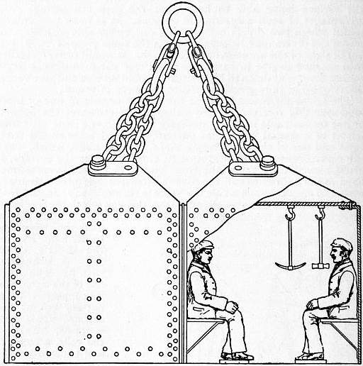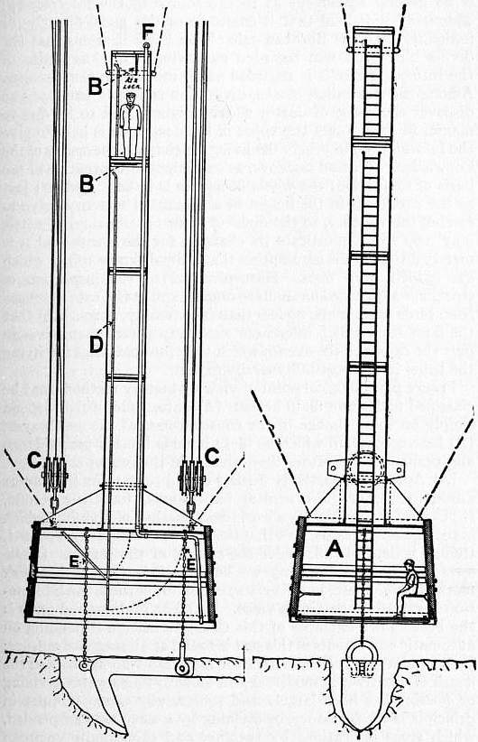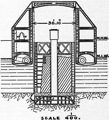 A ship caisson, so called from its presenting some resemblance in section to the hull of a vessel, occupies too much time in being towed, floated into position, and sunk into grooves at the bottom and sides of an entrance for closing it, and then refloated and towed away for opening the entrance again, to be used at entrances and locks to docks (fig. 25). Being, however, simple in construction, taking up little space, and requiring no chamber or machinery for moving it, this form of caisson is generally used for closing the entrance to a graving dock, where it remains for several days in place during the execution of repairs to a vessel in the dock. A ship caisson only requires the admission of sufficient water to sink it when in position across the entrance to a graving dock; and this water has to be pumped out before it can be floated, and removed to some vacant position in the neighbouring dock till it is again required. Like a sliding or rolling caisson, it provides a bridge for crossing over the entrance of the graving dock when in position.