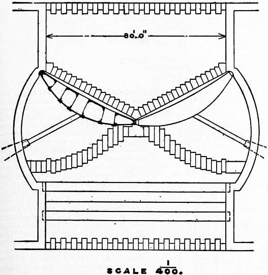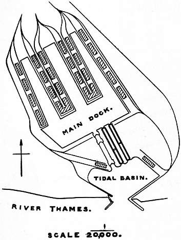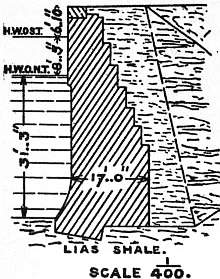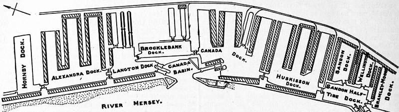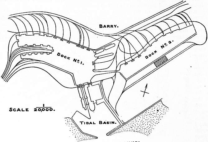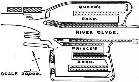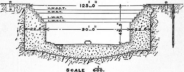 The dimensions of graving docks vary considerably with the nature of the trade and the date of construction; and sometimes an intermediate entrance is provided to accommodate two smaller vessels. The sizes of some of the largest graving docks are as follows: Liverpool, Canada dock, 925½ ft. long, 94 ft. width of entrance, and 29 ft. depth at the ordinary water-level in the dock; Southampton, 851¾ ft. by 90 ft., and 29½ ft. depth at high-water neaps (figs. 26 and 27); Tilbury, 875 ft. by 70 ft. by 31½ ft.; and Glasgow, 880 ft. by 80 ft. by 26½ ft.