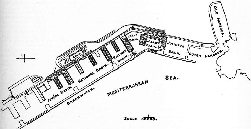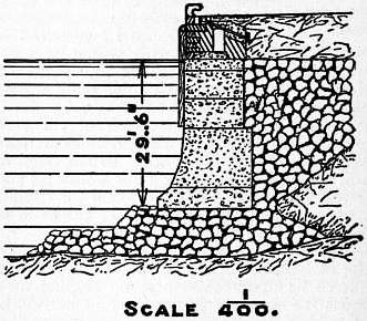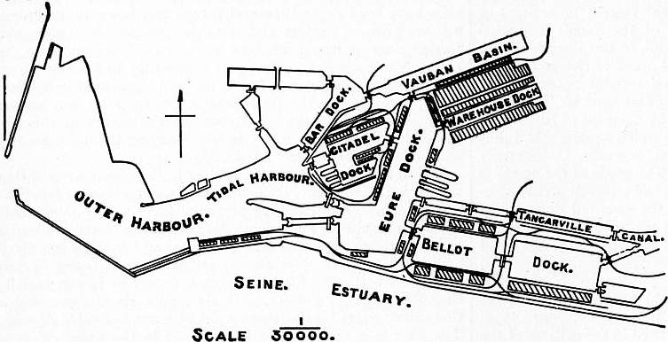 The new Florida lock (fig. 20), forming the main entrance through the new approach harbour and tidal harbour to the Eure dock and other docks of the port of Havre, is the largest lock hitherto constructed. It has an available length of chamber between the gates of 805 ft., a width of 98½ ft., and depths over the sills of 15¾ ft. at the lowest low water of spring tides, 23½ ft. at low water of neap tides, 35 ft. at high water of neap tides, and 40½ ft. at high water of spring tides. Owing to the alluvial stratum at the site of the lock close to the Seine estuary, of which it doubtless at one time formed part, the foundations for the sill and side walls or heads at each end of the lock were executed by aid of compressed air. The foundations for these heads were carried down to an impermeable stratum by means of two bottomless caissons, filled eventually with concrete, 213½ ft. 362 long across the lock and 105 ft. wide in the line of the lock at the upper end, and 206¾ ft. long and 116½ ft. wide at the lower end, to a depth of 18 ft. below the sill at the upper end, and 41 ft. at the lower end, owing to the dip down seawards and southward of the water-tight stratum. These caissons were provided for their sinkage with temporary dams of masonry closing the opening of the lock at the extremities of each caisson, enabling the gates to be subsequently erected under their shelter. The junctions between the foundations of the heads and the adjacent foundations were effected by small movable caissons carried down in recesses provided in the buried caissons. The connexions with the adjacent quay walls were accomplished by two supplementary side caissons at the end of each head; and the north side wall of the lock was founded by means of seven bottomless caissons sunk by aid of compressed air, on account of the proximity of the tidal harbour on that side. The south side wall was founded for a length of about 200 ft. at its western end in an excavated trench kept dry by pumping; but the greater portion was founded in a dredged trench in which bearing piles were driven under water, on which the masonry was built in successive layers, about 3¼ ft. thick, in a movable caisson 93½ ft. long and 37¾ ft. wide; whilst a bottomless caisson, left in the work, was employed for founding about 100 ft. of wall at the eastern end. The bed of concrete also, 10 ft. thick, forming the floor of the chamber, was carried out for 82 ft. at the western end in the open air, and the remainder in the same movable caisson as used for the south wall. Two sluiceways on each side running the whole length of the lock, differing 6½ ft. in level, communicate with the lock-chamber through openings in the side walls, 67¼ ft. apart, and provide for the filling and emptying of the chamber.