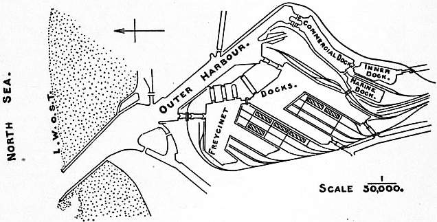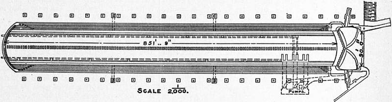 Floating Dry Docks.—Where there is no site available for a graving dock, or the ground is very treacherous, floating dry docks, built originally of wood, but more recently of iron or steel, have occasionally been resorted to. The first Bermuda dock towed across the Atlantic in 1869, and the new dock launched in 1902, 545 ft. by 100 ft., are notable examples. Water is admitted into the pontoon at the bottom to sink the dock sufficiently to admit a vessel at its open end; and then the water is pumped out of compartments in the pontoon till the vessel is raised out of water. It is only necessary to find a sheltered site, with a sufficient depth of water, for conducting the operations.