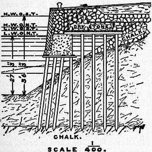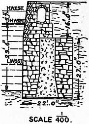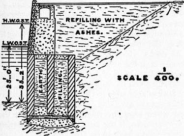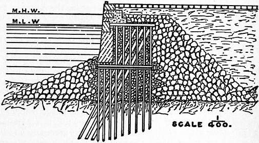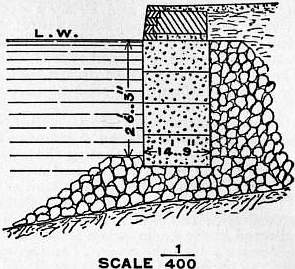 A graving dock consists of an enclosure, surrounded by side walls stepped on the face, and paved at the bottom with a thick floor sloping slightly down from the centre to drains along the sides, long enough to receive the longest vessel likely to come to the port. Its entrance, at the end adjoining the dock, is just wide enough to admit the vessel of greatest beam, and deep enough over the sill to receive the vessel of greatest draught, when light, at the lowest water-level of the dock (figs. 26 and 27). Graving docks are constructed of masonry, brickwork or concrete, or formerly in America of timber; they should be founded on a solid impervious stratum, or, where that is impracticable, they should be built upon bearing piles and enclosed within sheet piling, to prevent settlement and the infiltration of water under pressure below the dock. Keel blocks are laid along the centre line of the dock, for the keel of the vessel to rest on when the water is pumped out; and the vessel is further supported on each side by timber shores supported on the steps or “altars” of the side walls, which are lined with granite or other hard stone, or 364 blue bricks, or, when constructed of concrete, with a facing of stronger concrete, to enable these altars to withstand the wear and shocks to which they are subjected. Steps and slides are provided at convenient places at the sides to give access for men and materials to the bottom of the dock; and culverts and drains lead the water to pumps for removing the water from the dock when the entrance has been closed, and to keep it dry whilst a vessel is under repair. Culverts in the side walls of the entrance enable water to be admitted for filling the dock to let the vessel out. Graving docks are generally closed by ship caissons; but where they open direct on to a tidal river, and there is some exposure, gates are adopted, or sometimes sliding caissons.