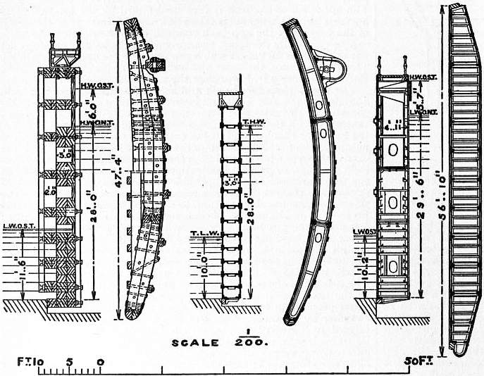 A sliding or rolling caisson is occasionally placed across each end of a lock in place of a pair of dock gates, being Caissons drawn back into a recess at the side for opening docks. the lock. As a caisson chamber has to be covered for over to provide a continuous quay or roadway on the Caissons for docks. top, a lowering platform is supplied to enable the caisson to pass under the small girders spanning the top of the chamber, or the caisson is sunk down sufficiently (fig. 24). The caisson is furnished with an air chamber to give it flotation, which is adjusted by ballast according to the depth of water. The advantages of a caisson, as compared with a pair of gates, are that the gate recesses, gate floor, hollow quoins and arrangements for working in the side walls are dispensed with, so that the lock can be made shorter, and the work at each head is rendered less complicated. The caisson itself also serves as a very strong movable bridge, and therefore is often preferred at dockyards to dock gates. By improvements in the hauling machinery, a caisson can open or close a lock as quickly as dock gates; the caissons at Zeebrugge lock, at the entrance to the Bruges ship canal, are drawn across the lock or into their chamber by electricity in two minutes. A caisson is specially useful in cases where there may be a head of water on either side, as then it takes the place of two pairs of gates pointing in opposite directions, or for closing an entrance against a current. A caisson, however, requires a much larger amount of material than a pair of dock gates, and a considerable width on one side for its chamber, so that under ordinary conditions gates are generally used at docks.