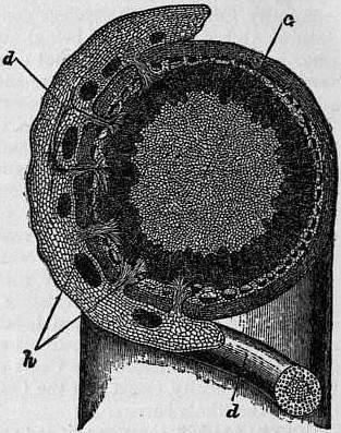 c, stem of host. d, stem of Cuscuta. h, haustoria. (After Dodel-Port.) |