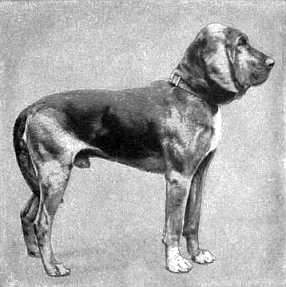 Hounds.—These are large dogs, hunting by smell, with massive structure, large drooping ears, and usually smooth coats, without fringes of hair on the ears, limbs or tail. The bloodhound is probably the stock from which all the English races of hounds have been derived. The chief character is the magnificent head, narrow and dome-like between the huge pendulous ears, and with transverse puckers on the forehead and between the eyes. The prevailing colour is tan with large black spots. Bloodhounds, or, as they are sometimes termed, sleuthhounds, have been employed since the time of the Romans in pursuing and hunting down human beings, and a small variety, known as the Cuban bloodhound, probably of Spanish origin, was used to track fugitive negroes in slaveholding times. Bloodhounds quest slowly and carefully, and when they lose the scent cast backwards until they recover the original trail and make a fresh attempt to follow it.
