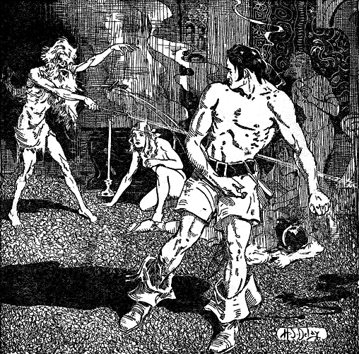 "Tolkemec!" whispered Tascela, livid, while the others crouched in speechless horror. "No myth, then, no ghost! Set! You have dwelt for twelve years in darkness! Twelve years among the bones of the dead! What grisly food did you find? What mad travesty of life did you live, in the stark blackness of that eternal night? I see now why Xamec and Zlanath and Tachic did not return from the catacombs—and never will return. But why have you waited so long to strike? Were you seeking something, in the pits? Some secret weapon you knew was hidden there? And have you found it at last?"