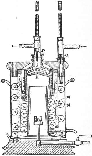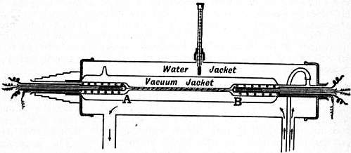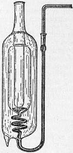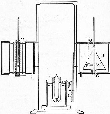 Calibration of a Mercury Thermometer.—To facilitate description, we will take the case of a fine-bore tube, such as that of a thermometer, to be calibrated with a thread of mercury. The bore of such a tube will generally vary considerably even in the best standard instruments, the tubes of which have been specially drawn and selected. The correction for inequality of bore may amount to a quarter or half a degree, and is seldom less than a tenth. In ordinary chemical thermometers it is usual to make allowance for variations of bore in graduating the scale, but such instruments present discontinuities of division, and cannot be used for accurate work, in which a finely-divided scale of equal parts is essential. The calibration of a mercury thermometer intended for work of precision is best effected after it has been sealed. A thread of mercury of the desired length is separated from the column. The exact adjustment of the length of the thread requires a little manipulation. The thermometer is inverted and tapped to make the mercury run down to the top of the tube, thus collecting a trace of residual gas at the end of the bulb. By quickly reversing the thermometer the bubble passes to the neck of the bulb. If the instrument is again inverted and tapped, the thread will probably break off at the neck of the bulb, which should be previously cooled or warmed so as to obtain in this manner, if possible, a thread of the desired length. If the thread so obtained is too long or not accurate enough, it is removed to the other end of the tube, and the bulb further warmed till the mercury reaches some easily recognized division. At this point the broken thread is rejoined to the mercury column from the bulb, and a microscopic bubble of gas is condensed which generally suffices to determine the subsequent breaking of the mercury column at the same point of the tube. The bulb is then allowed to cool till the length of the thread above the point of separation is equal to the desired length, when a slight tap suffices to separate the thread. This method is difficult to work with short threads owing to deficient inertia, especially if the tube is very perfectly evacuated. A thread can always be separated by local heating with a small flame, but this is dangerous to the thermometer, it is difficult to adjust the thread exactly to the required length, and the mercury does not run easily past a point of the tube which has been locally heated in this manner.