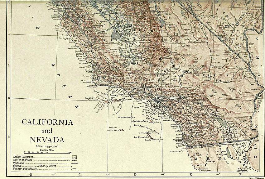 Finally along the sea below Pt. Conception are fertile coastal plains of considerable extent, separated from the interior deserts by various mountain ranges from 5000 to 7000 ft. high, and with peaks much higher (San Bernardino, 11,600; San Jacinto, 10,800; San Antonio, 10,140). Unlike the northern Sierra, the ranges of Southern California are broken down in a number of places. It is over these passes—Soledad, 2822 ft., Cajon, San Gorgonio, 2560 ft.—that the railways cross to the coast. That part of California which lies to the south and east of the southern inosculation of the Coast Range and the Sierra comprises an area of fully 50,000 sq. m., and belongs to the Basin Range region. For the most part it is excessively dry and barren. The Mohave desert—embracing Kern, Los Angeles and San Bernardino, as also a large part of San Diego, Imperial and Riverside counties—belong to the “Great Basin,” while a narrow strip along the Colorado river is in the “Open Basin Region.” They have no drainage to the sea, save fitfully for slight areas through the Colorado river. The Mohave desert is about 2000 ft. above the sea in general altitude. The southern part of the Great Basin region is vaguely designated the Colorado desert. In San Diego, Imperial and Riverside counties a number of creeks or so-called rivers, with beds that are normally dry, flow centrally toward the desert of Salton Sink or “Sea”; this is the lowest part of a large area that is depressed below the level of the sea,—at Salton 263 ft., and 287 ft. at the lowest point. In 1900 the Colorado river (q.v.) was tapped south of the Mexican boundary for water wherewith to irrigate land in the Imperial Valley along the Southern Pacific railway, adjoining Salton Sea. The river enlarged the canal, and finding a steeper gradient than that to its mouth, was diverted into the Colorado desert, flooding Salton Sea;1 and when the break in this river was closed for the second time in February 1907, though much of its water still escaped through minor channels and by seepage, a lake more than 400 sq. m. in area was left. A permanent 60 ft. masonry dam was completed in July 1907. The region to the east of the Sierra, likewise in the Great Basin province, between the crest of that range and the Nevada boundary, is very mountainous. Owen’s river runs through it from north to south for some 180 m. Near Owen’s lake the scenery is extremely grand. The valley here is very narrow, and on either side the mountains rise from 7000 to 10,000 ft. above the lake and river. The Inyo range, on the east, is quite bare of timber, and its summits are only occasionally whitened with snow for a few days during the winter, as almost all precipitation is cut off by the higher ranges to the westward. Still further to the east some 40 m. from the lake is Death Valley (including Lost or Mesquite Valley)—the name a reminder of the fate of a party of “forty-niners” who perished here, by thirst or by starvation and exposure. Death Valley, some 50 m. long and on an average 20-25 m. broad from the crests of the inclosing mountain ranges (or 5-10 m. at their base), constitutes an independent drainage basin. It is below sea level (about 276 ft. according to recent surveys), and altogether is one of the most remarkable physical features of California. The mountains about it are high and bare and brilliant with varied colours. The Amargosa river, entering the valley from Nevada, disappears in the salty basin. Enormous quantities of borax, already exploited, and of nitrate of soda, are known to be present in the surrounding country, the former as almost pure borate of lime in Tertiary lake sediments.