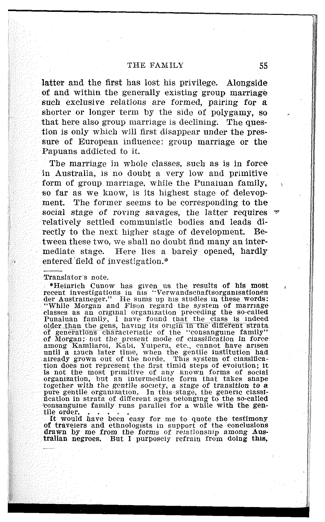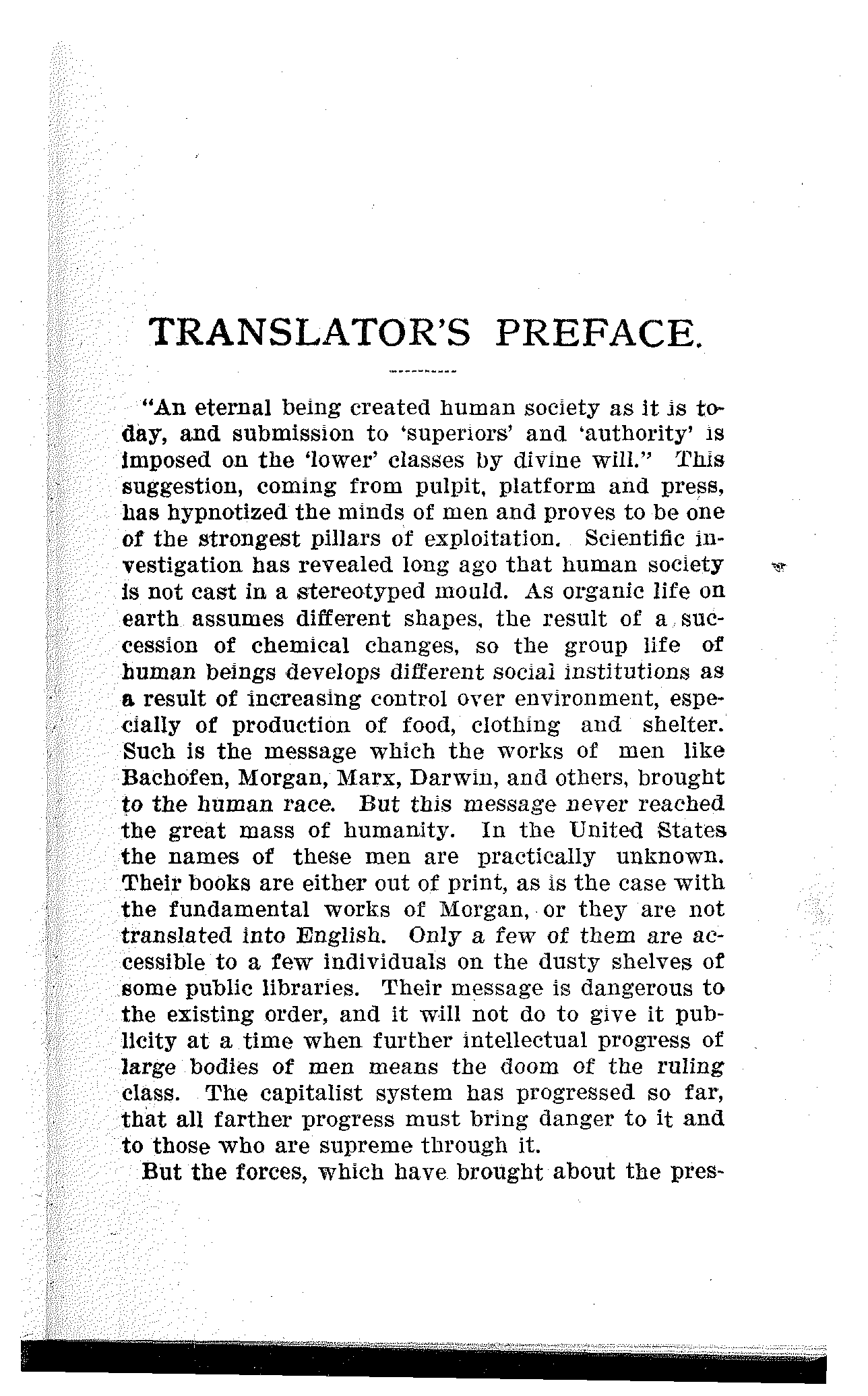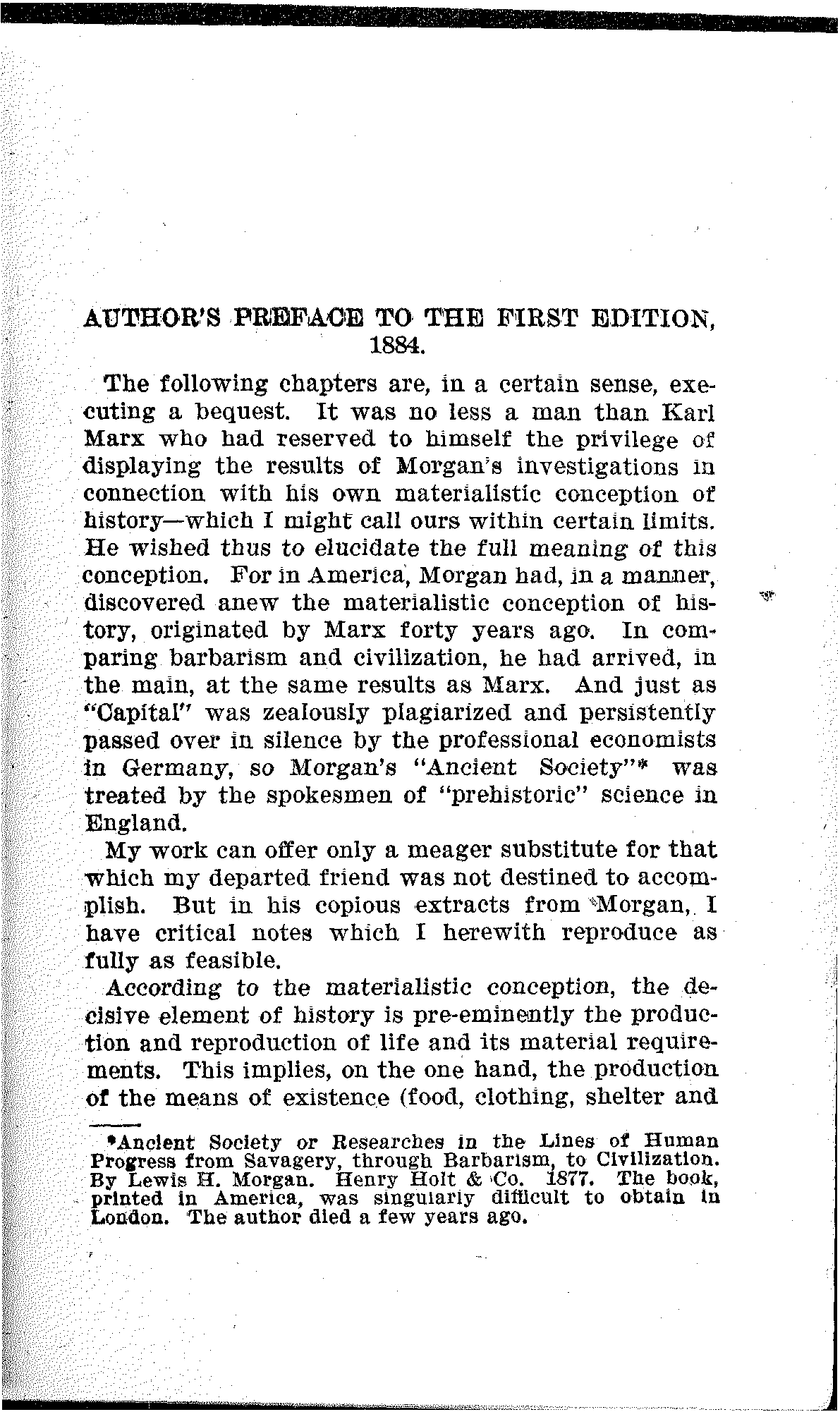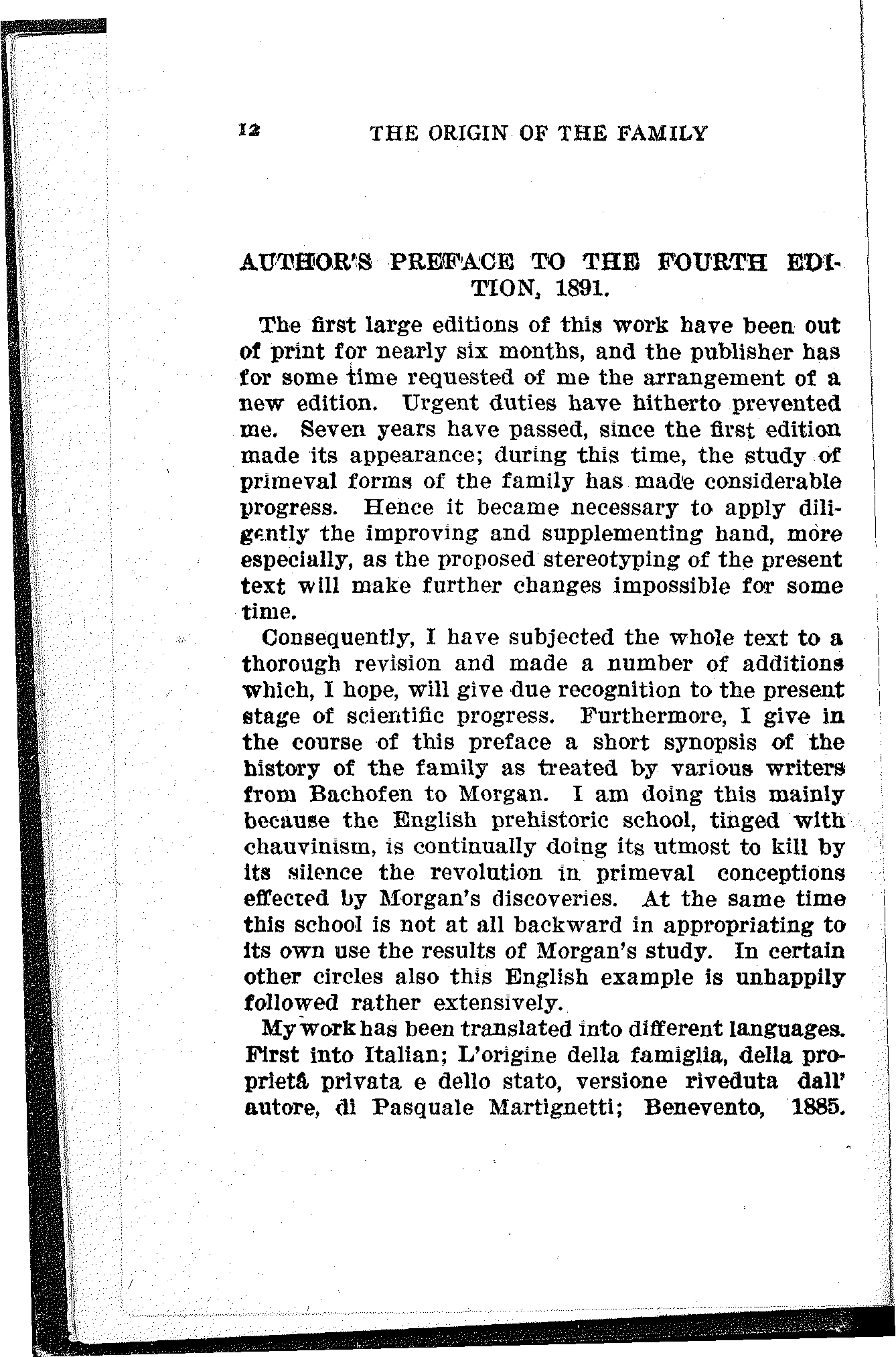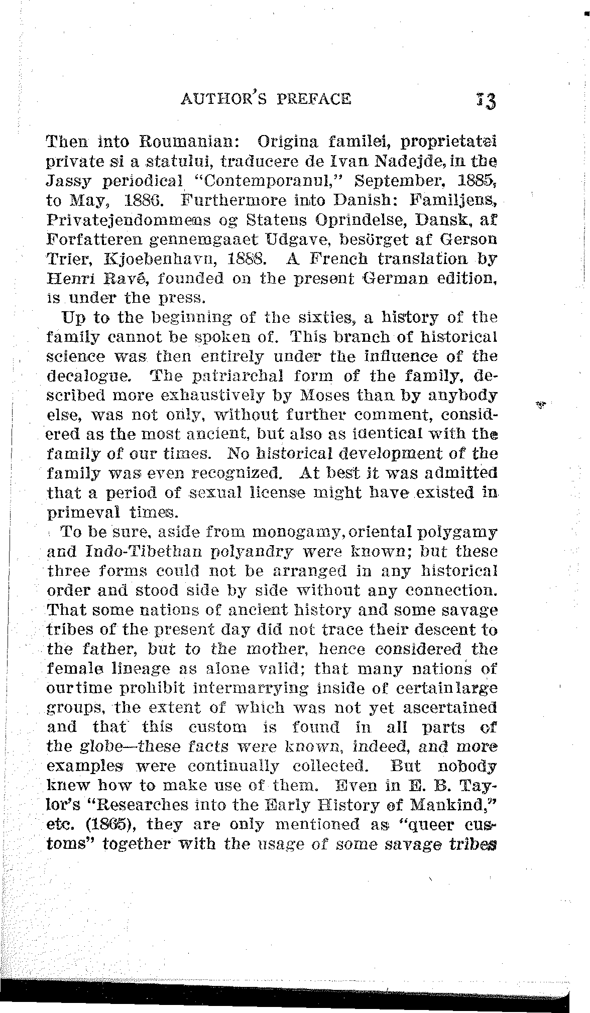 My work has been translated into different languages. First into Italian; L'origine della famiglia, della proprietá privata e dello stato, versione riveduta dall' autore, di Pasquale Martignetti; Benevento, 1885.[13] Then into Roumanian: Origina familei, proprietatei private si a statului, traducere de Ivan Nadejde, in the Jassy periodical "Contemporanul," September, 1885, to May, 1886. Furthermore into Danish: Familjens, Privatejendommens og Statens Oprindelse, Dansk, af Forfatteren gennemgaaet Udgave, besörget af Gerson Trier, Kjoebenhavn, 1888. A French translation by Henri Ravé, founded on the present German edition, is under the press.