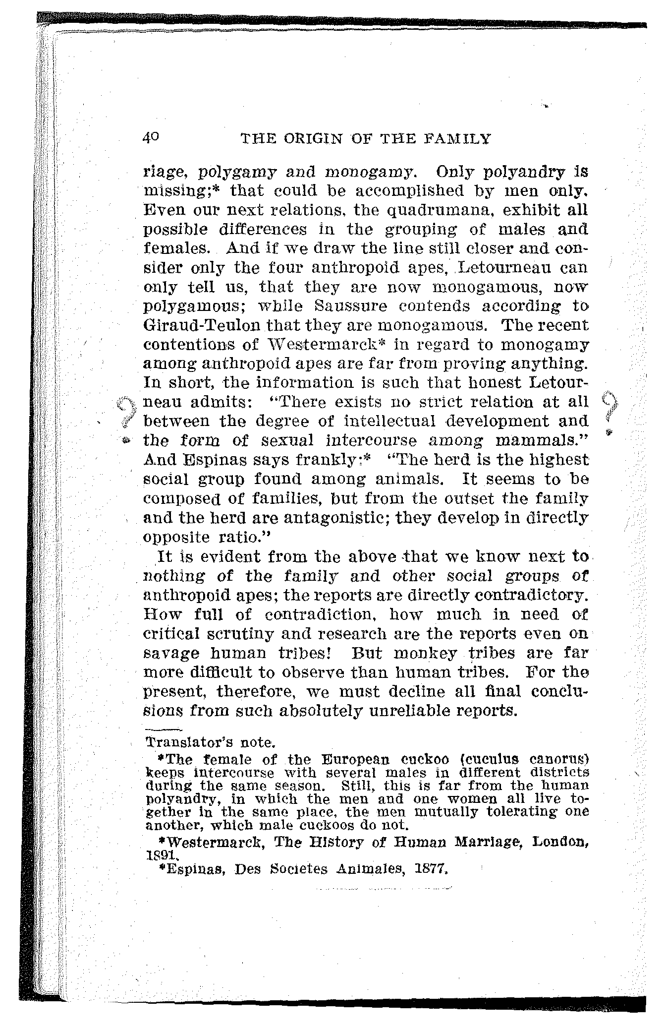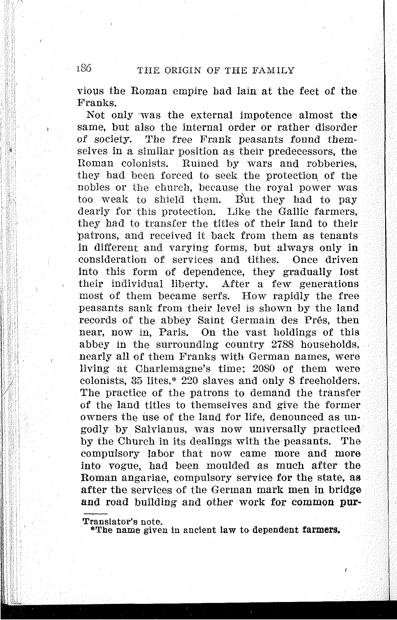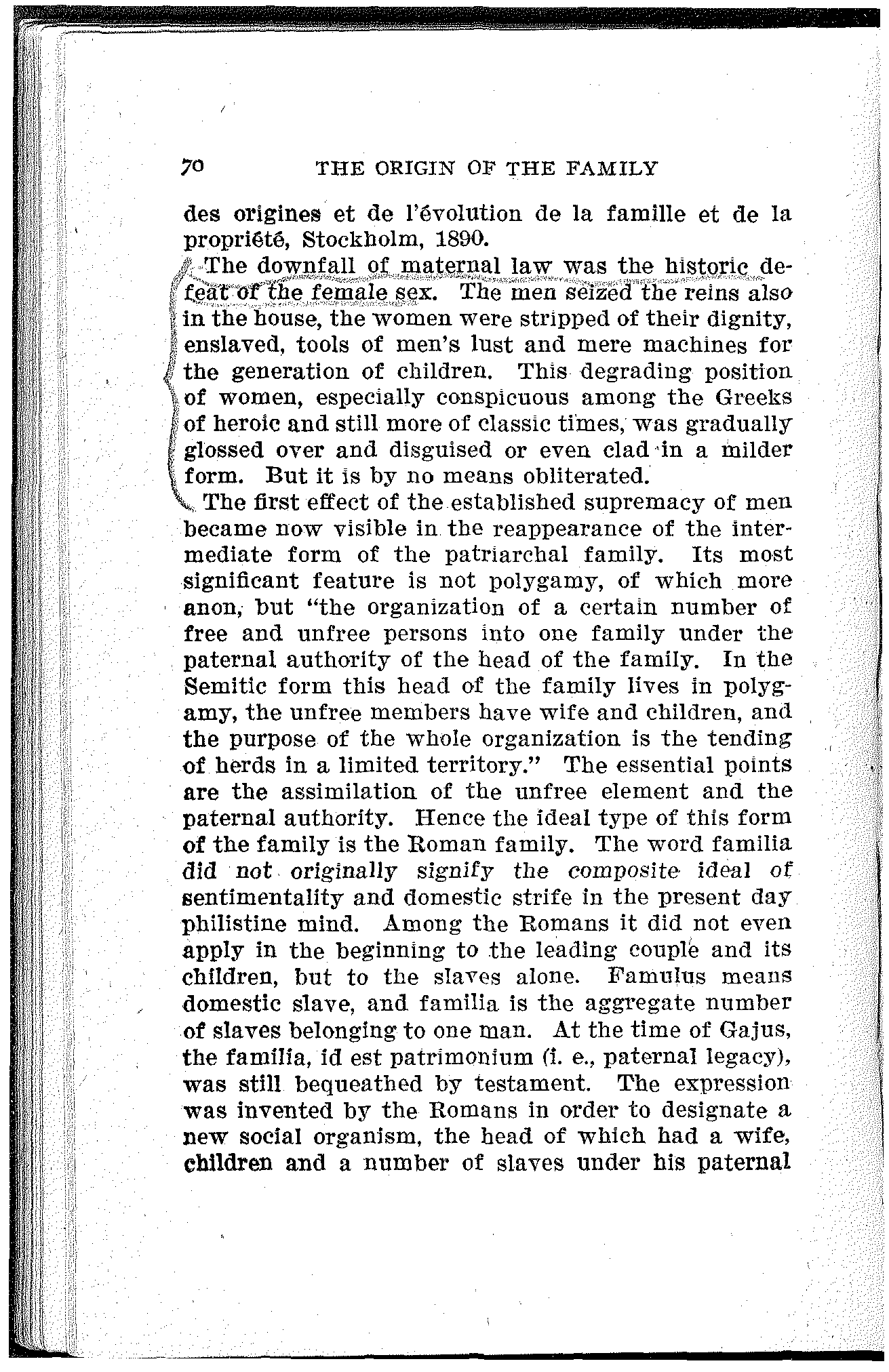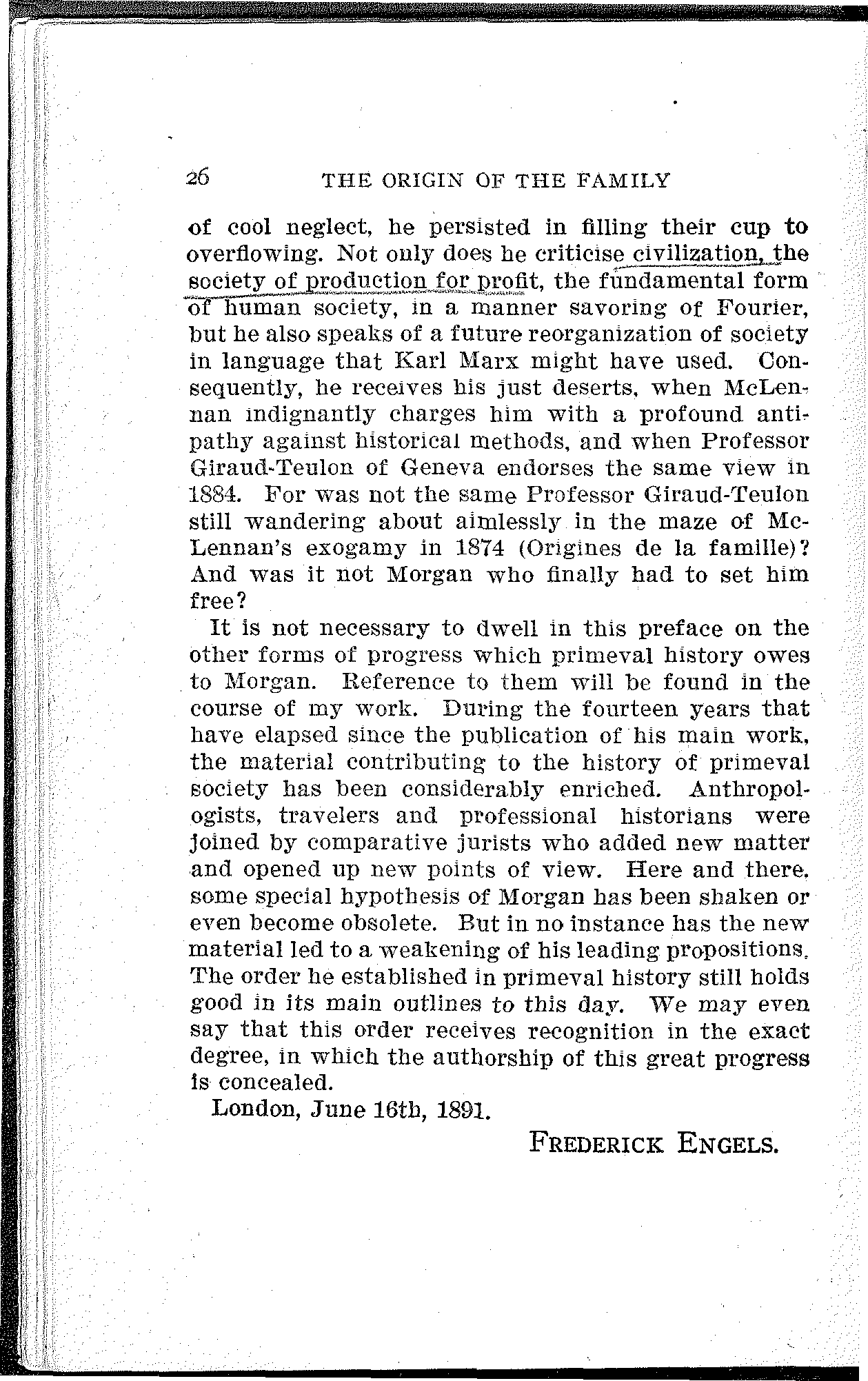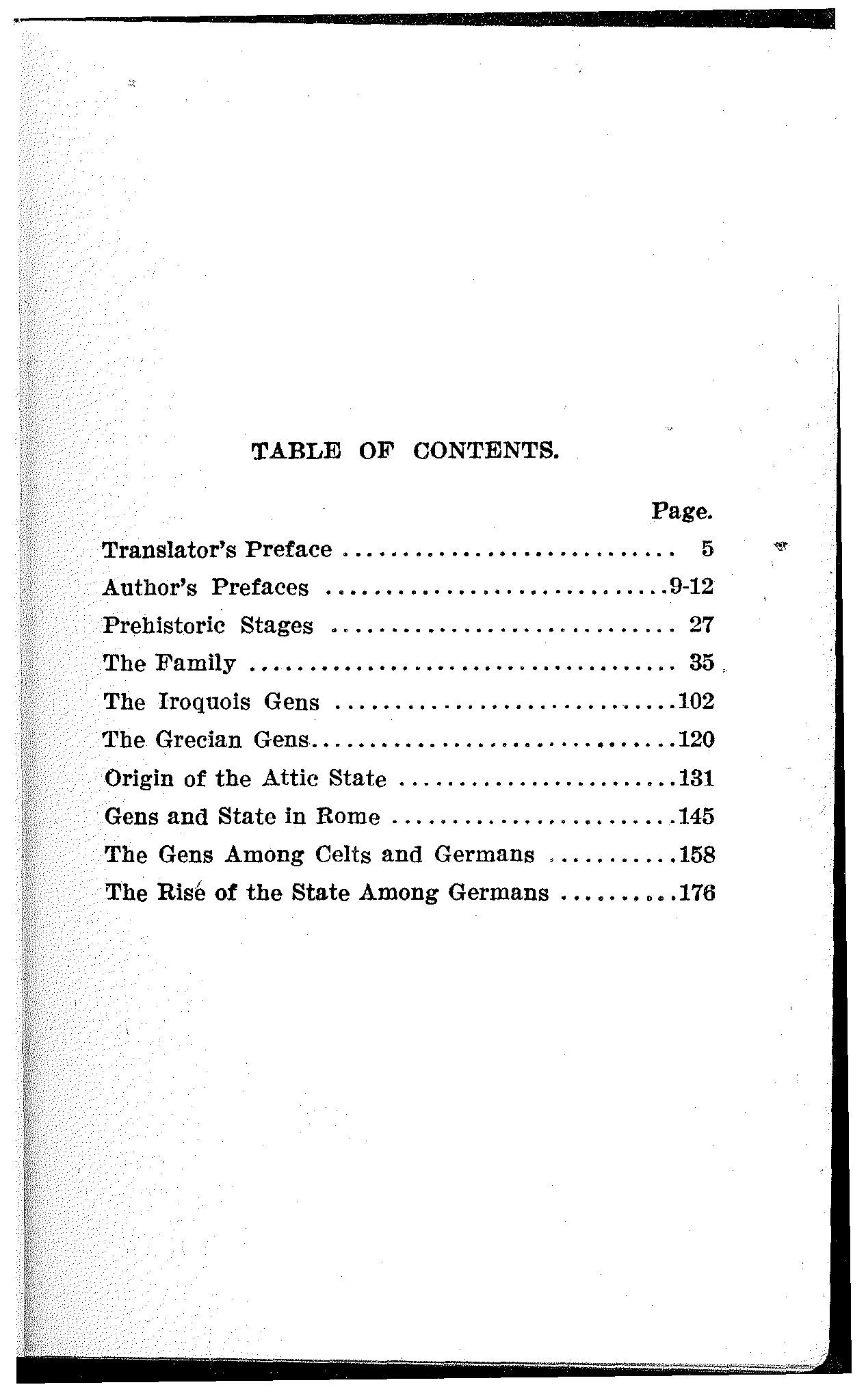 My work has been translated into different languages. First into Italian; L'origine della famiglia, della proprietá privata e dello stato, versione riveduta dall' autore, di Pasquale Martignetti; Benevento, 1885.[13] Then into Roumanian: Origina familei, proprietatei private si a statului, traducere de Ivan Nadejde, in the Jassy periodical "Contemporanul," September, 1885, to May, 1886. Furthermore into Danish: Familjens, Privatejendommens og Statens Oprindelse, Dansk, af Forfatteren gennemgaaet Udgave, besörget af Gerson Trier, Kjoebenhavn, 1888. A French translation by Henri Ravé, founded on the present German edition, is under the press.