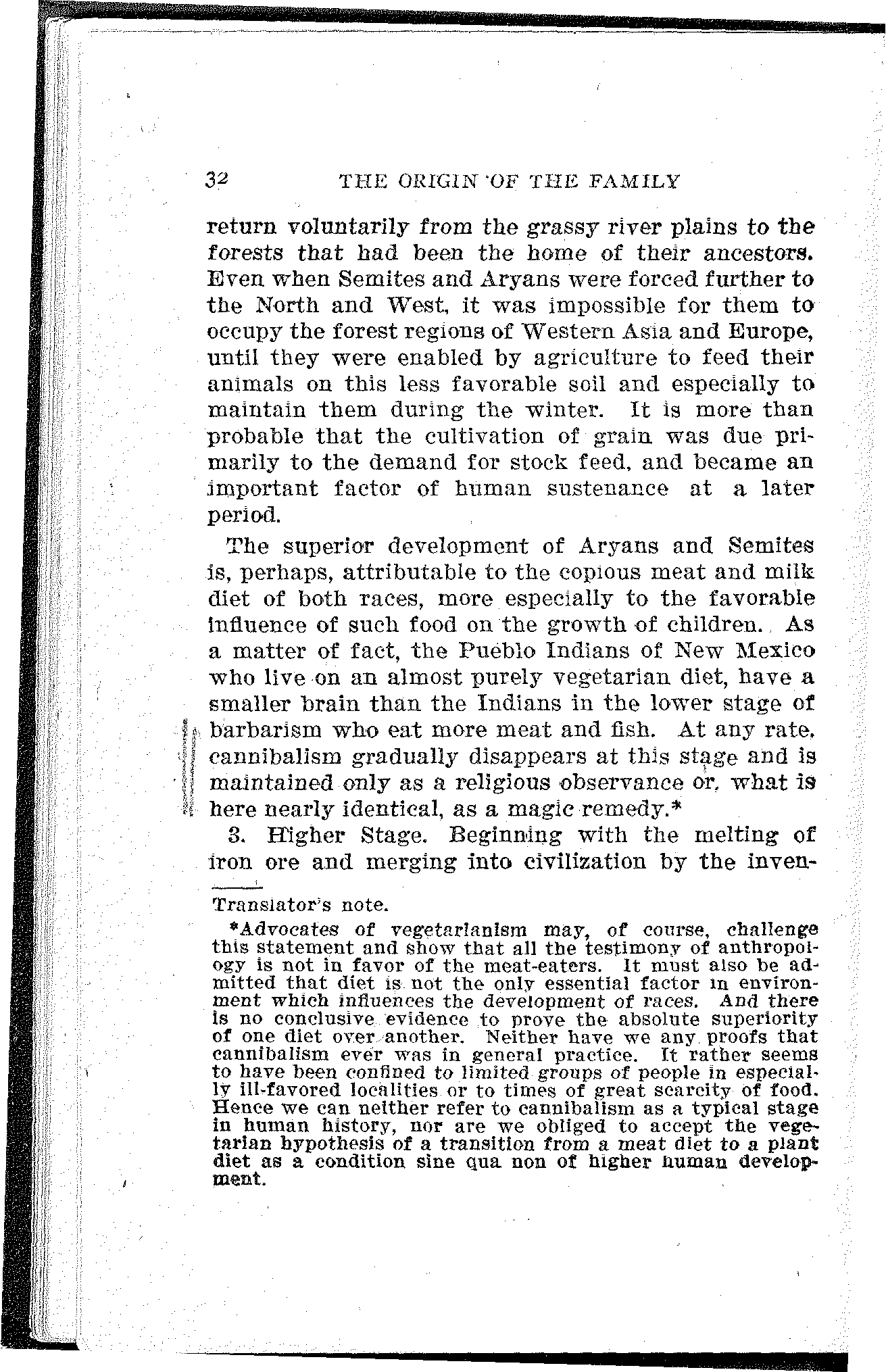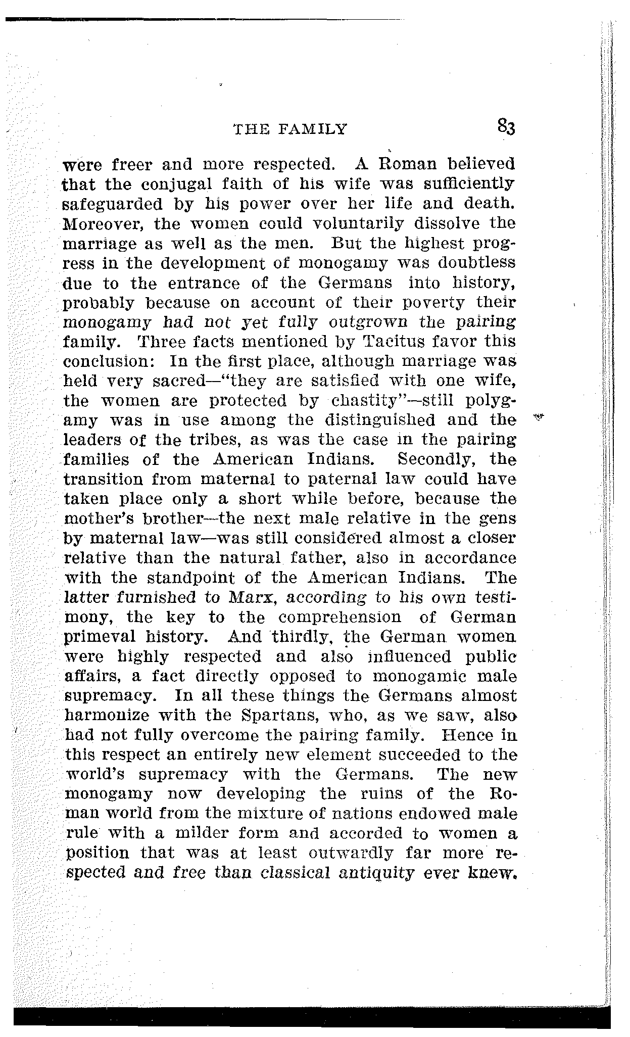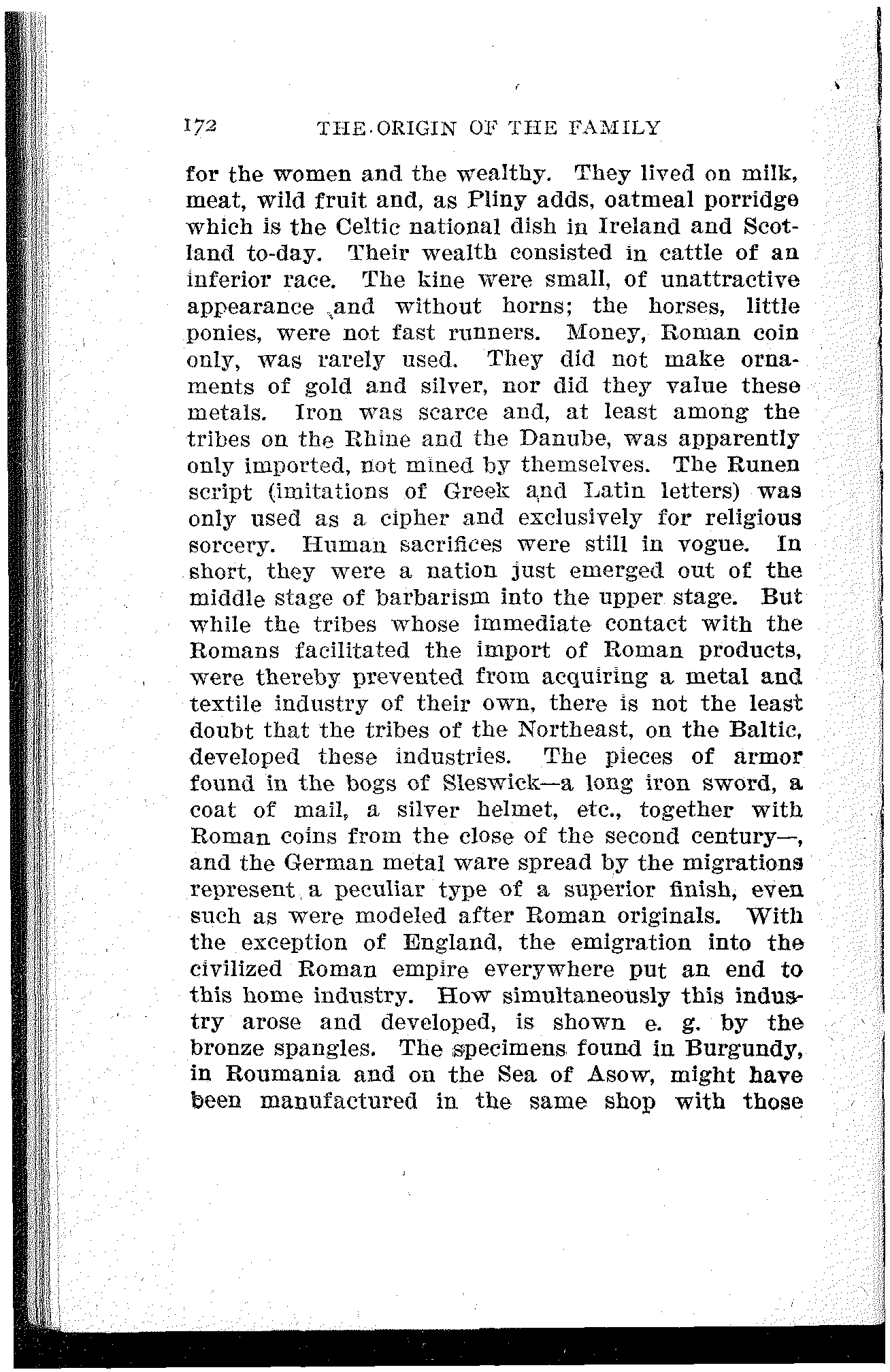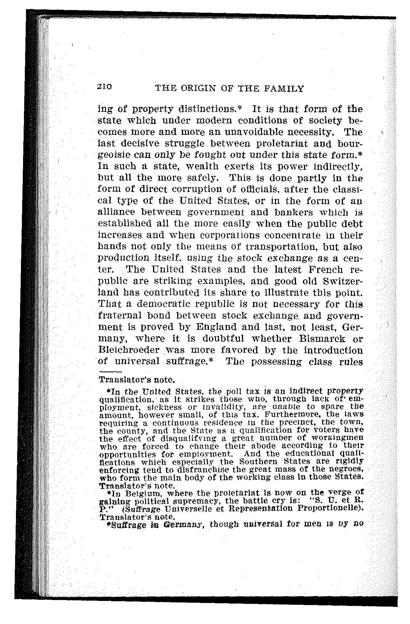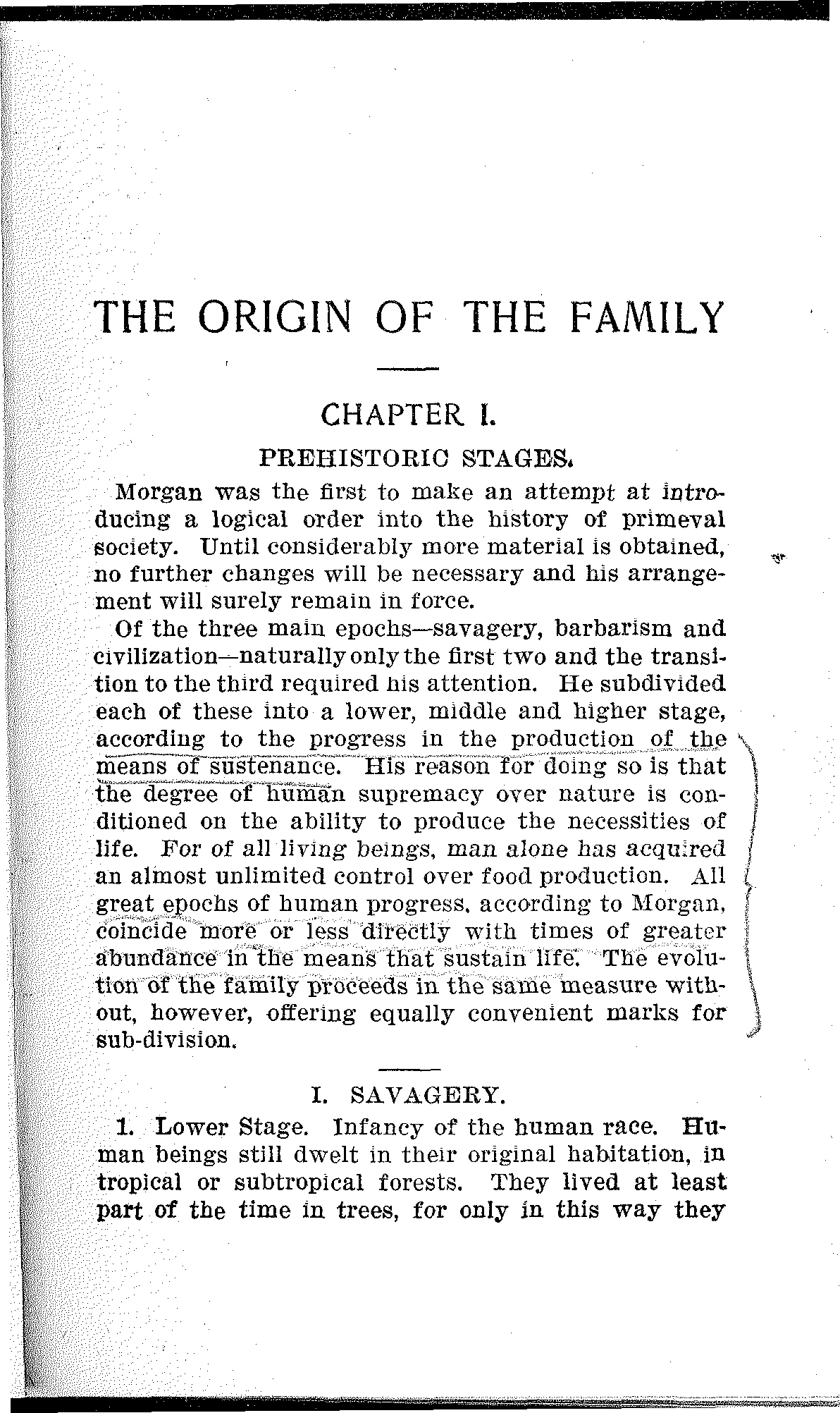 My work has been translated into different languages. First into Italian; L'origine della famiglia, della proprietá privata e dello stato, versione riveduta dall' autore, di Pasquale Martignetti; Benevento, 1885.[13] Then into Roumanian: Origina familei, proprietatei private si a statului, traducere de Ivan Nadejde, in the Jassy periodical "Contemporanul," September, 1885, to May, 1886. Furthermore into Danish: Familjens, Privatejendommens og Statens Oprindelse, Dansk, af Forfatteren gennemgaaet Udgave, besörget af Gerson Trier, Kjoebenhavn, 1888. A French translation by Henri Ravé, founded on the present German edition, is under the press.