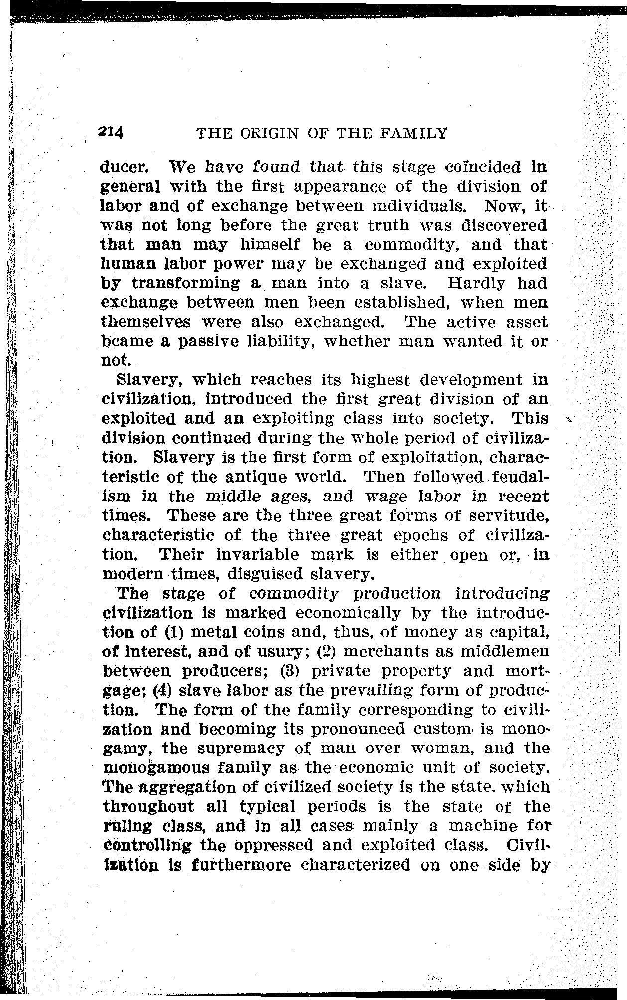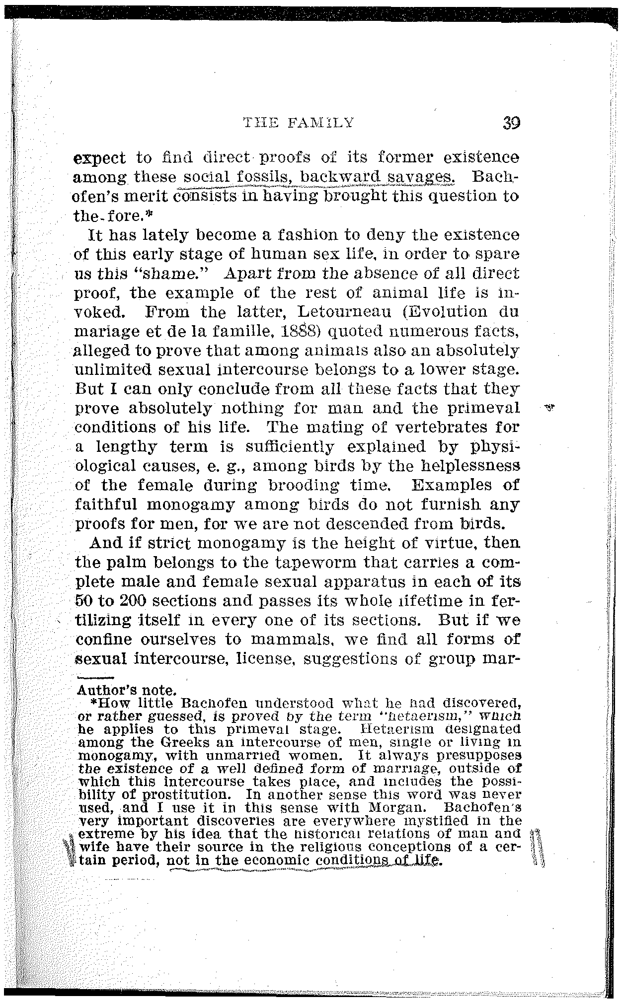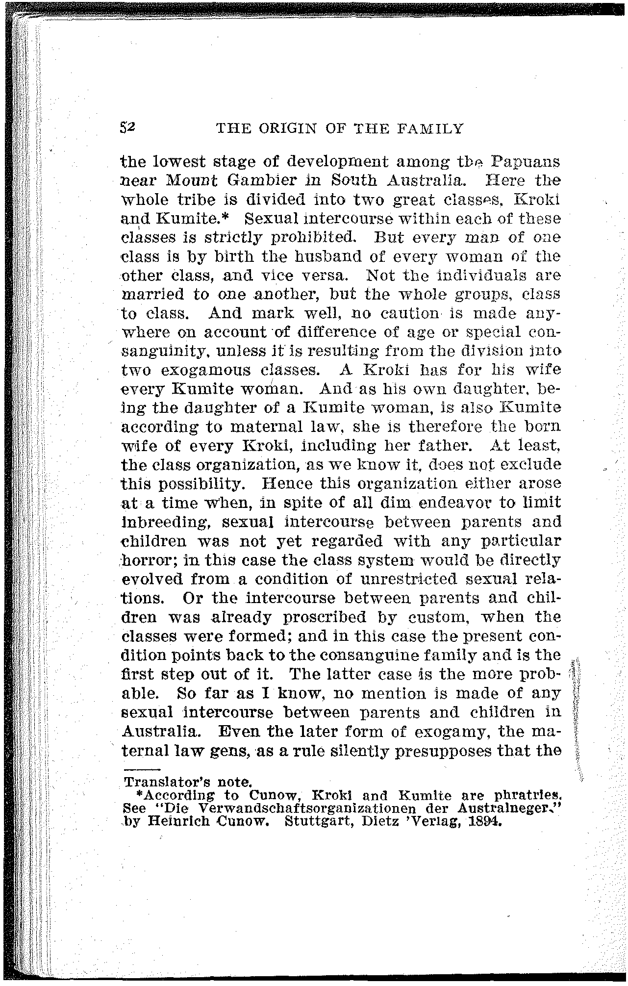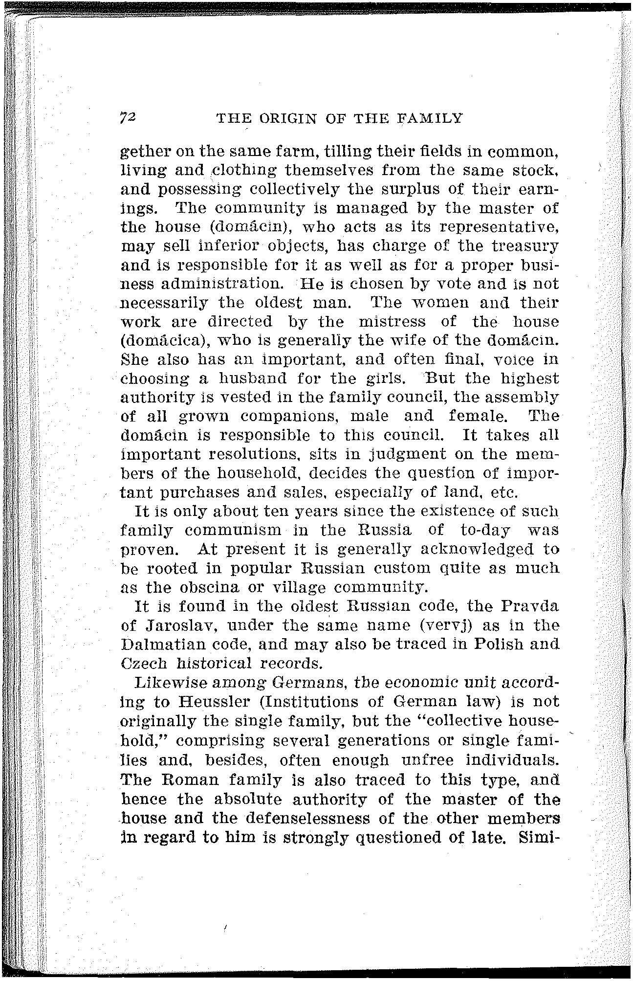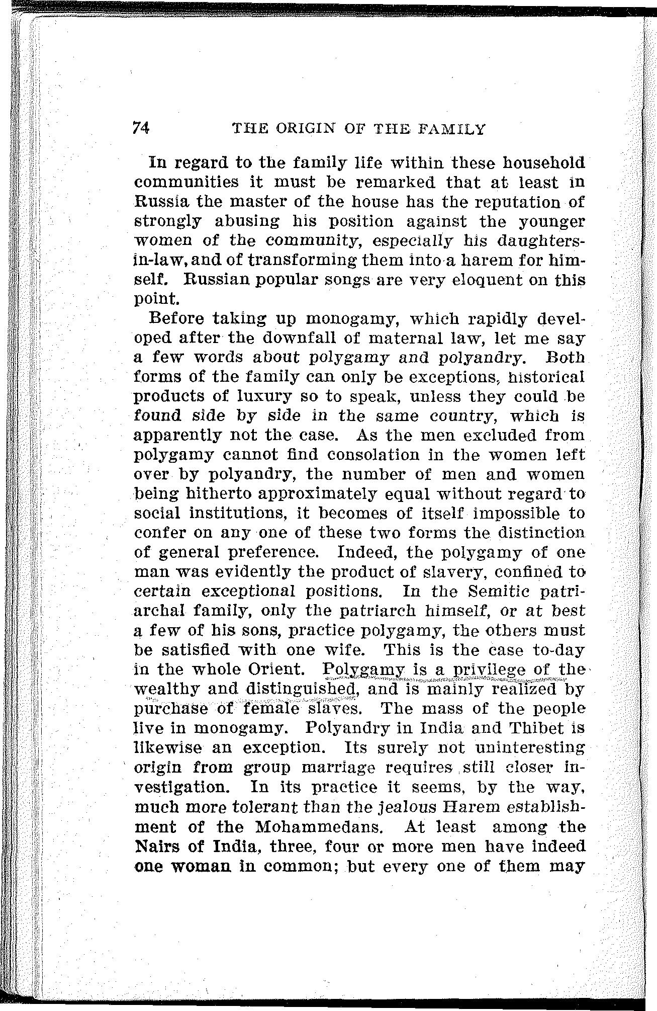 My work has been translated into different languages. First into Italian; L'origine della famiglia, della proprietá privata e dello stato, versione riveduta dall' autore, di Pasquale Martignetti; Benevento, 1885.[13] Then into Roumanian: Origina familei, proprietatei private si a statului, traducere de Ivan Nadejde, in the Jassy periodical "Contemporanul," September, 1885, to May, 1886. Furthermore into Danish: Familjens, Privatejendommens og Statens Oprindelse, Dansk, af Forfatteren gennemgaaet Udgave, besörget af Gerson Trier, Kjoebenhavn, 1888. A French translation by Henri Ravé, founded on the present German edition, is under the press.