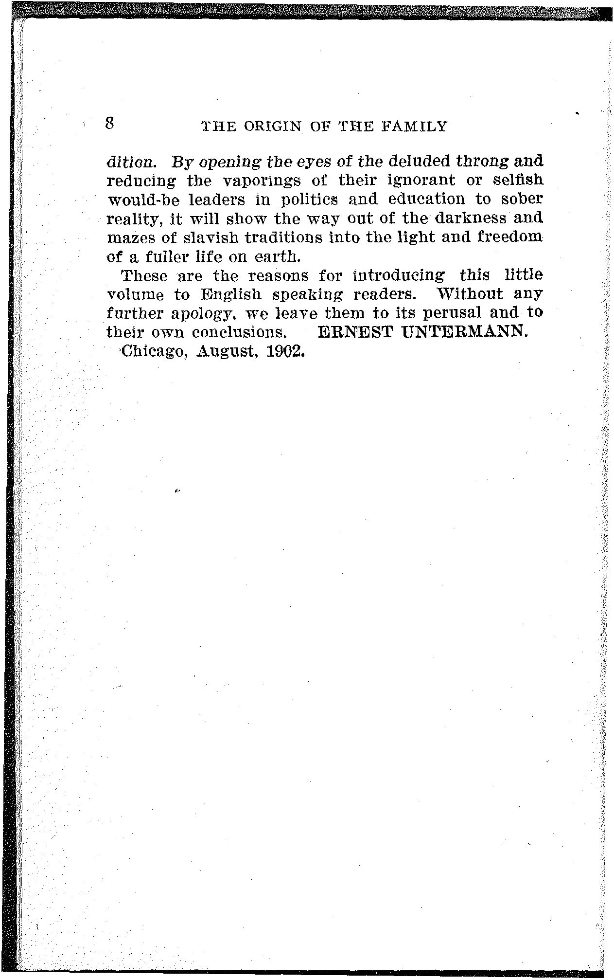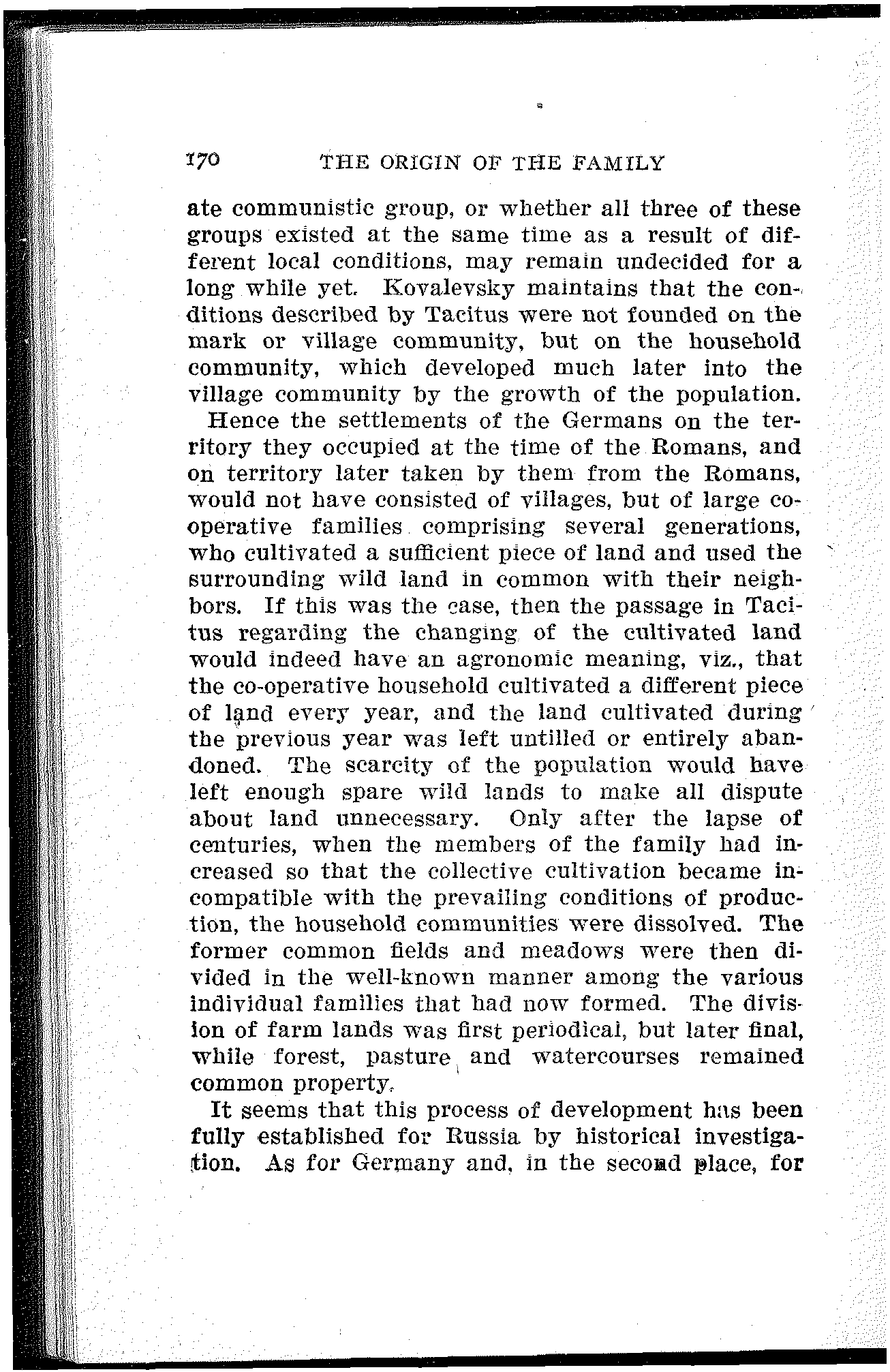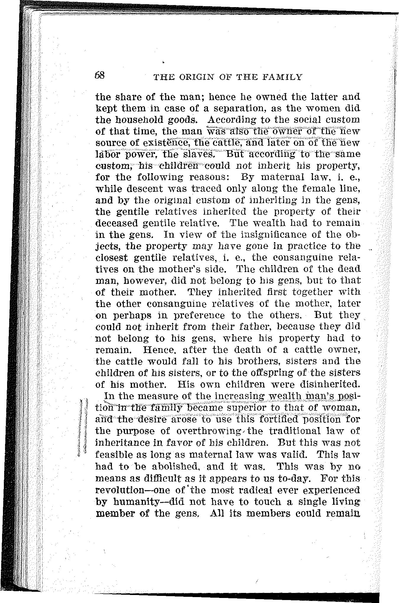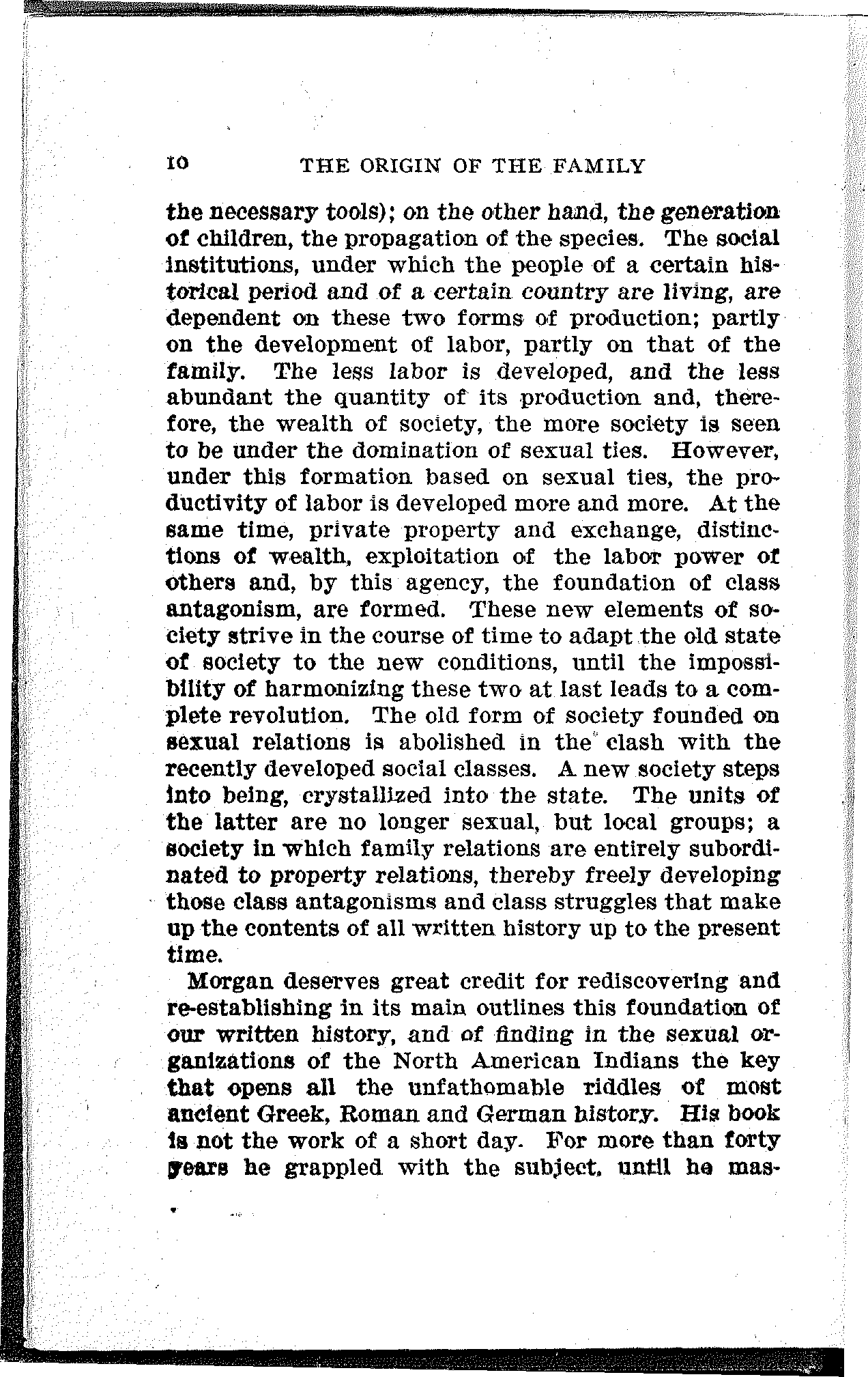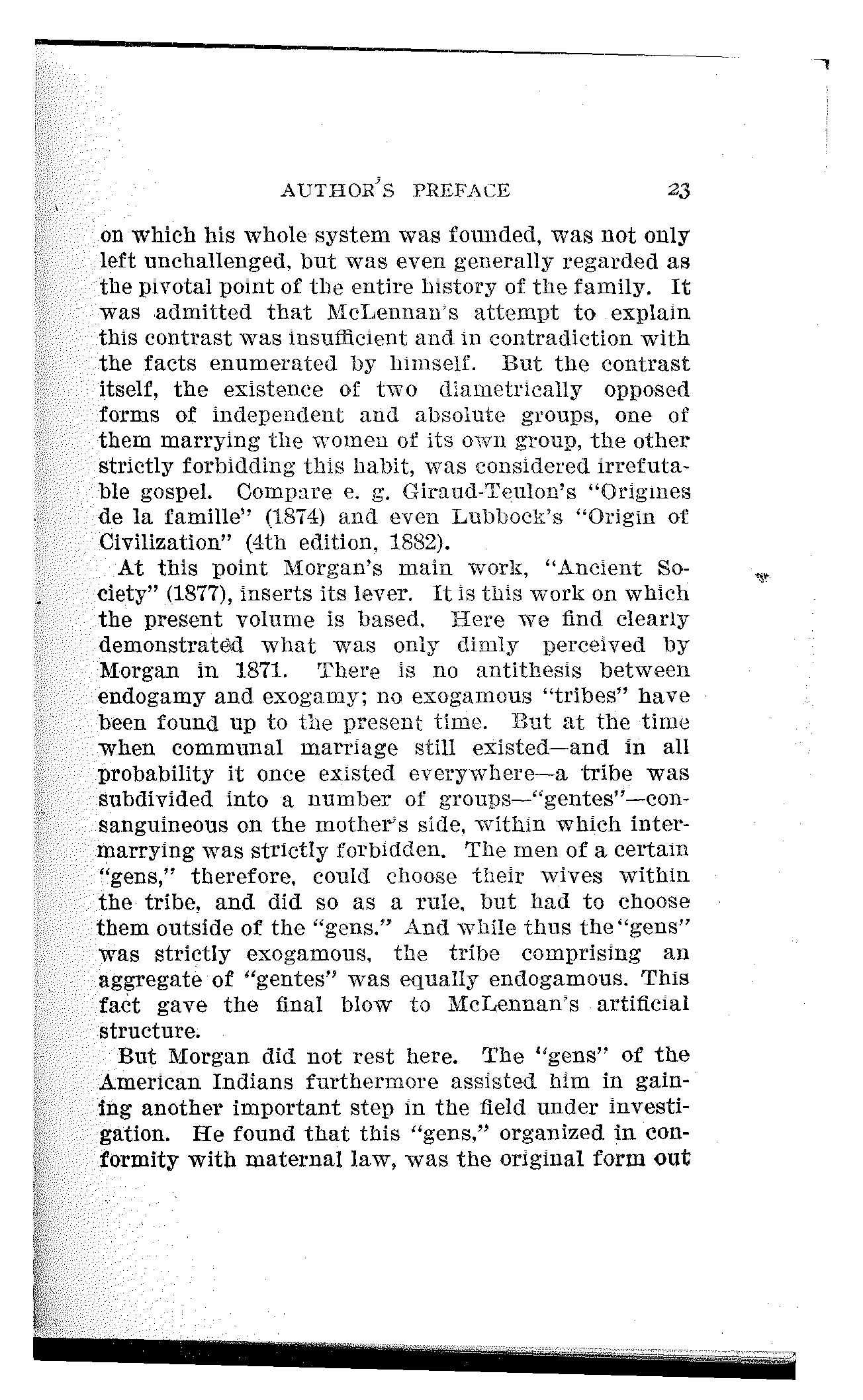 My work has been translated into different languages. First into Italian; L'origine della famiglia, della proprietá privata e dello stato, versione riveduta dall' autore, di Pasquale Martignetti; Benevento, 1885.[13] Then into Roumanian: Origina familei, proprietatei private si a statului, traducere de Ivan Nadejde, in the Jassy periodical "Contemporanul," September, 1885, to May, 1886. Furthermore into Danish: Familjens, Privatejendommens og Statens Oprindelse, Dansk, af Forfatteren gennemgaaet Udgave, besörget af Gerson Trier, Kjoebenhavn, 1888. A French translation by Henri Ravé, founded on the present German edition, is under the press.