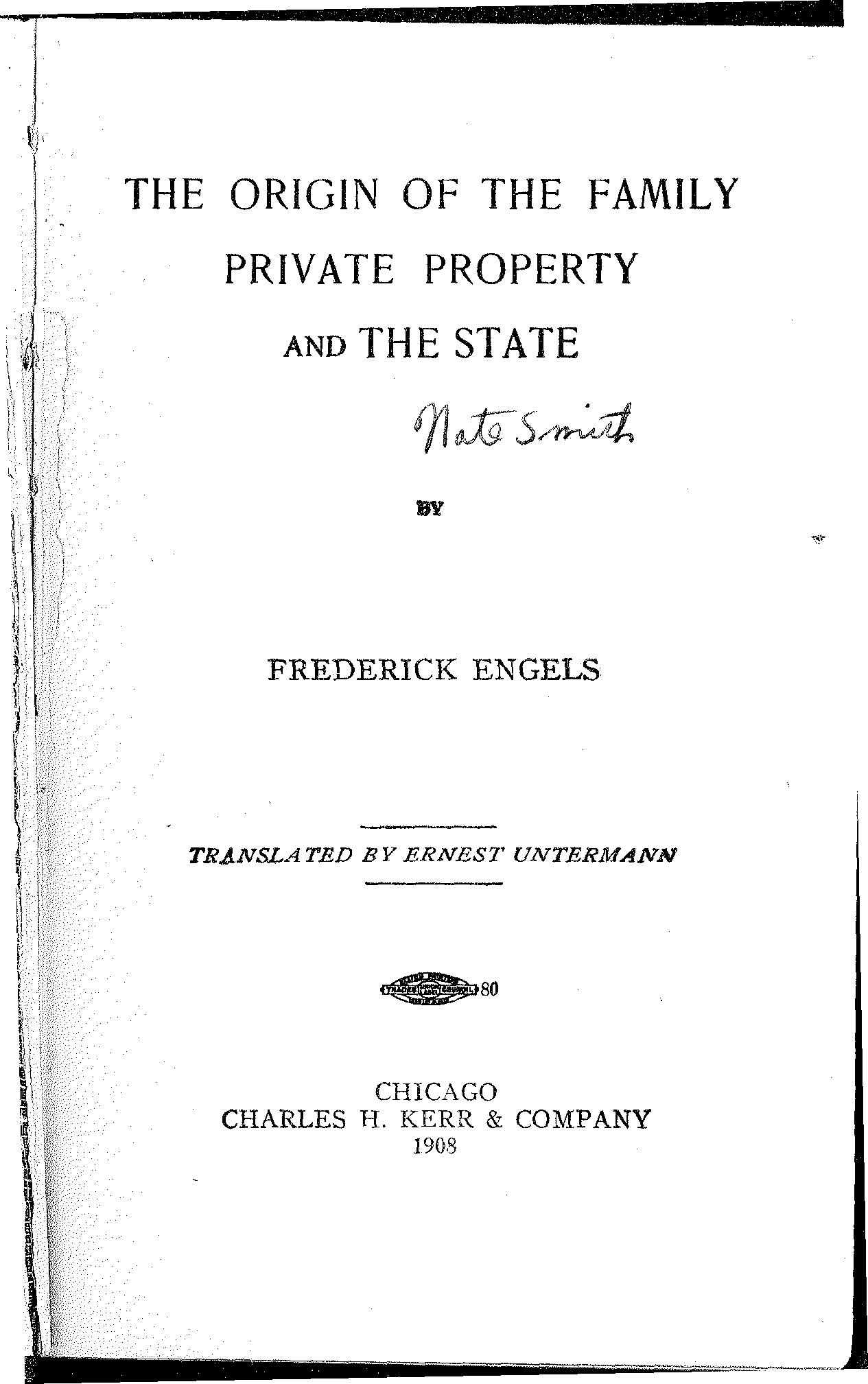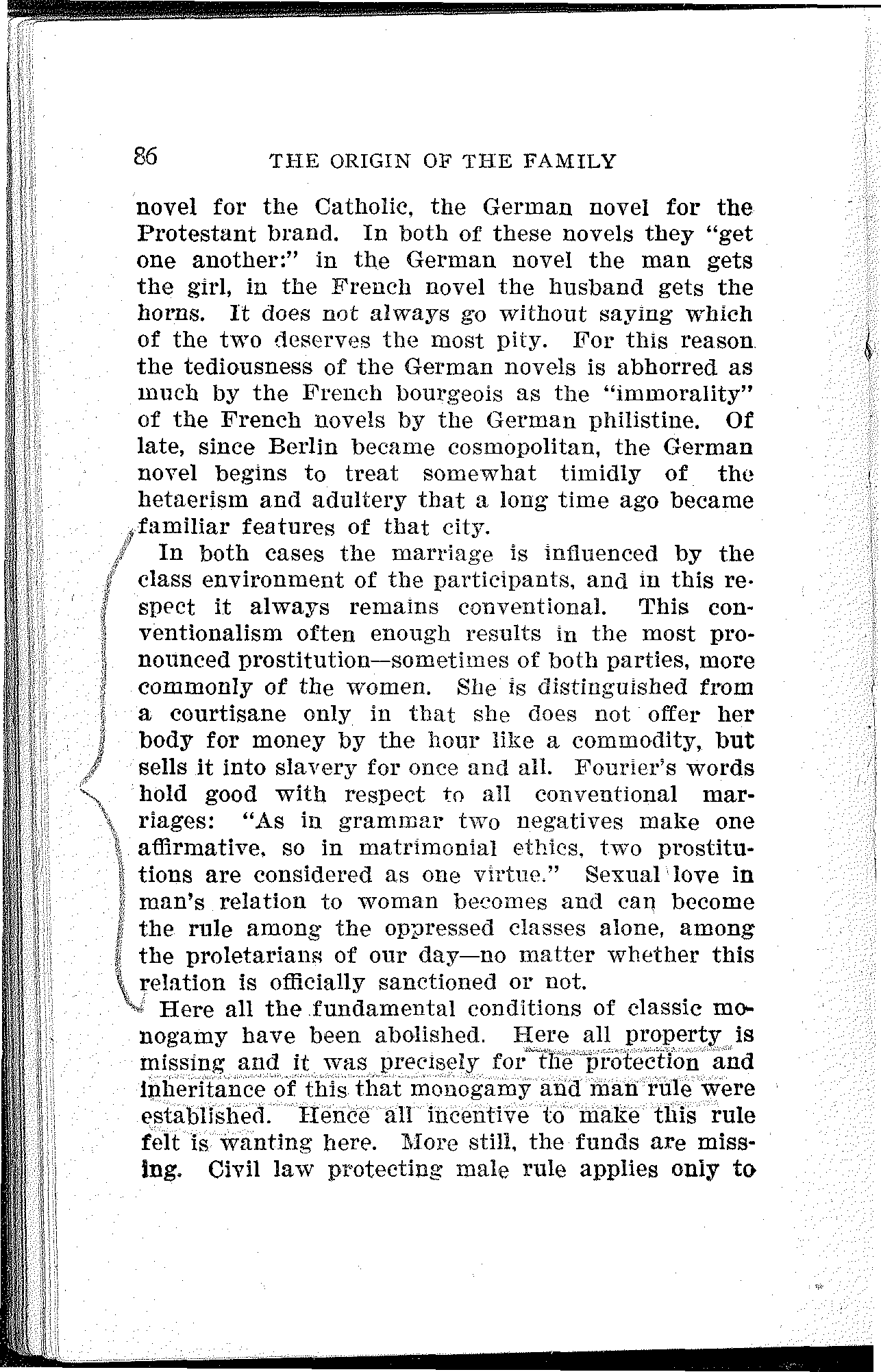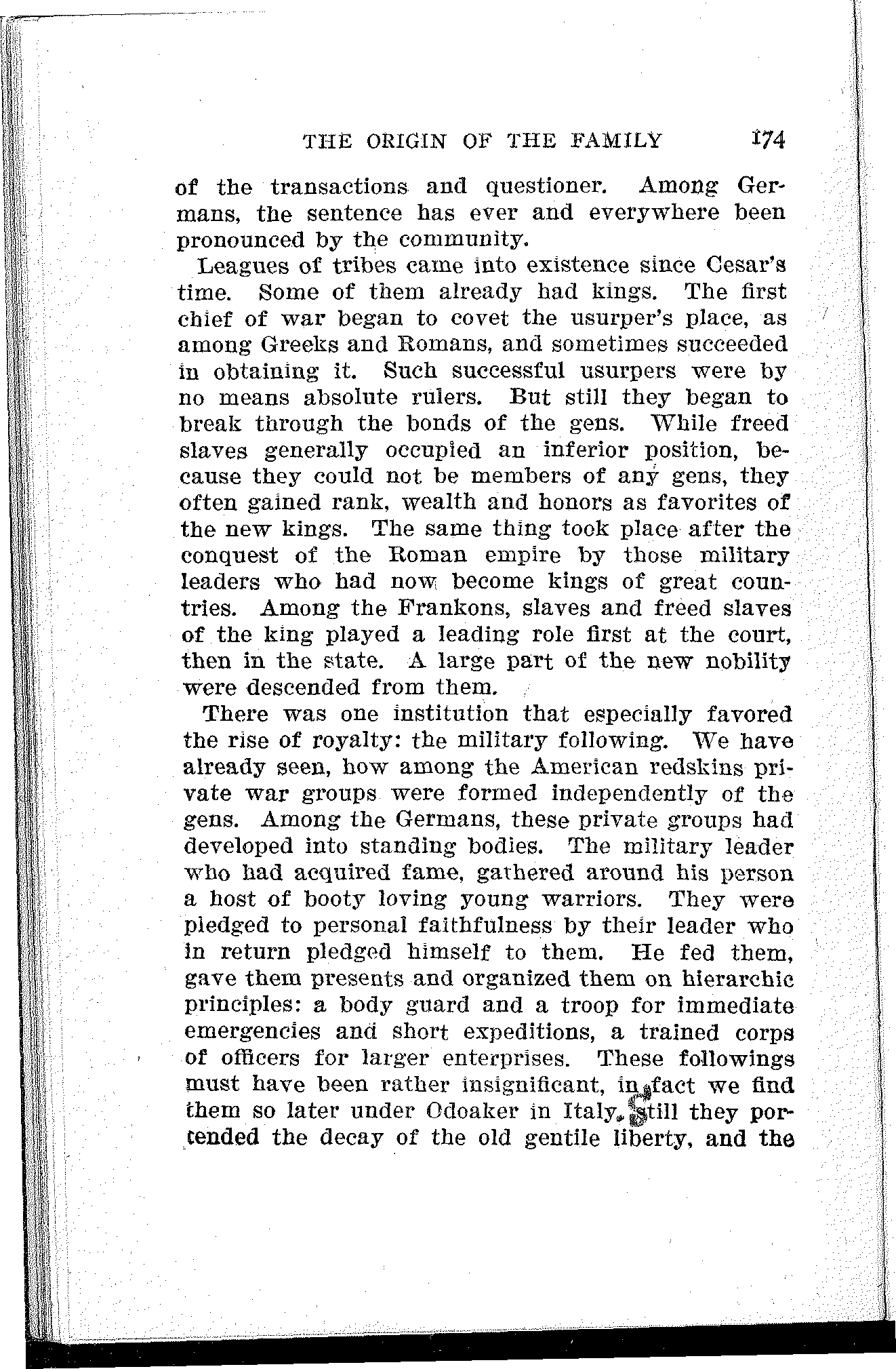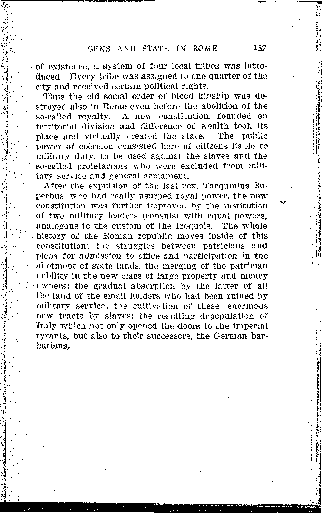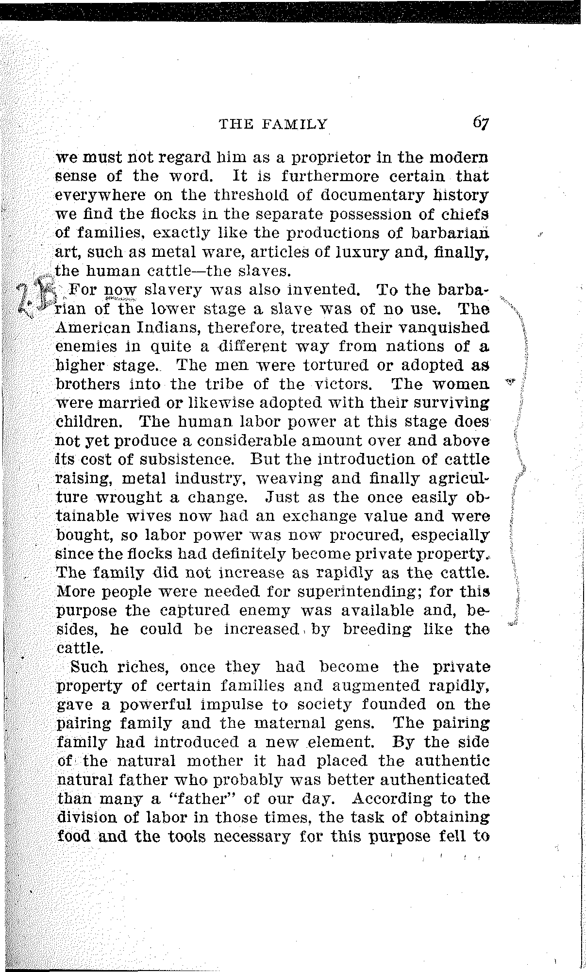 My work has been translated into different languages. First into Italian; L'origine della famiglia, della proprietá privata e dello stato, versione riveduta dall' autore, di Pasquale Martignetti; Benevento, 1885.[13] Then into Roumanian: Origina familei, proprietatei private si a statului, traducere de Ivan Nadejde, in the Jassy periodical "Contemporanul," September, 1885, to May, 1886. Furthermore into Danish: Familjens, Privatejendommens og Statens Oprindelse, Dansk, af Forfatteren gennemgaaet Udgave, besörget af Gerson Trier, Kjoebenhavn, 1888. A French translation by Henri Ravé, founded on the present German edition, is under the press.