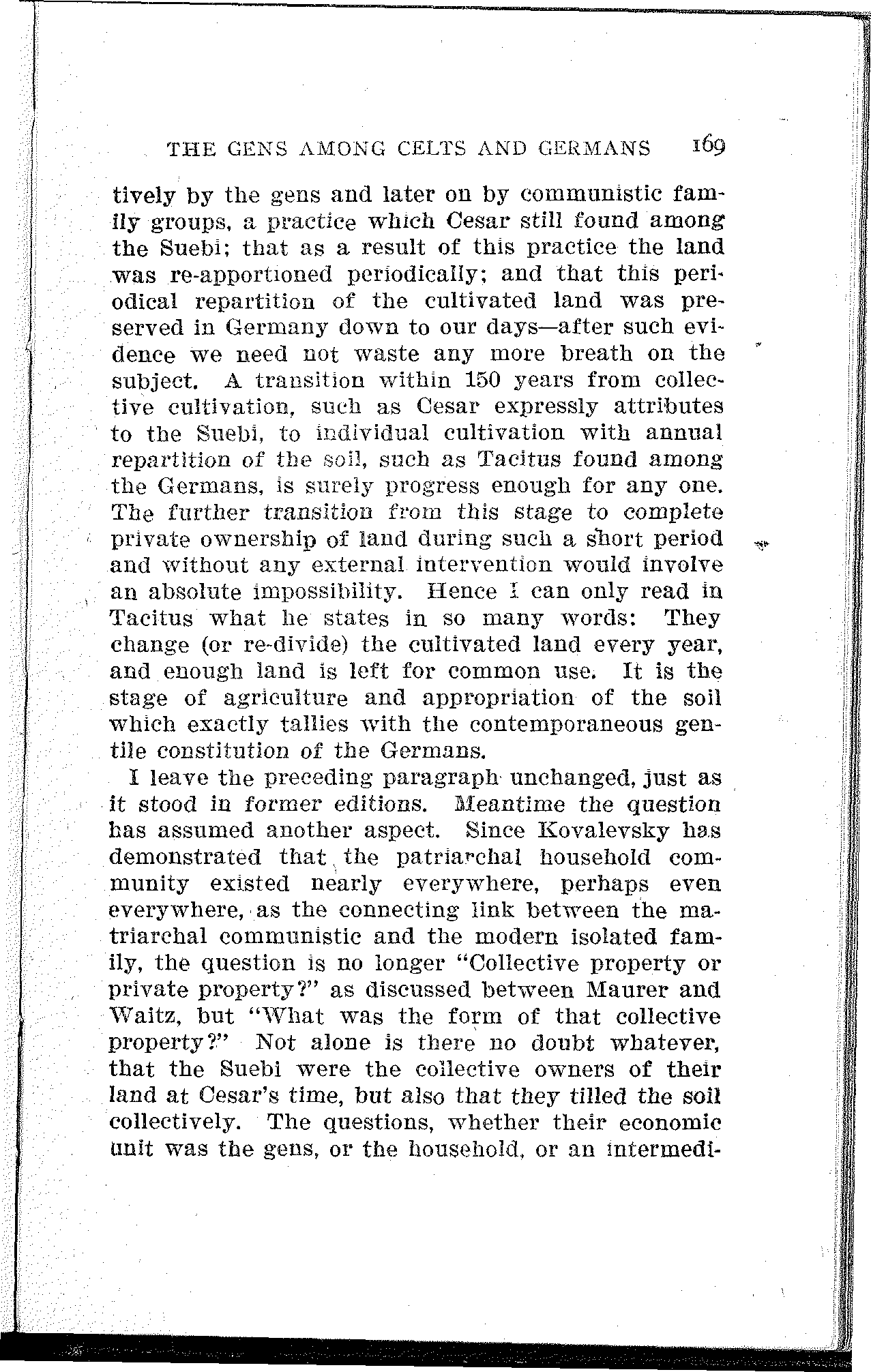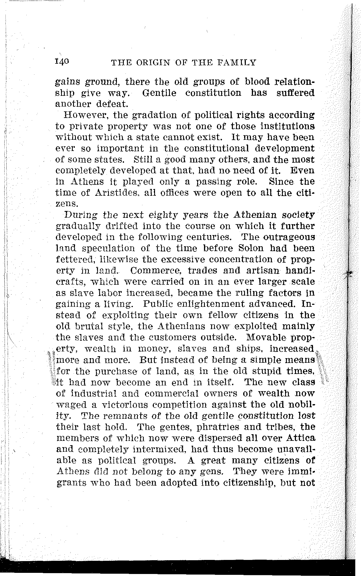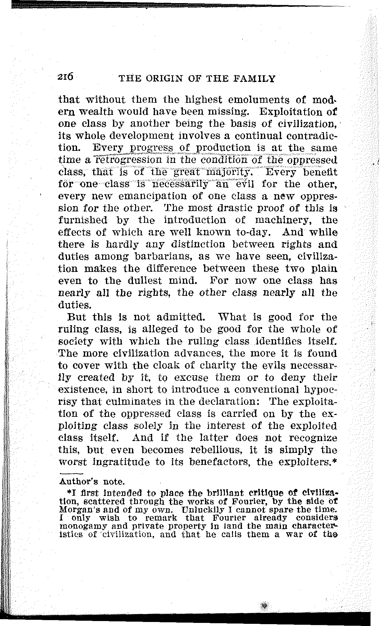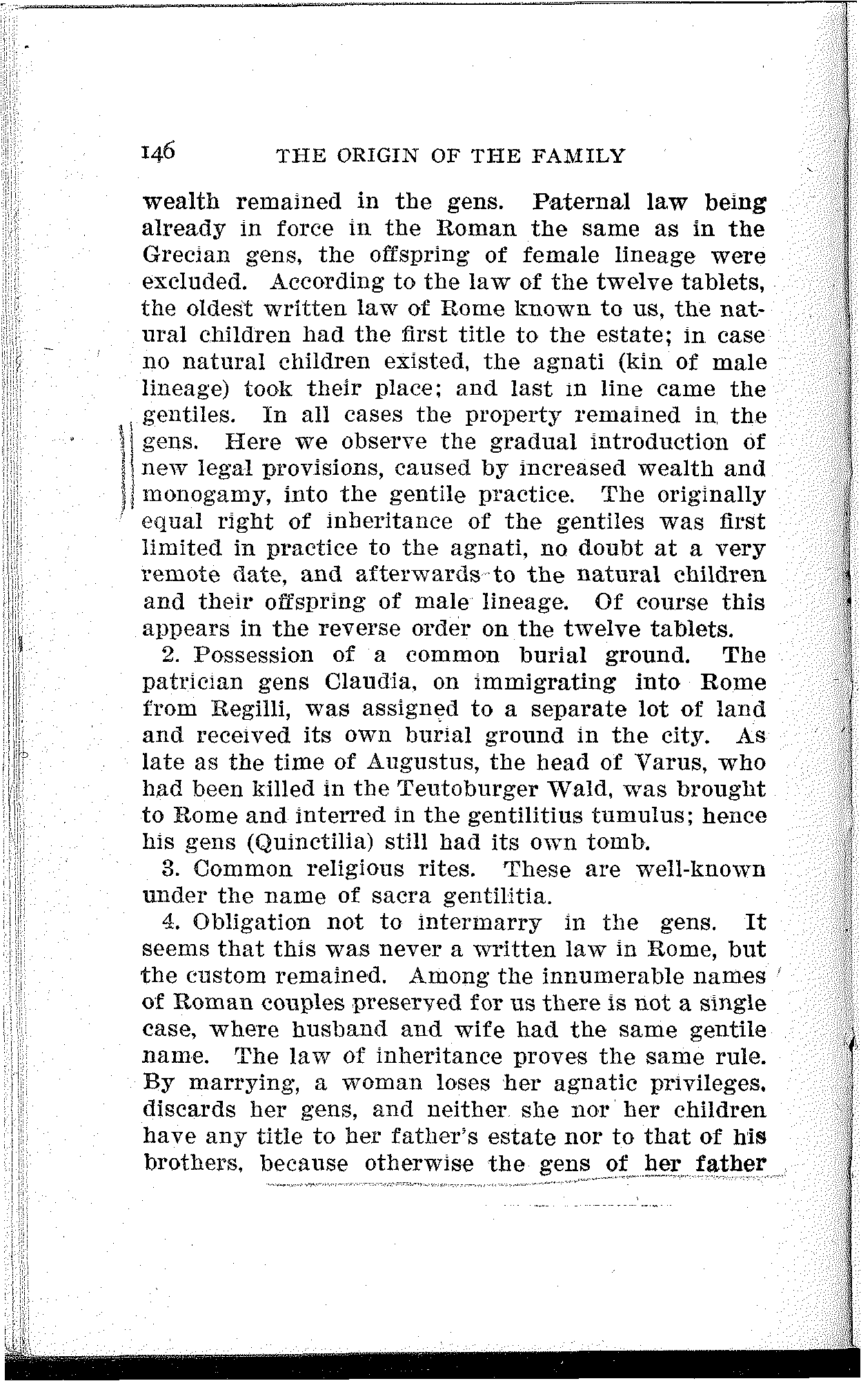 My work has been translated into different languages. First into Italian; L'origine della famiglia, della proprietá privata e dello stato, versione riveduta dall' autore, di Pasquale Martignetti; Benevento, 1885.[13] Then into Roumanian: Origina familei, proprietatei private si a statului, traducere de Ivan Nadejde, in the Jassy periodical "Contemporanul," September, 1885, to May, 1886. Furthermore into Danish: Familjens, Privatejendommens og Statens Oprindelse, Dansk, af Forfatteren gennemgaaet Udgave, besörget af Gerson Trier, Kjoebenhavn, 1888. A French translation by Henri Ravé, founded on the present German edition, is under the press.