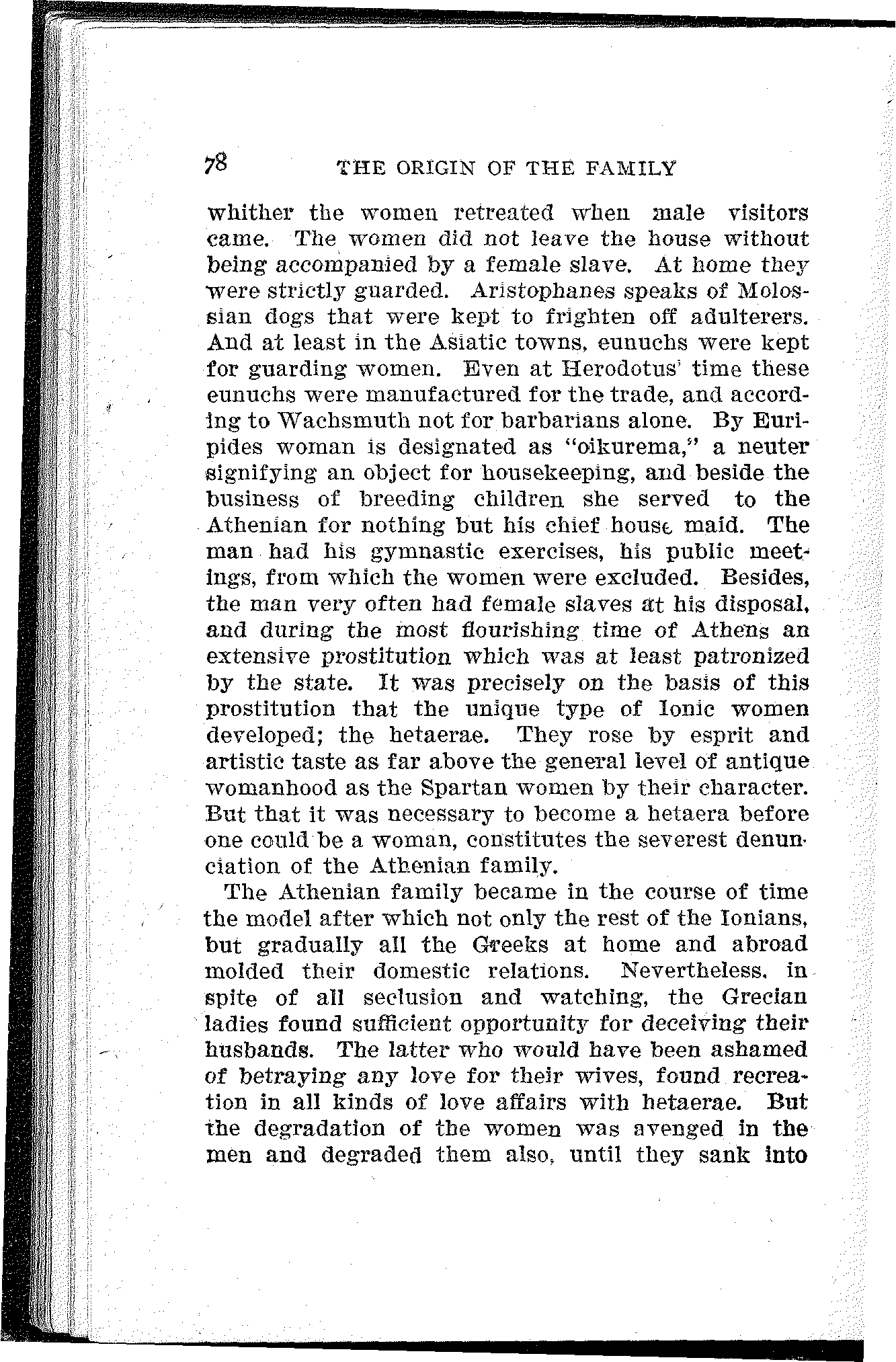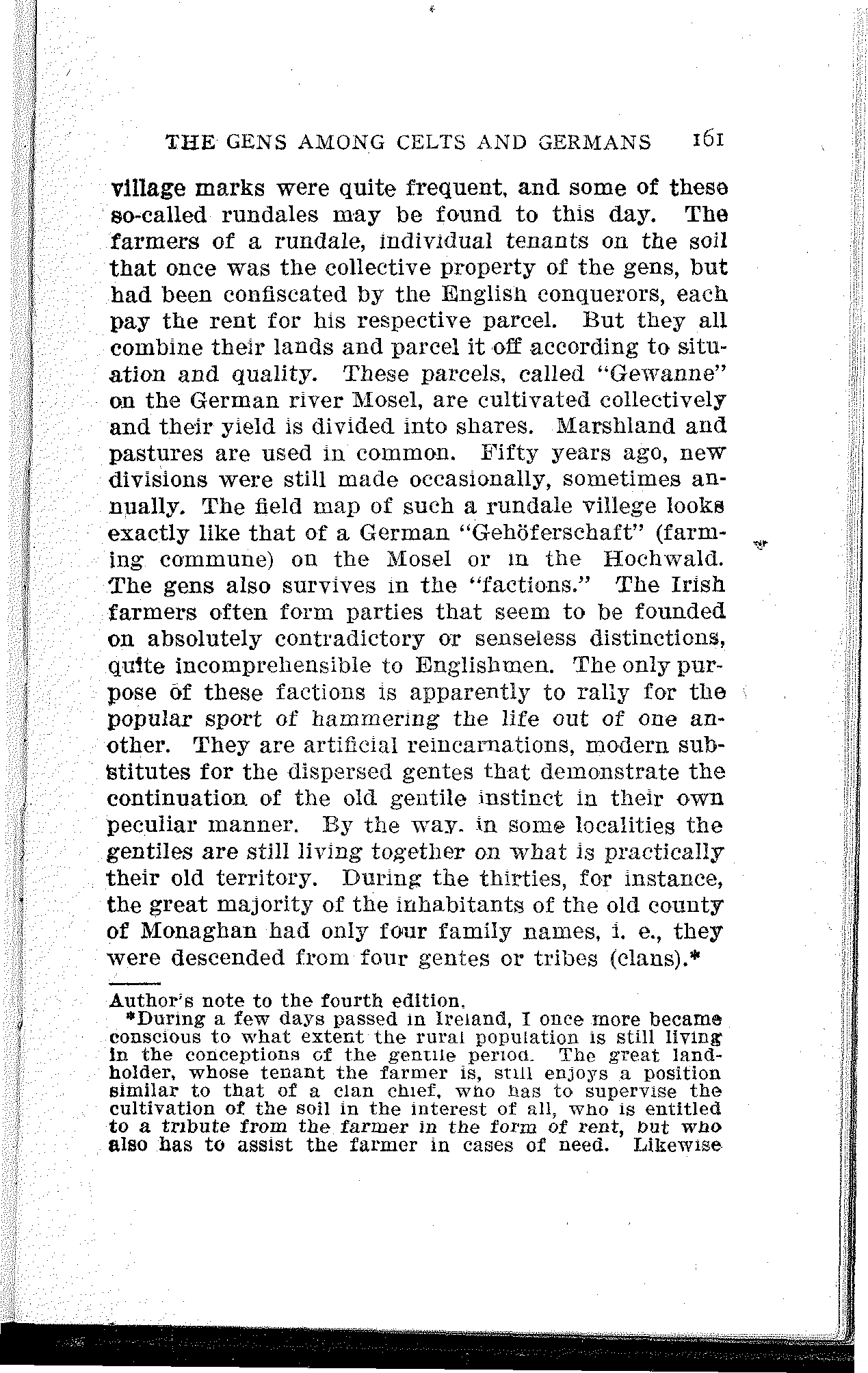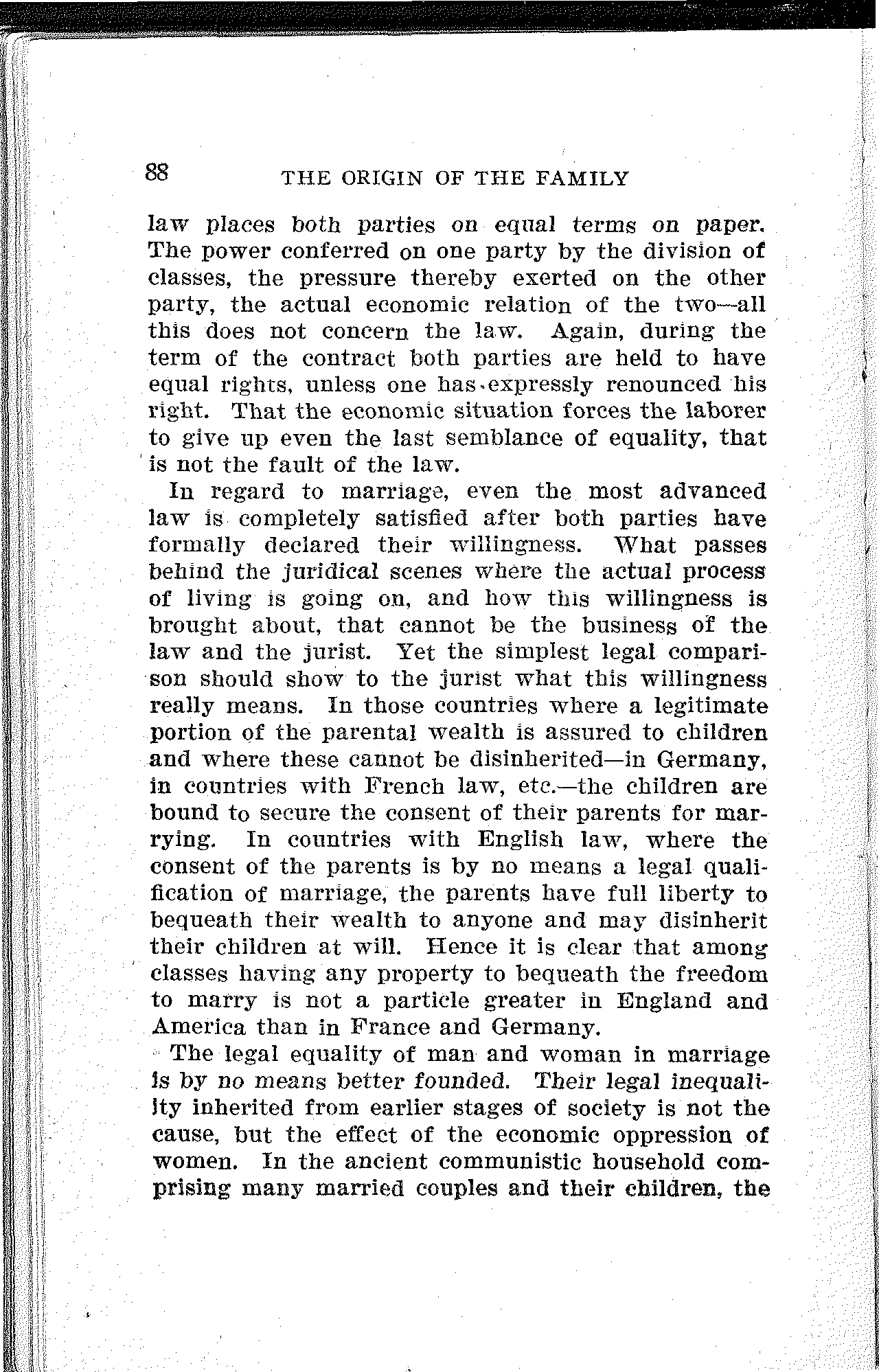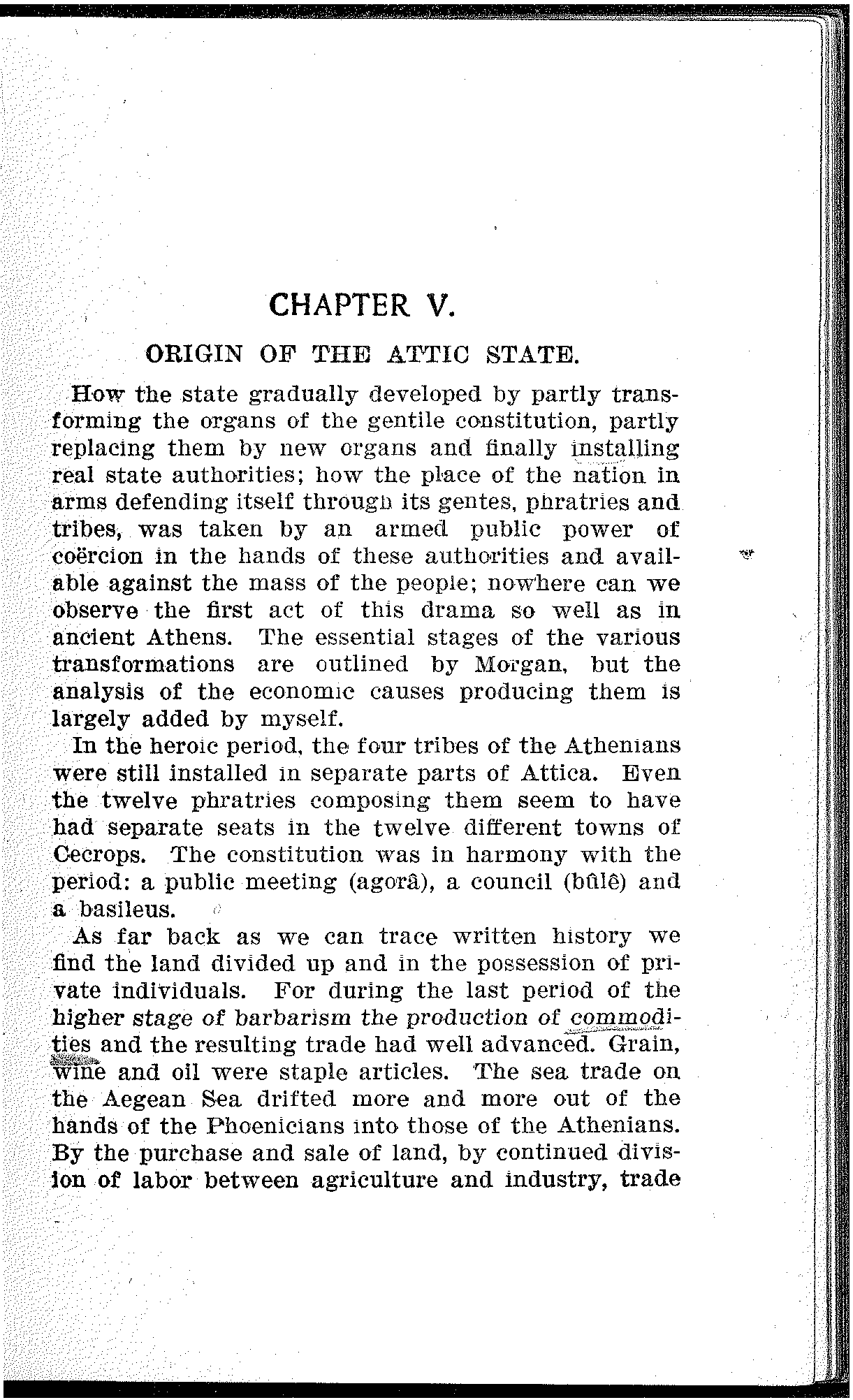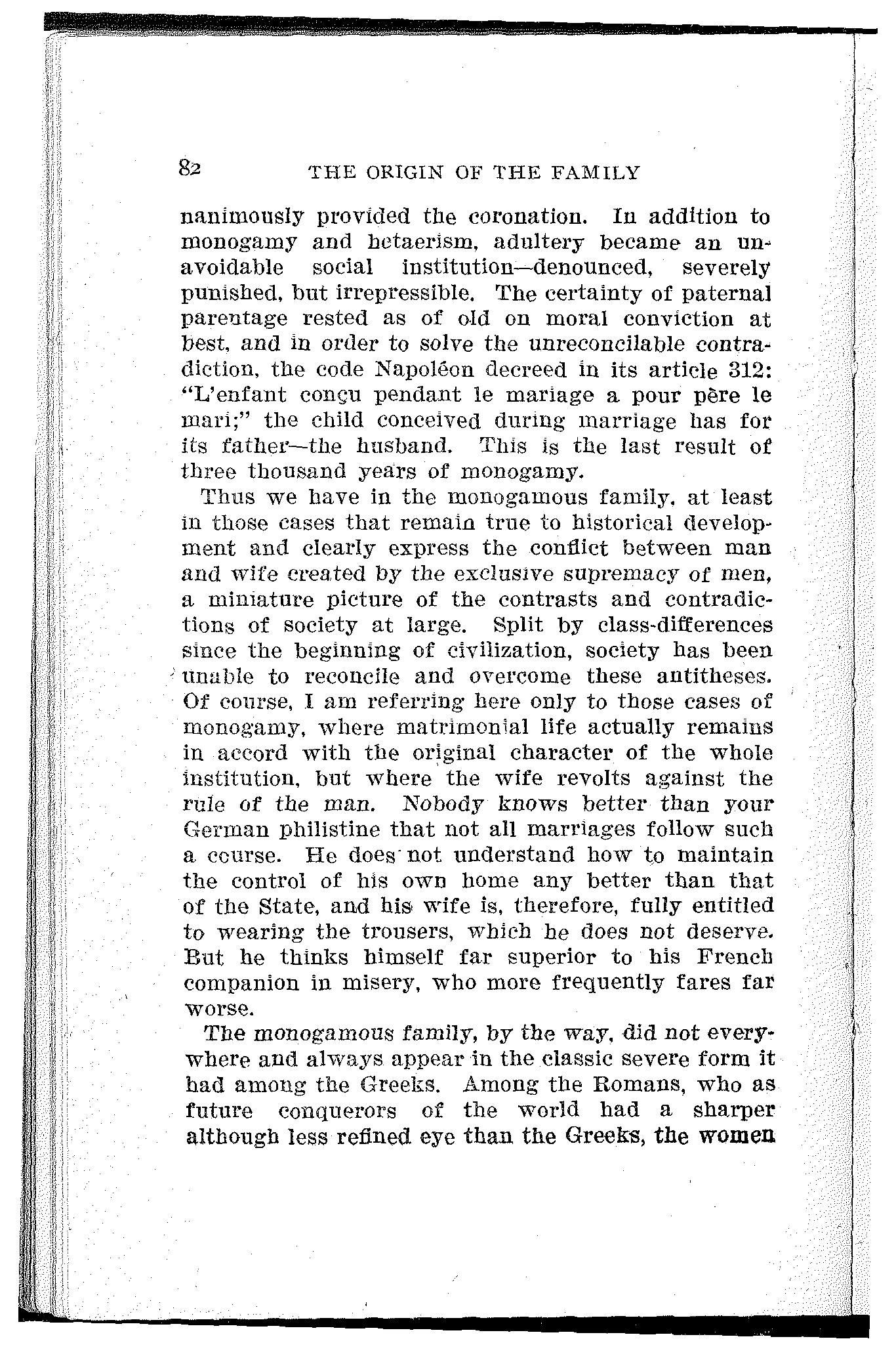My work has been translated into different languages. First into Italian; L'origine della famiglia, della proprietá privata e dello stato, versione riveduta dall' autore, di Pasquale Martignetti; Benevento, 1885.[13] Then into Roumanian: Origina familei, proprietatei private si a statului, traducere de Ivan Nadejde, in the Jassy periodical "Contemporanul," September, 1885, to May, 1886. Furthermore into Danish: Familjens, Privatejendommens og Statens Oprindelse, Dansk, af Forfatteren gennemgaaet Udgave, besörget af Gerson Trier, Kjoebenhavn, 1888. A French translation by Henri Ravé, founded on the present German edition, is under the press.