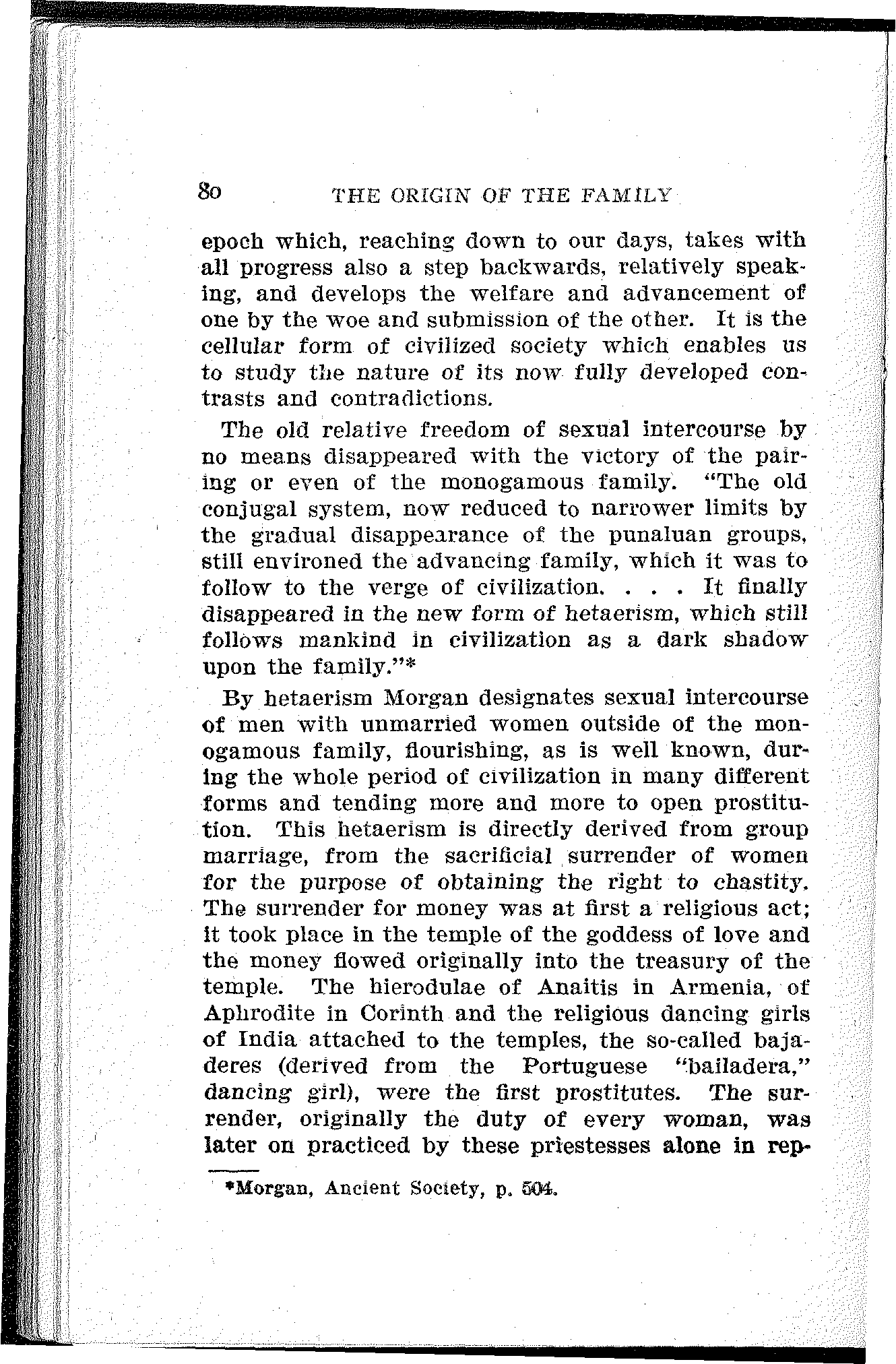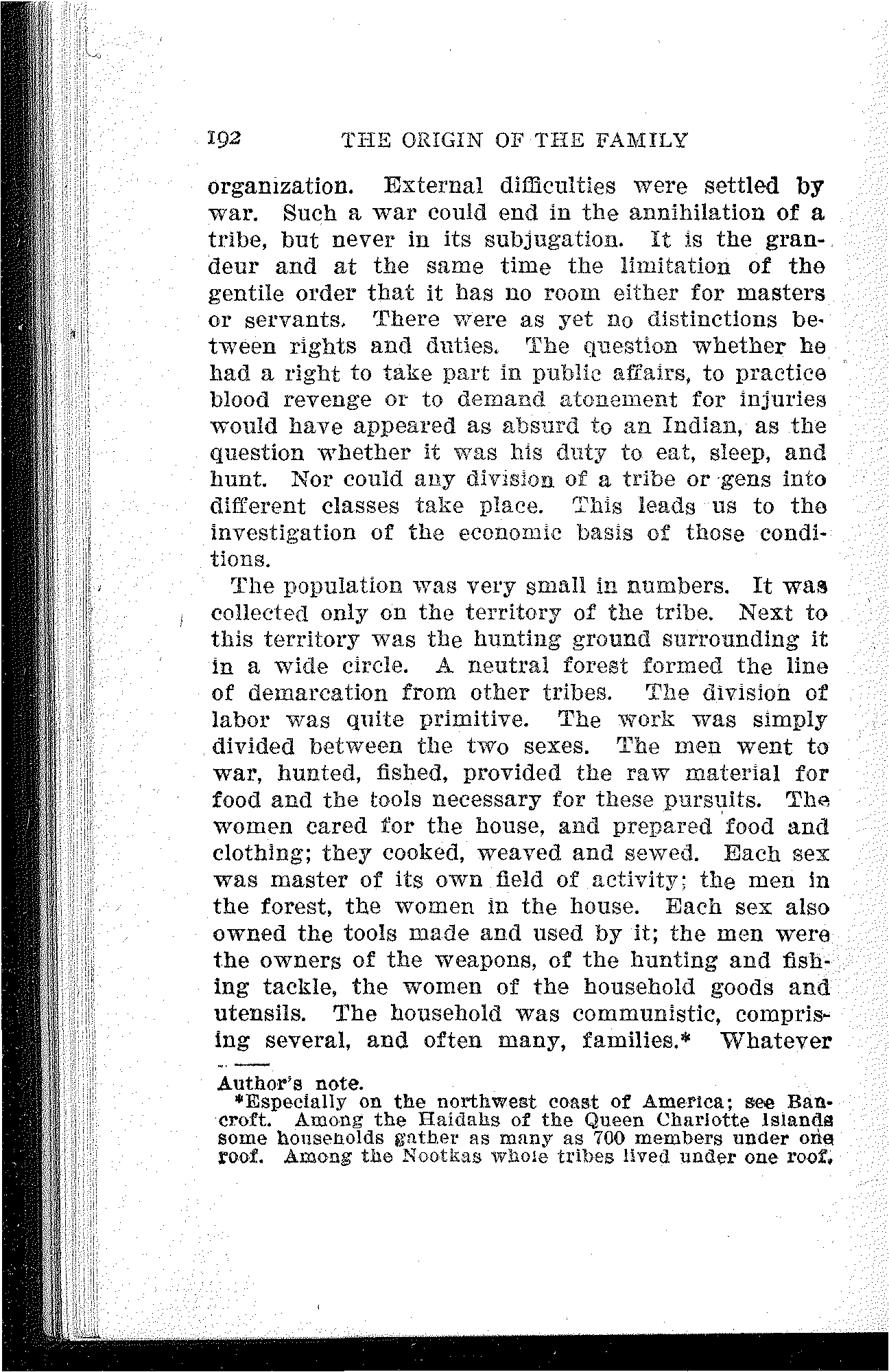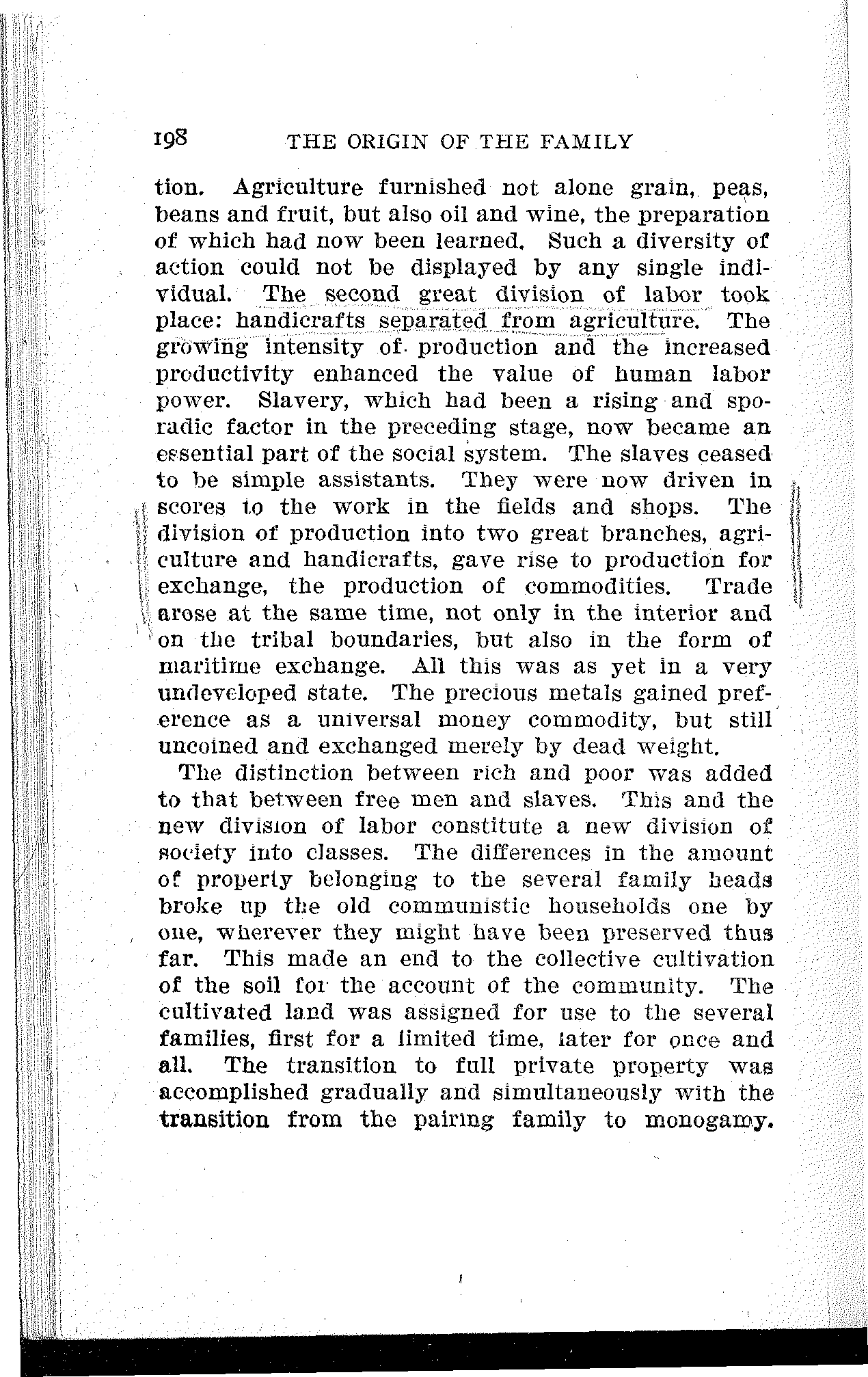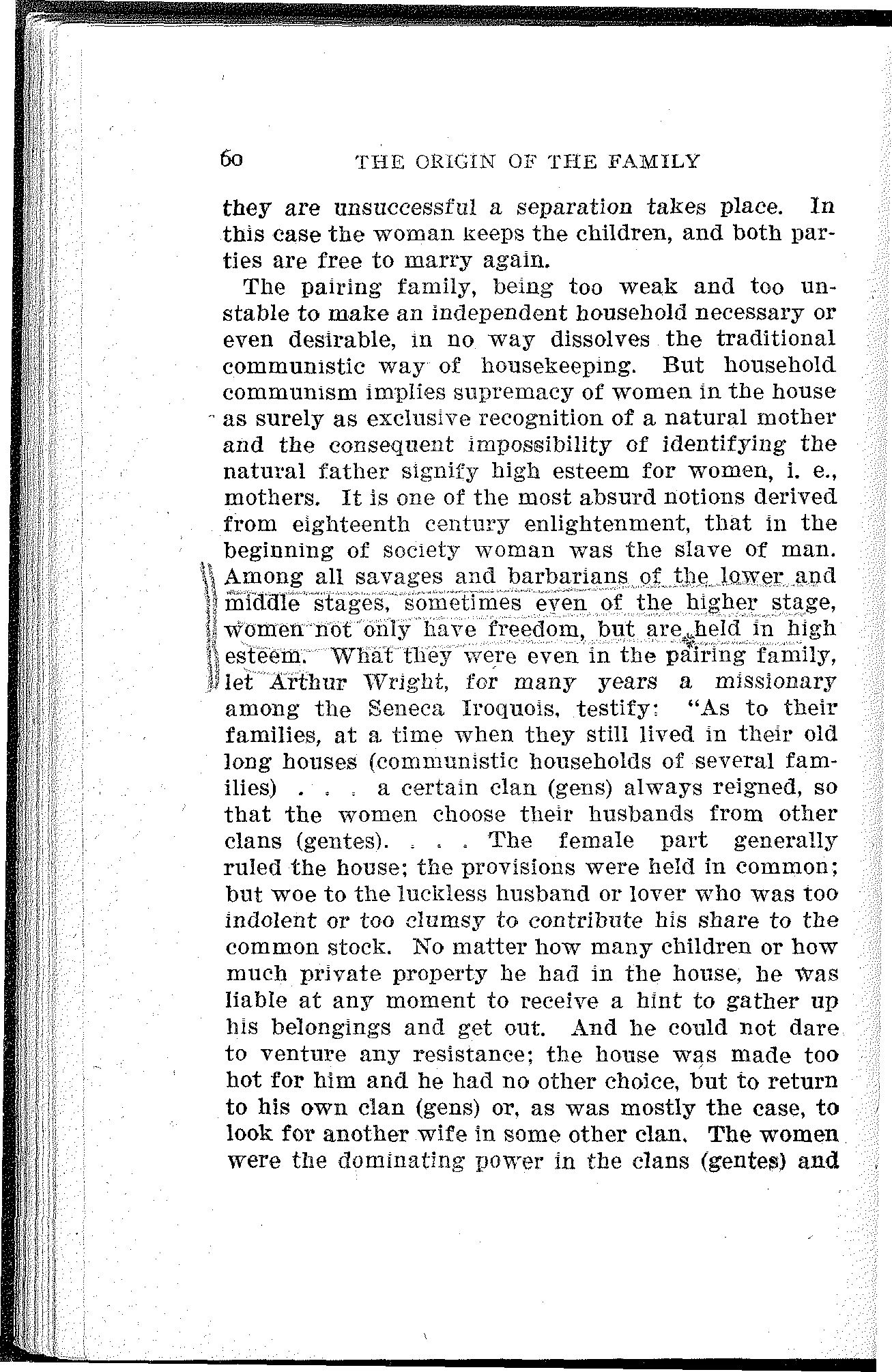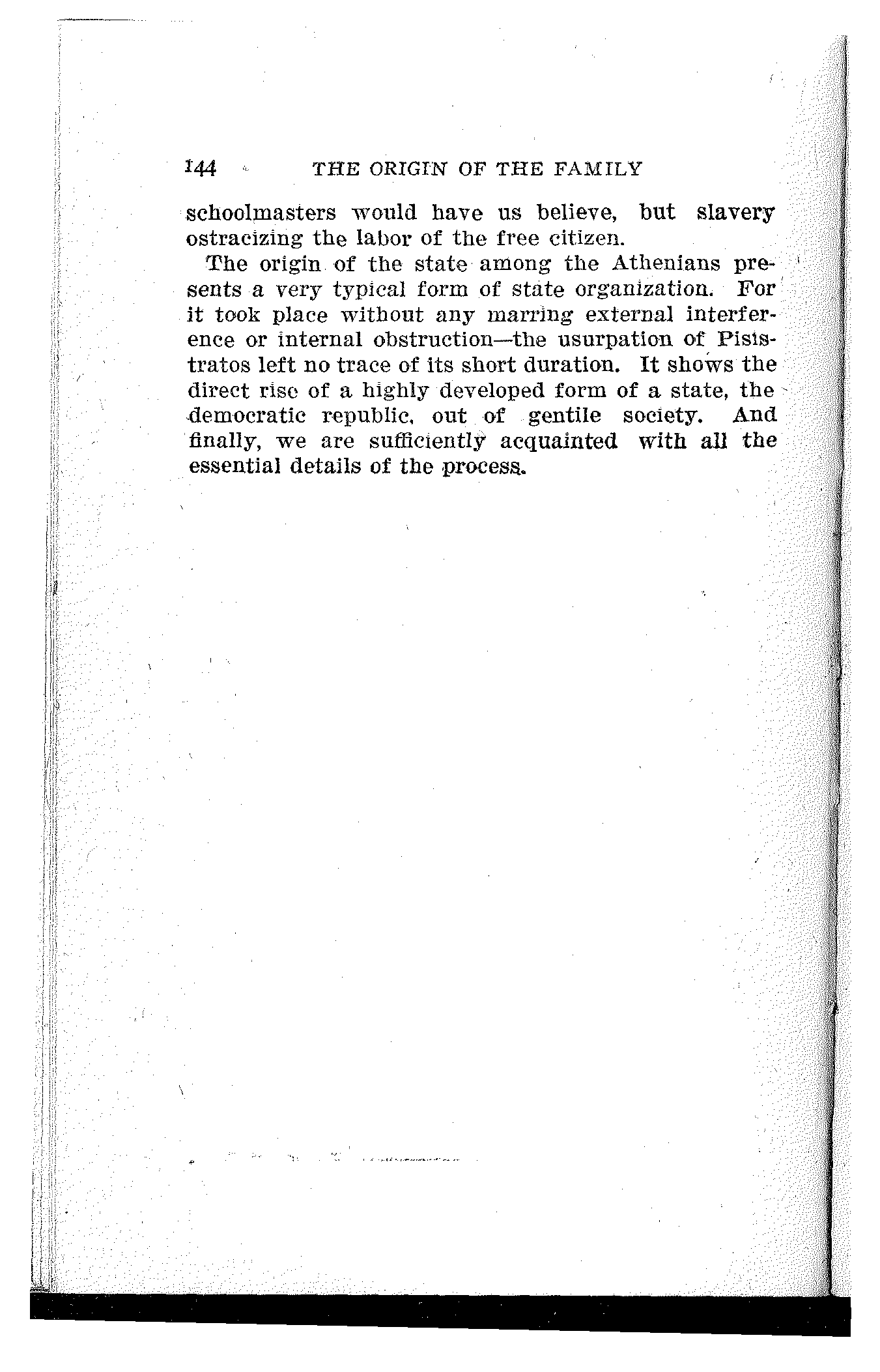 My work has been translated into different languages. First into Italian; L'origine della famiglia, della proprietá privata e dello stato, versione riveduta dall' autore, di Pasquale Martignetti; Benevento, 1885.[13] Then into Roumanian: Origina familei, proprietatei private si a statului, traducere de Ivan Nadejde, in the Jassy periodical "Contemporanul," September, 1885, to May, 1886. Furthermore into Danish: Familjens, Privatejendommens og Statens Oprindelse, Dansk, af Forfatteren gennemgaaet Udgave, besörget af Gerson Trier, Kjoebenhavn, 1888. A French translation by Henri Ravé, founded on the present German edition, is under the press.