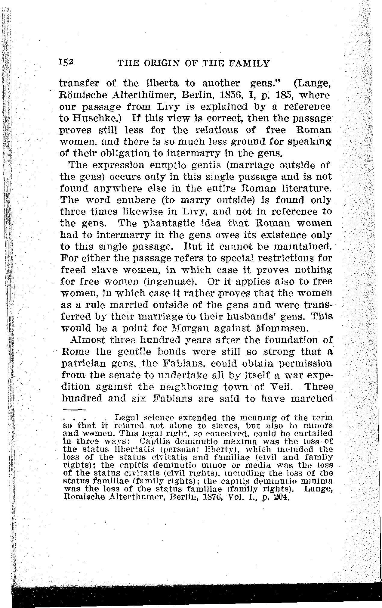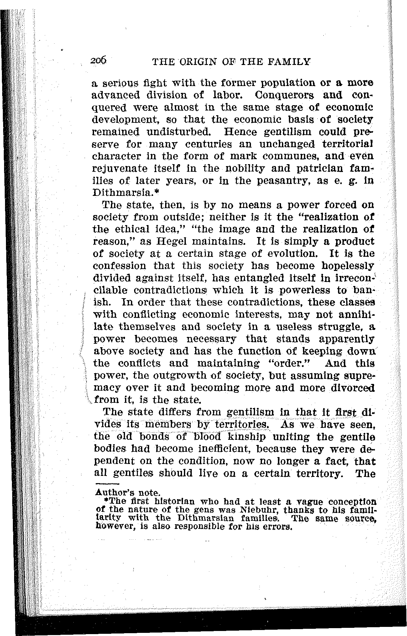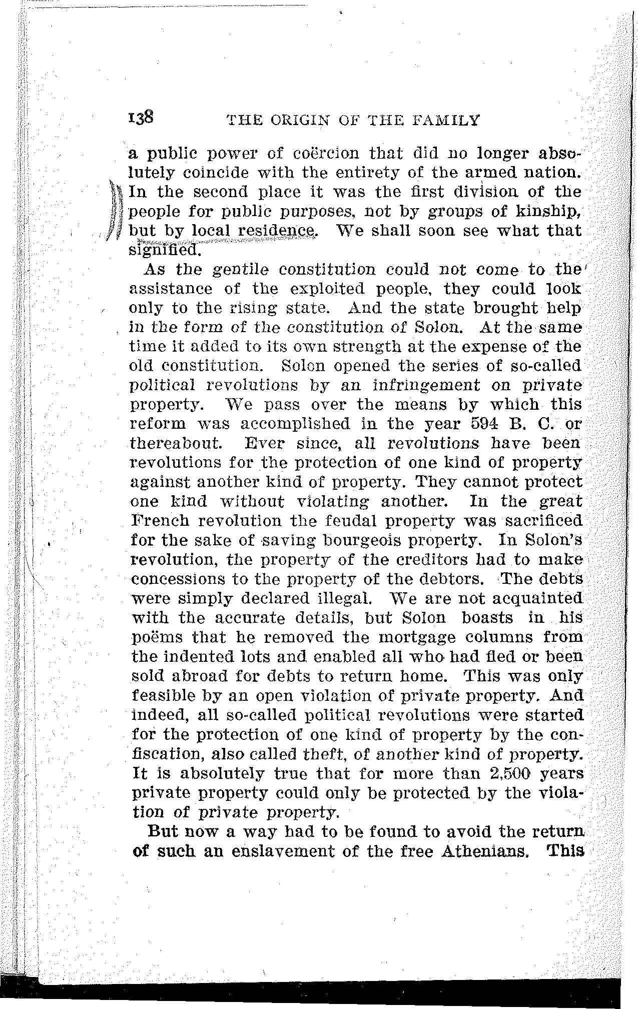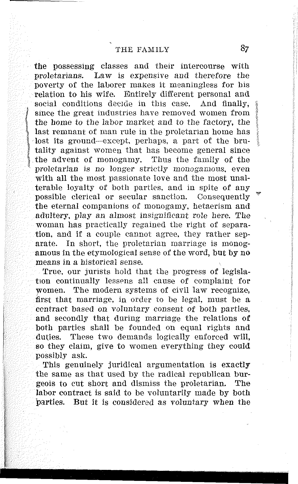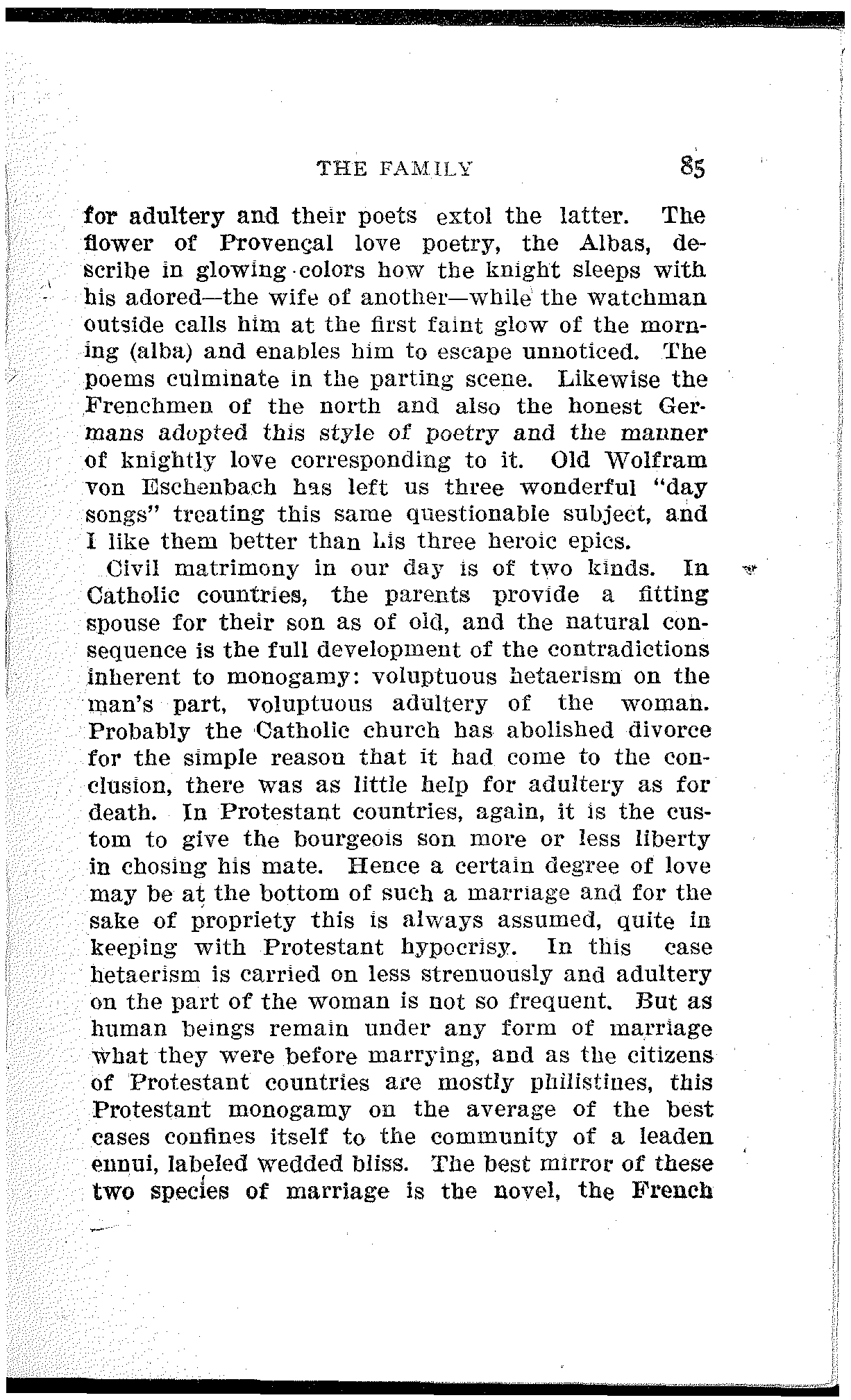 My work has been translated into different languages. First into Italian; L'origine della famiglia, della proprietá privata e dello stato, versione riveduta dall' autore, di Pasquale Martignetti; Benevento, 1885.[13] Then into Roumanian: Origina familei, proprietatei private si a statului, traducere de Ivan Nadejde, in the Jassy periodical "Contemporanul," September, 1885, to May, 1886. Furthermore into Danish: Familjens, Privatejendommens og Statens Oprindelse, Dansk, af Forfatteren gennemgaaet Udgave, besörget af Gerson Trier, Kjoebenhavn, 1888. A French translation by Henri Ravé, founded on the present German edition, is under the press.